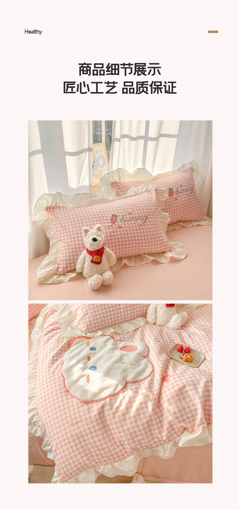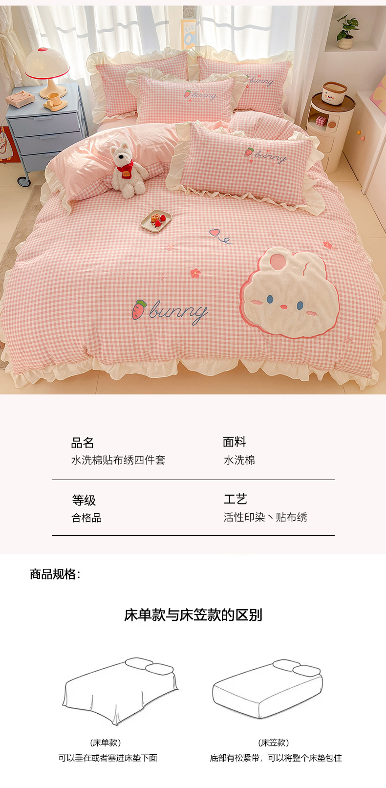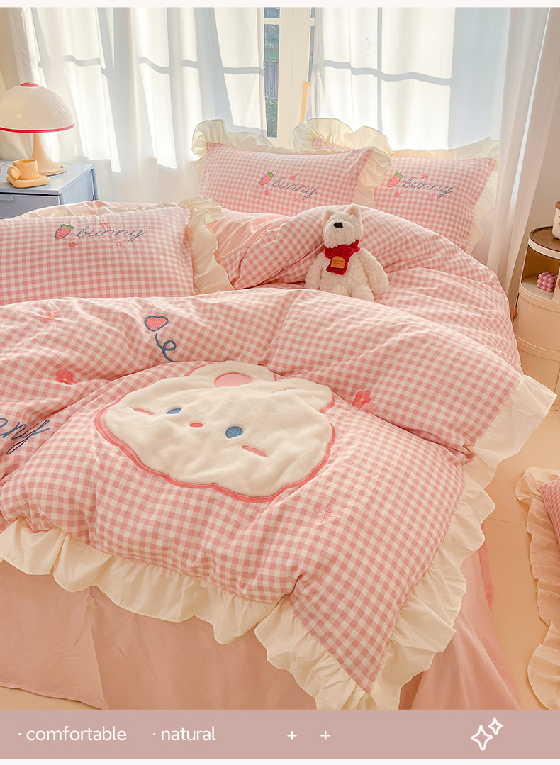 当前位置: 91家纺网 > 商品网购 > 床品套件 > 四件套 > 水洗棉四件套 > 我心家纺 2025新款水洗棉花边贴布绣四件套 花花兔-粉格