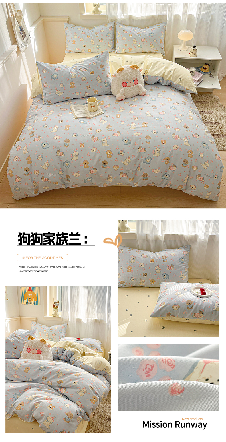 当前位置: 91家纺网 > 商品网购 > 床品套件 > 四件套 > 全棉普通四件套 > 西引力 2025开春新款全棉印花四件套单被套系列 狗狗家族兰