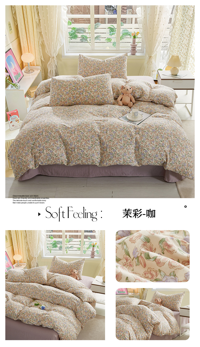 棉小二 2025新款双层纱印花系列四件套 茉彩-咖