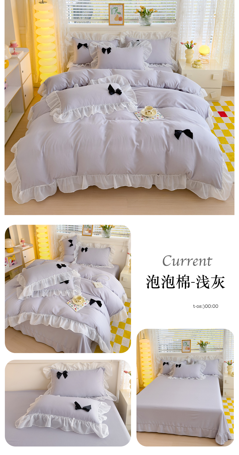 (买家秀 爆款花型不断货)A类母婴级少女风韩式公主风泡泡纱床上四件套韩式泡泡棉花边四件套水洗棉四件套 泡泡棉-浅灰