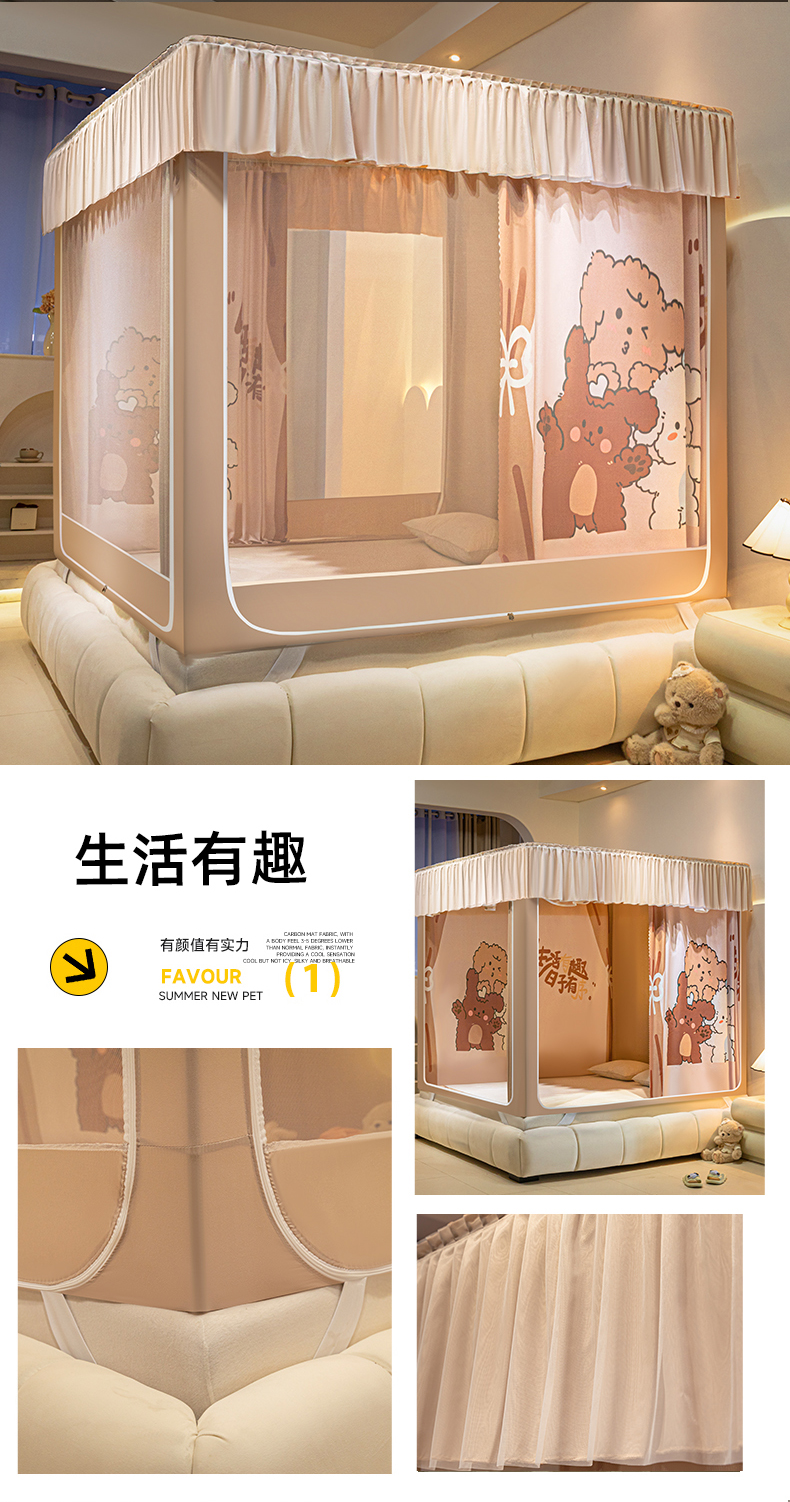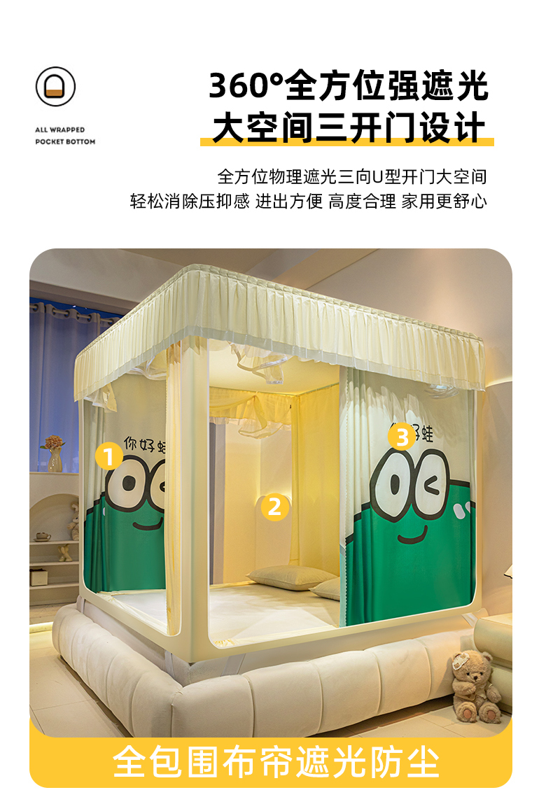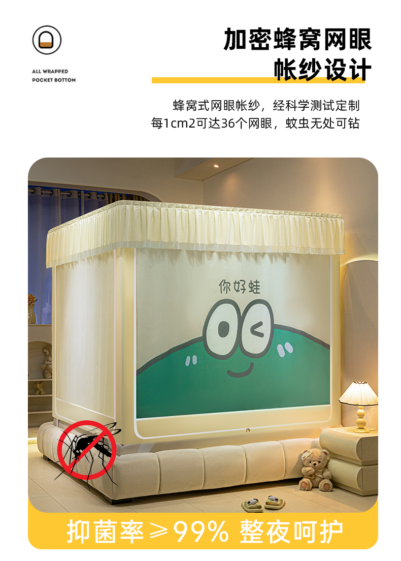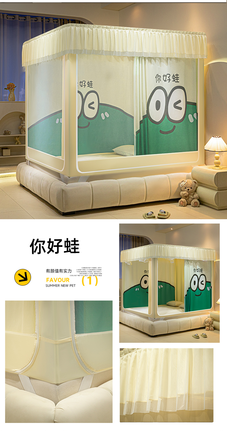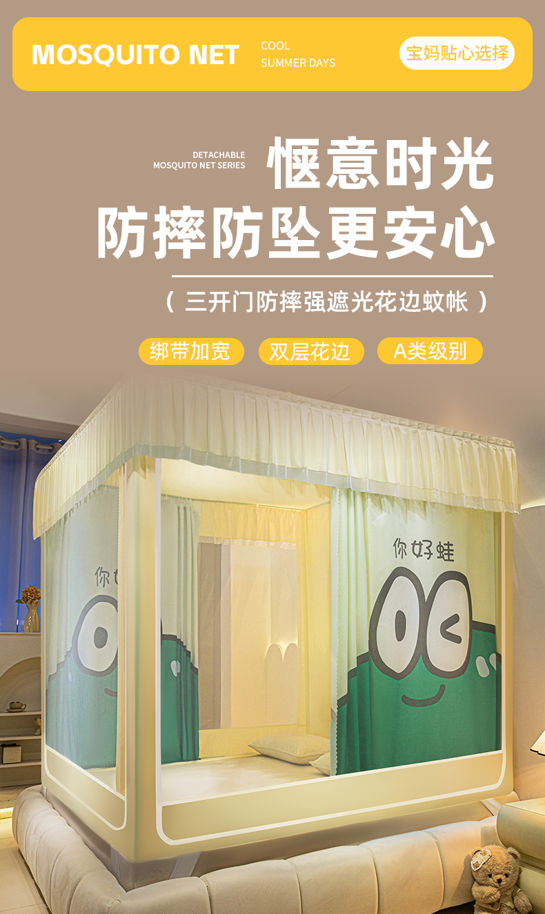 (总)飞轮海蚊帐 2025新款三开门方顶花边防摔遮光蚊帐-Z39,你好蛙,不许动,快乐家族,生活有趣,熊猫宝
