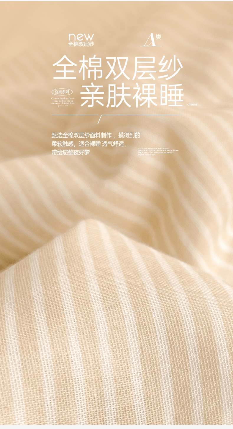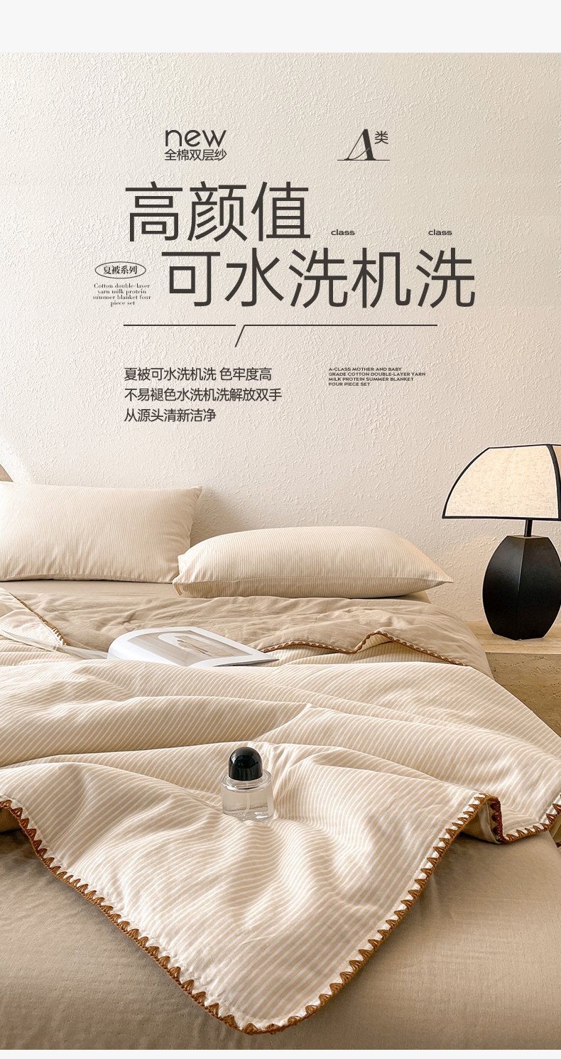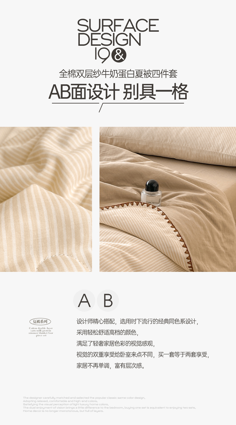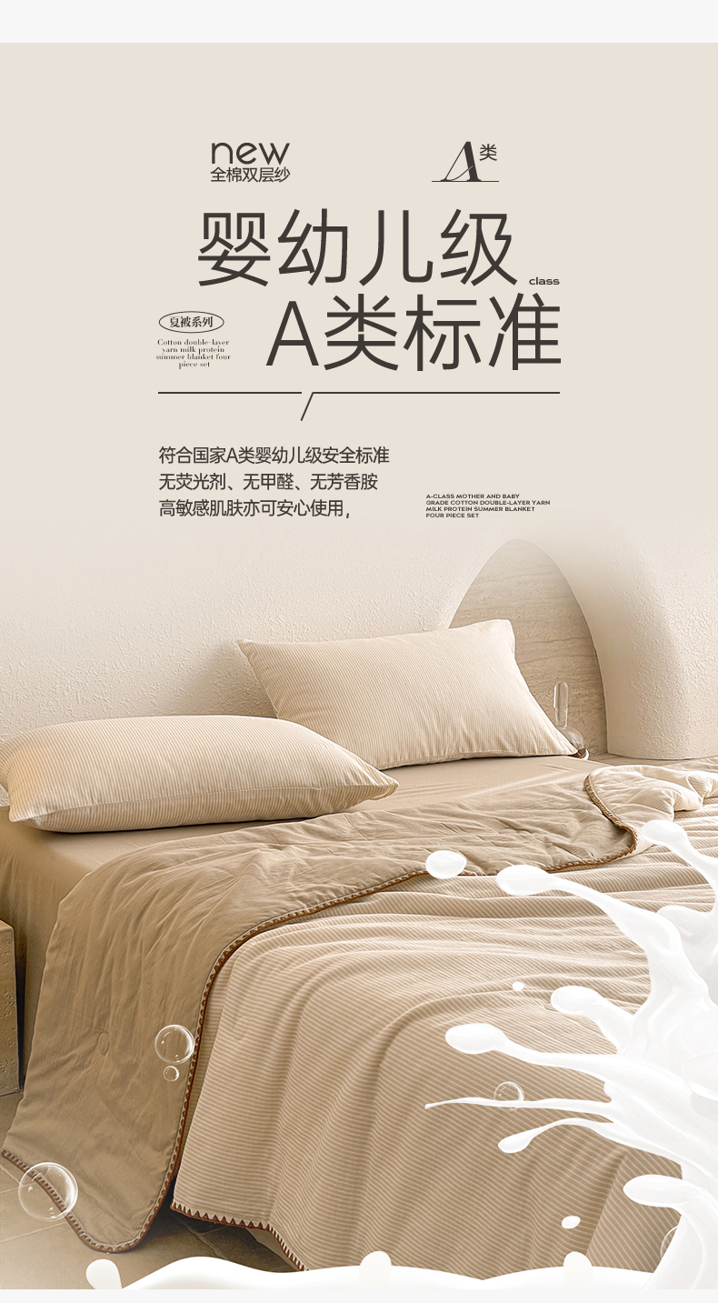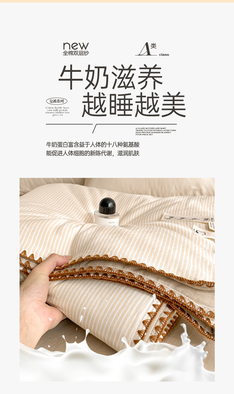 • 91家纺网 家纺一手货源 找家纺 一加一 2025新款A类母婴级全棉双层纱牛奶蛋白夏被四件套 咖细条