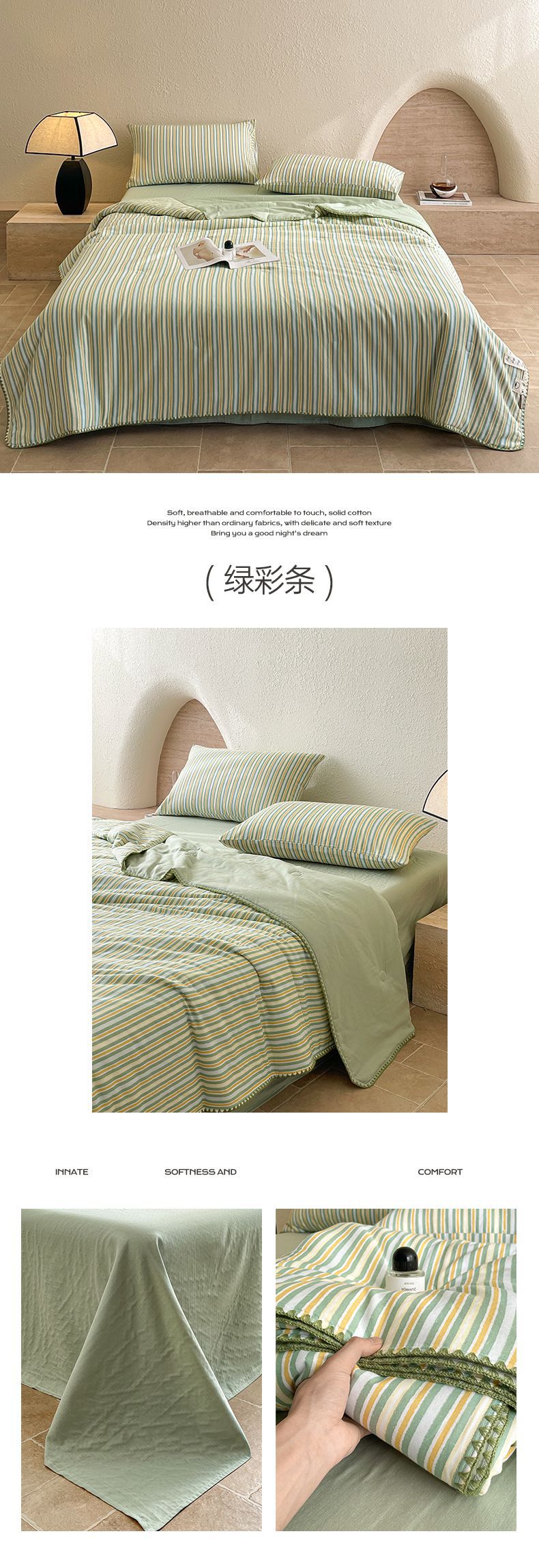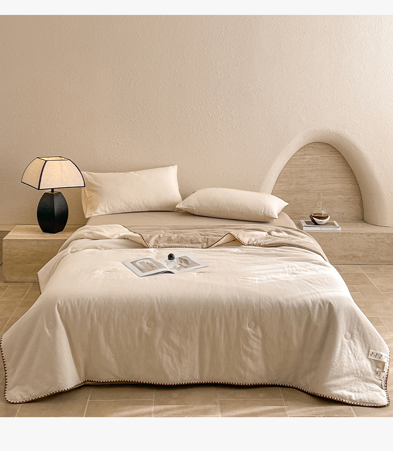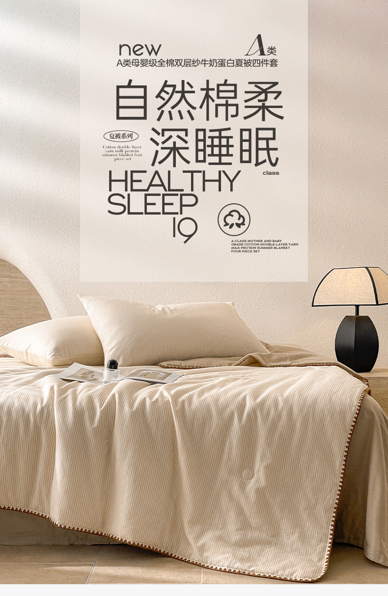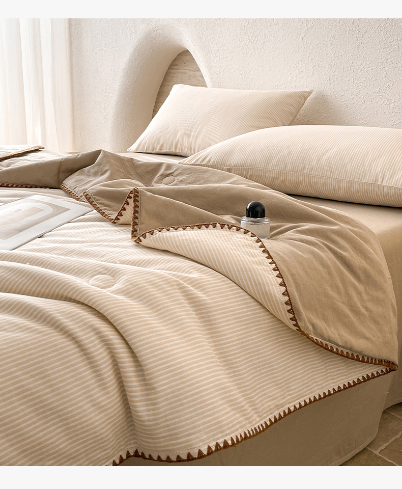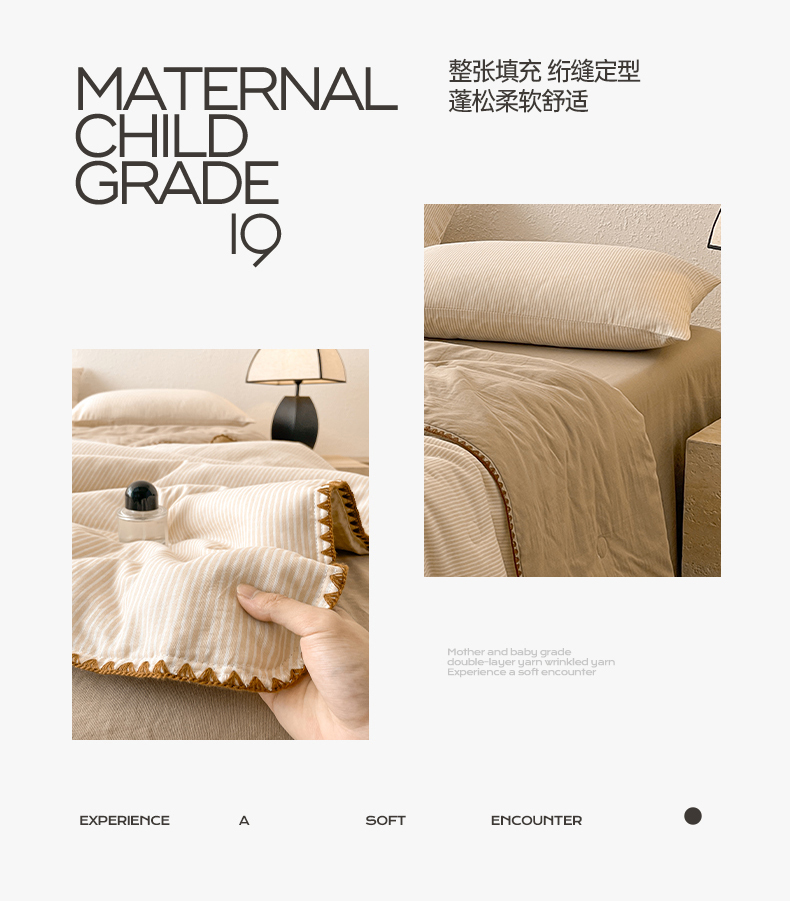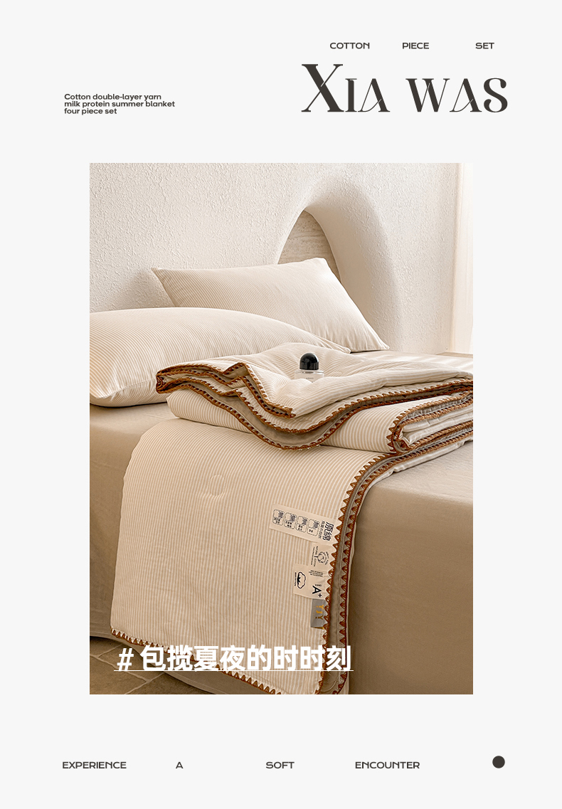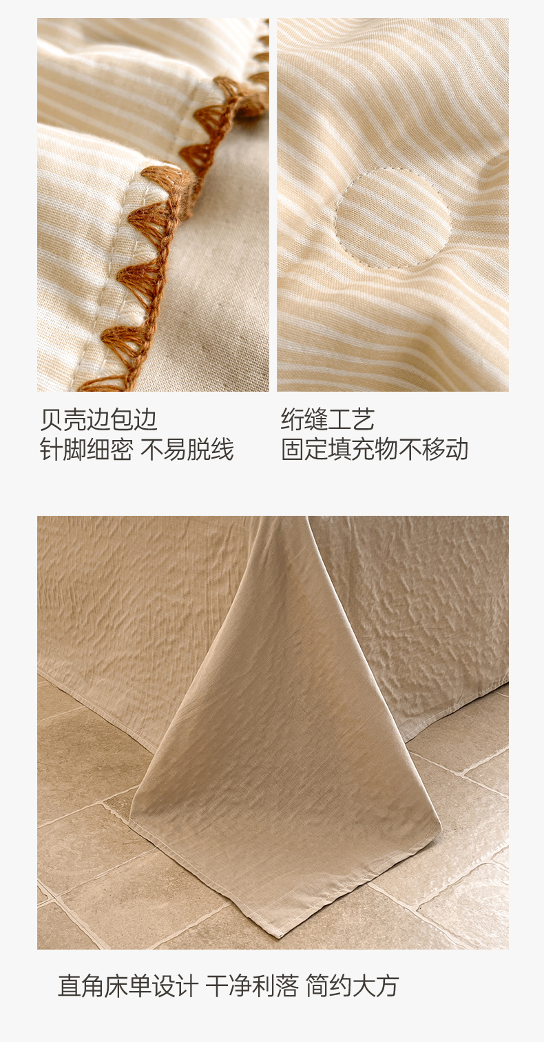 • 91家纺网 家纺一手货源 找家纺 一加一 2025新款A类母婴级全棉双层纱牛奶蛋白夏被四件套 咖细条