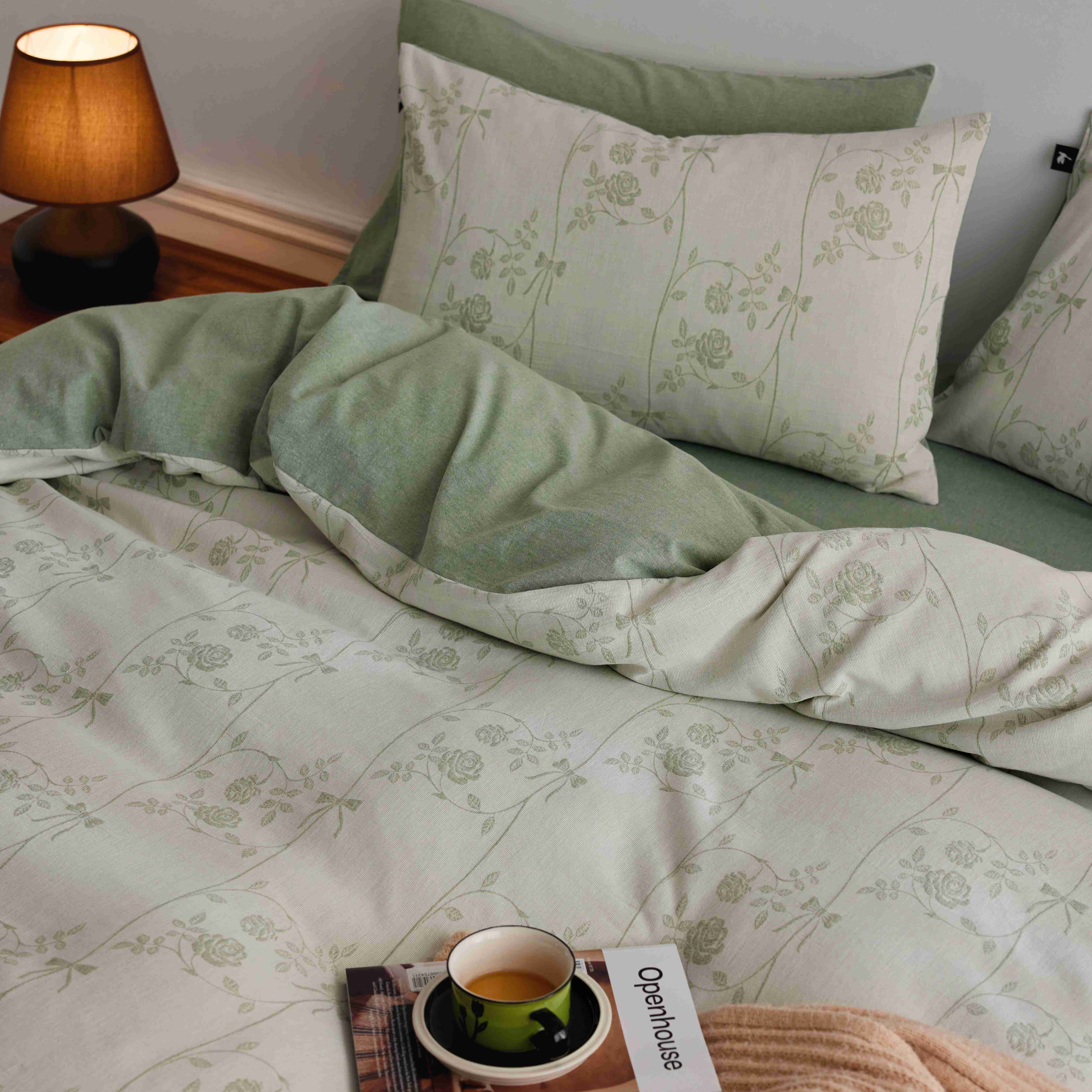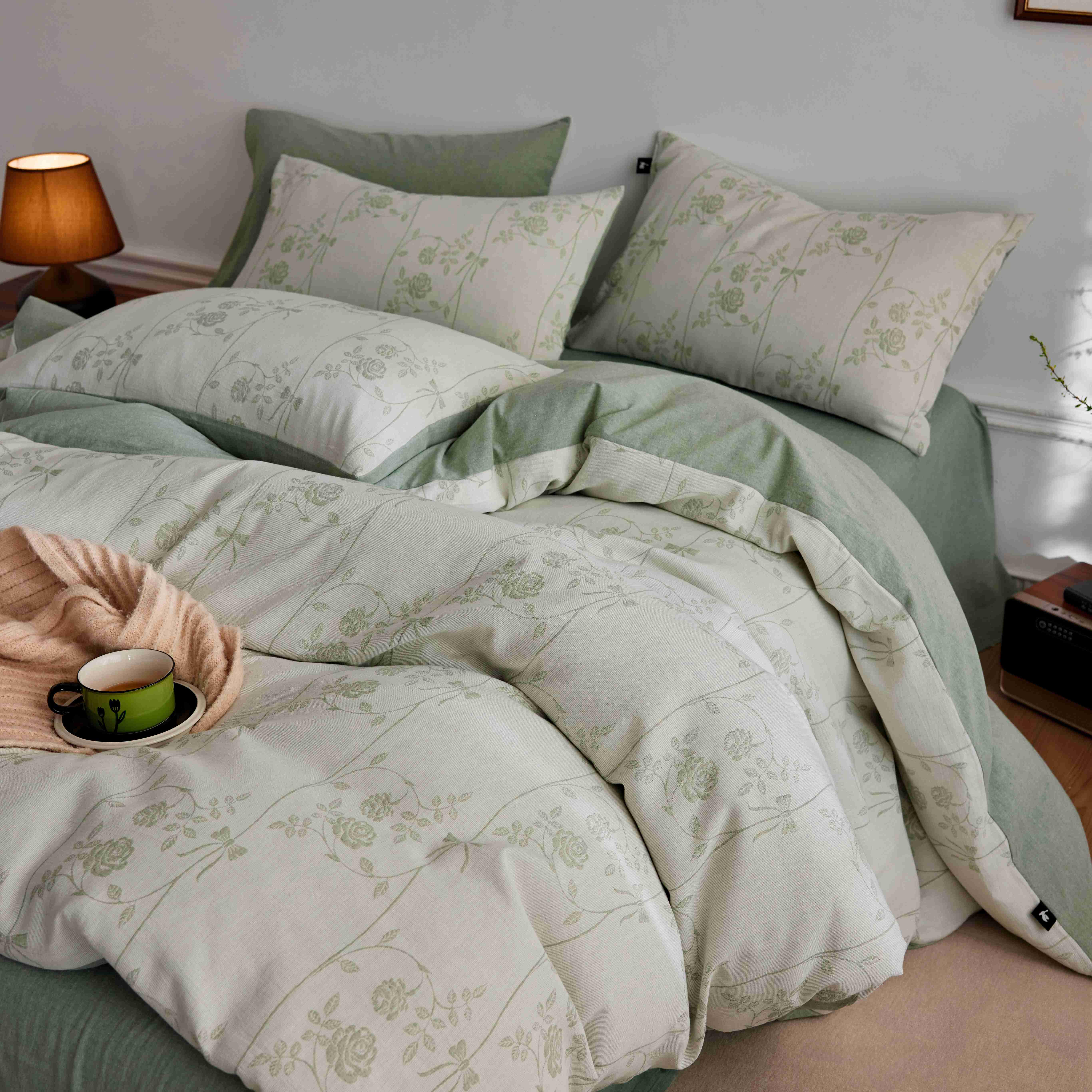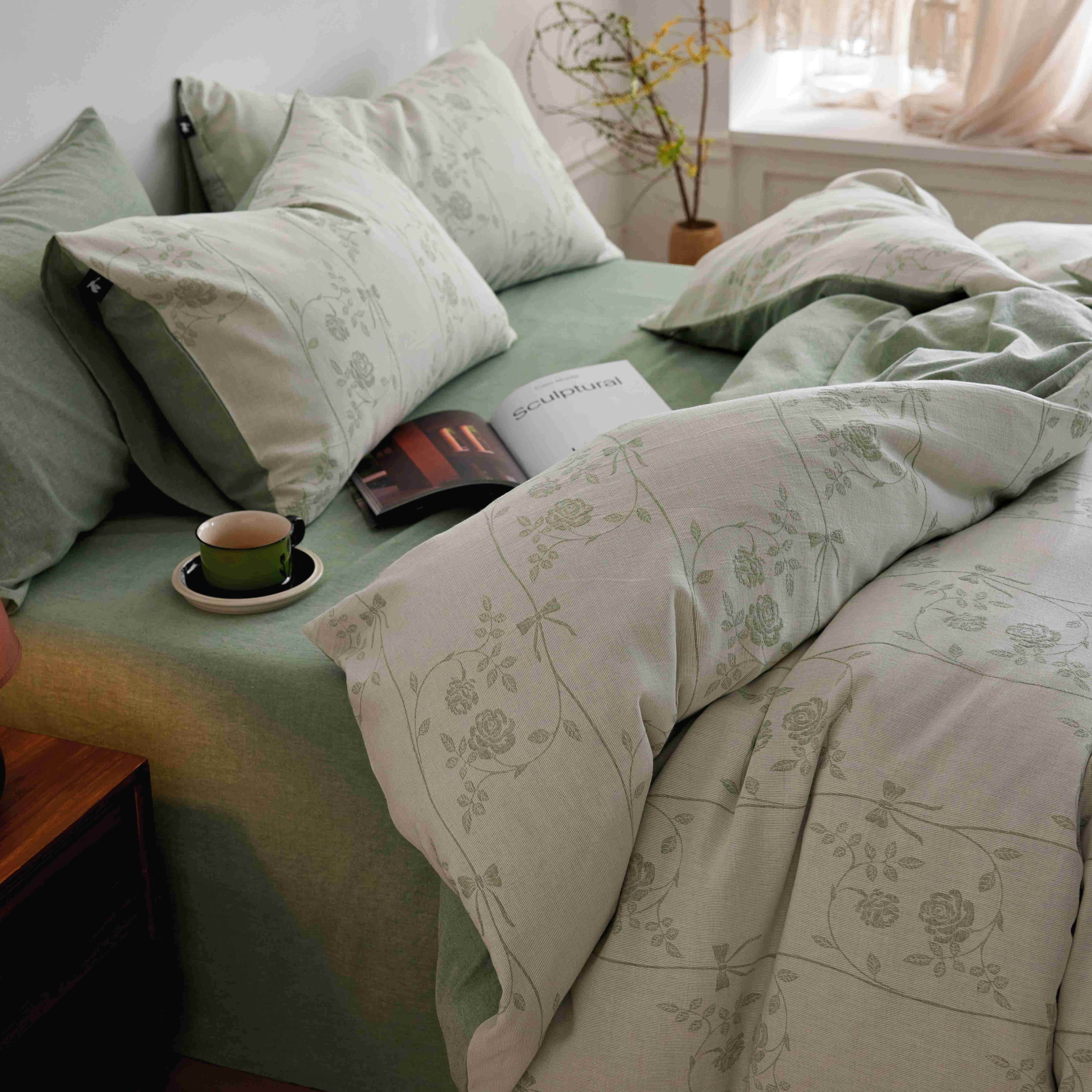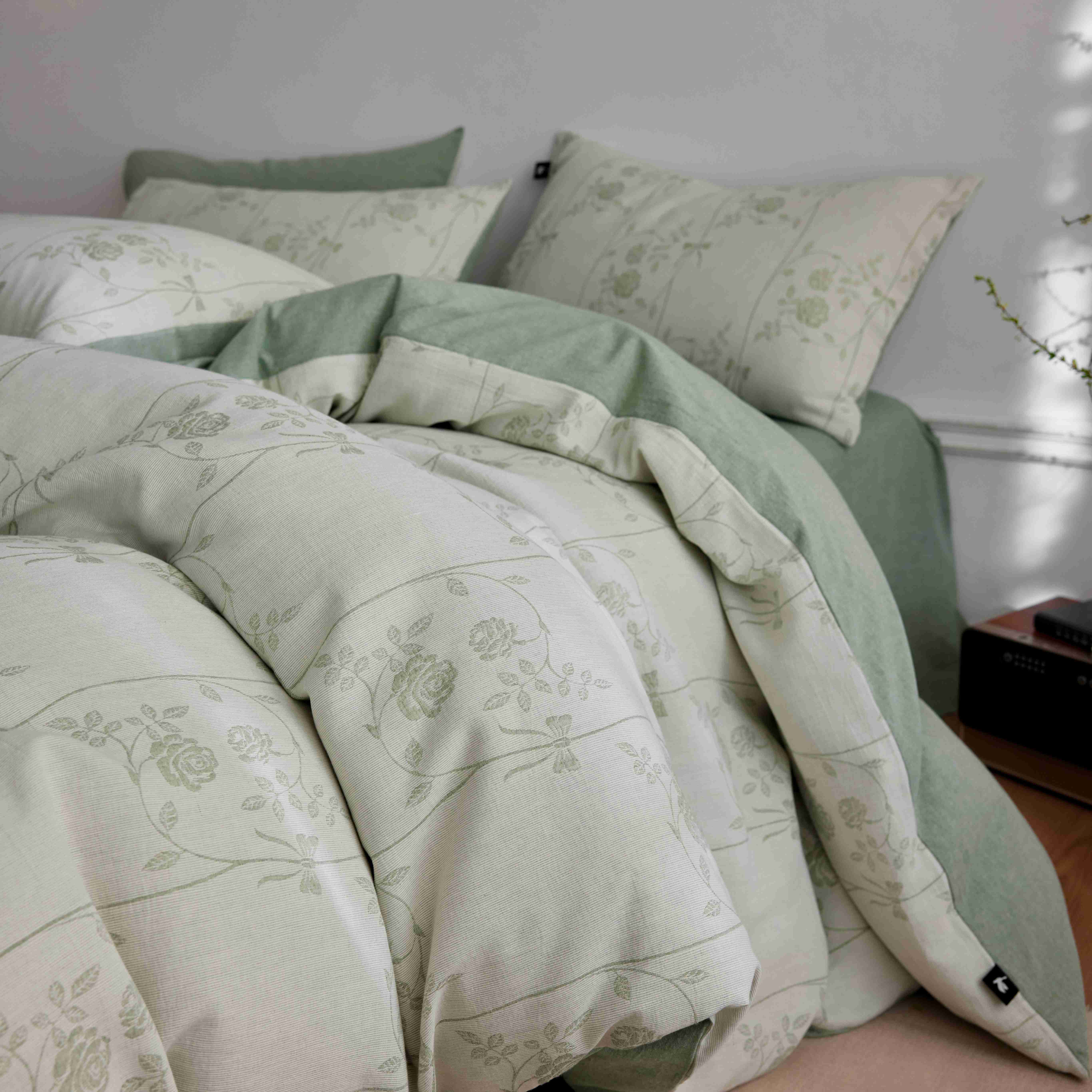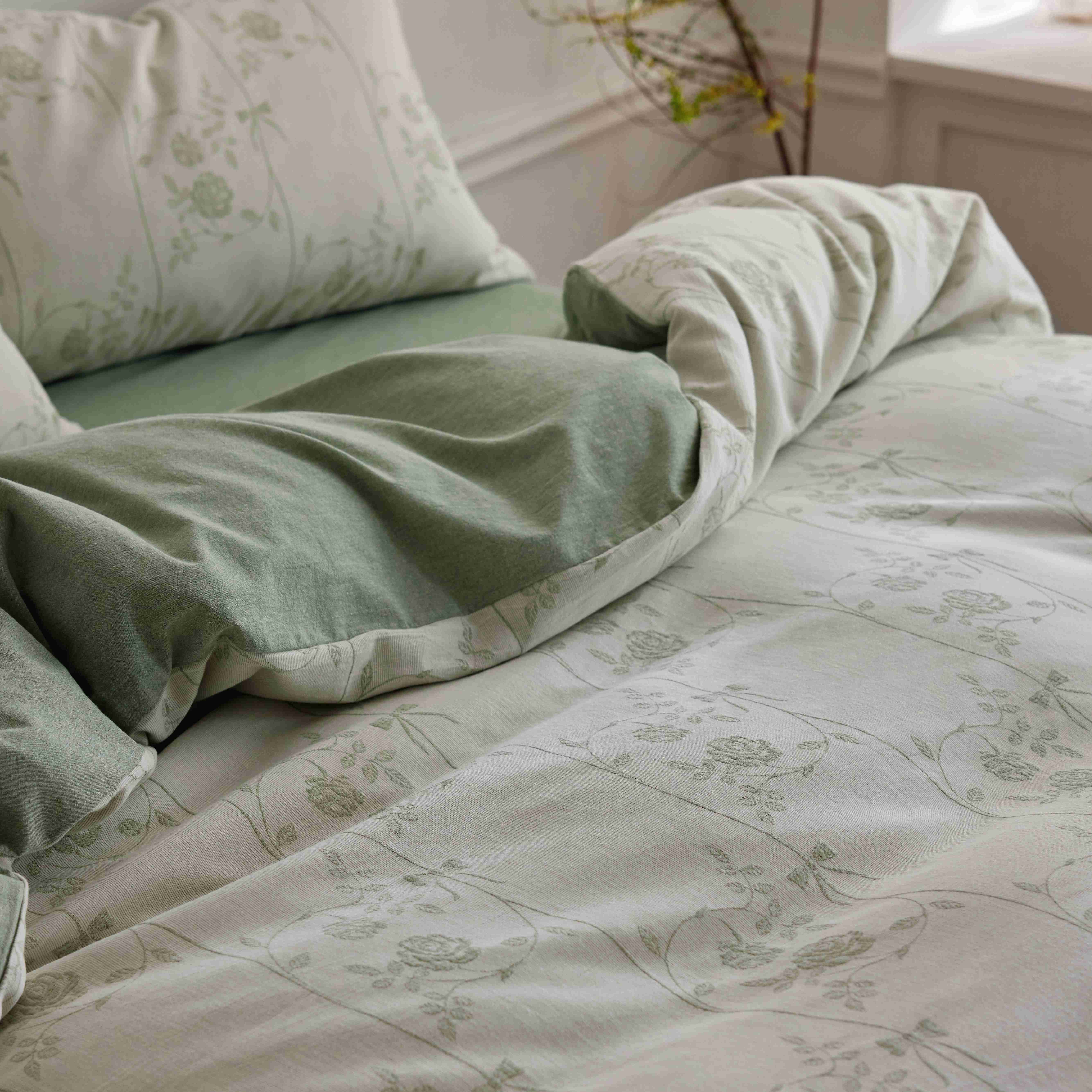 商品名称:安莱生活 2025新款60s双层纱色织大提花枝上玫瑰四件套系列 枝上玫瑰-草绿