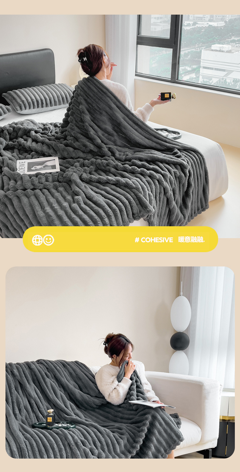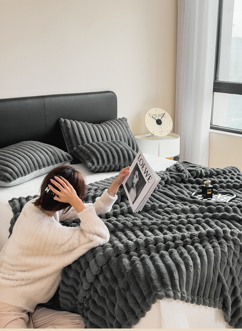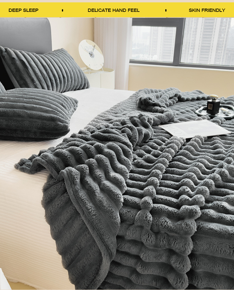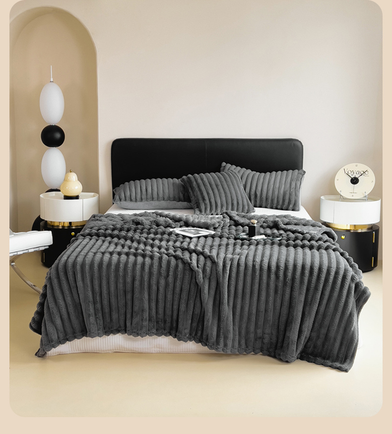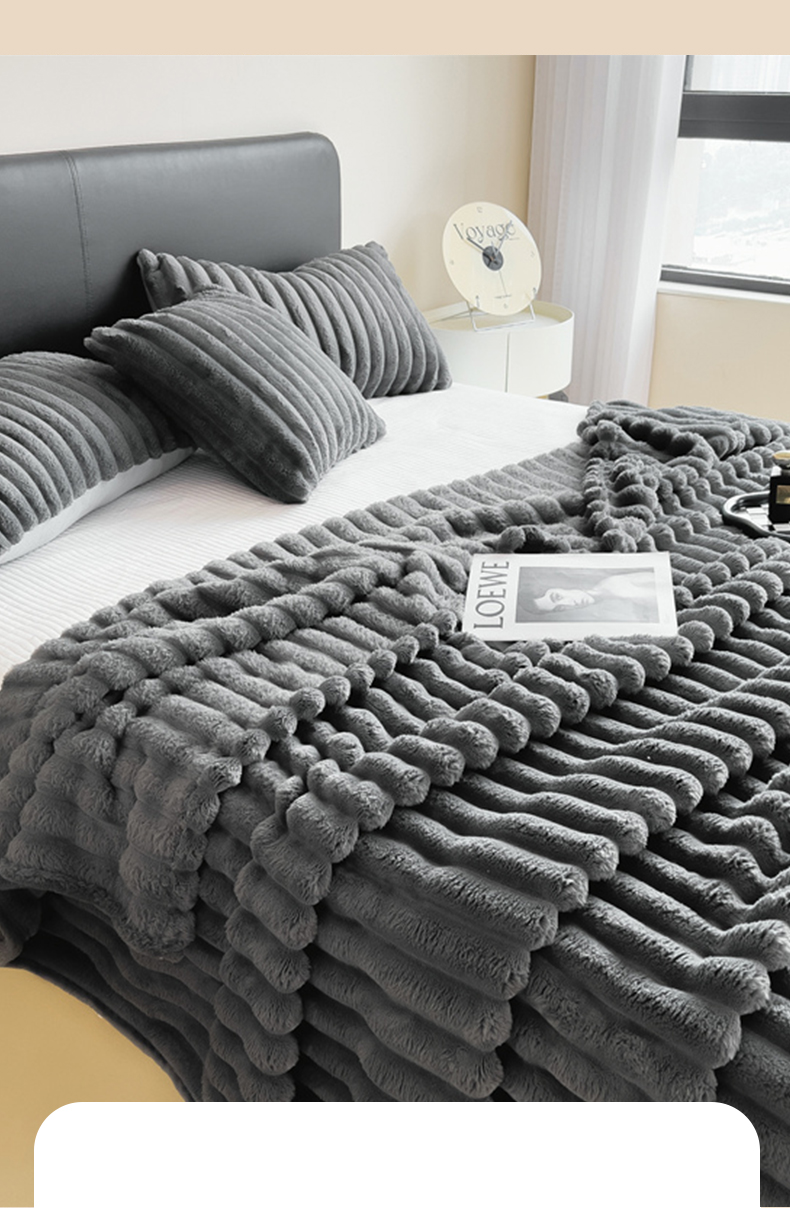 商品名称:一帆毯业 跨境外贸2025新款仿兔毛宽抽条牛奶绒盖毯 抽条深灰