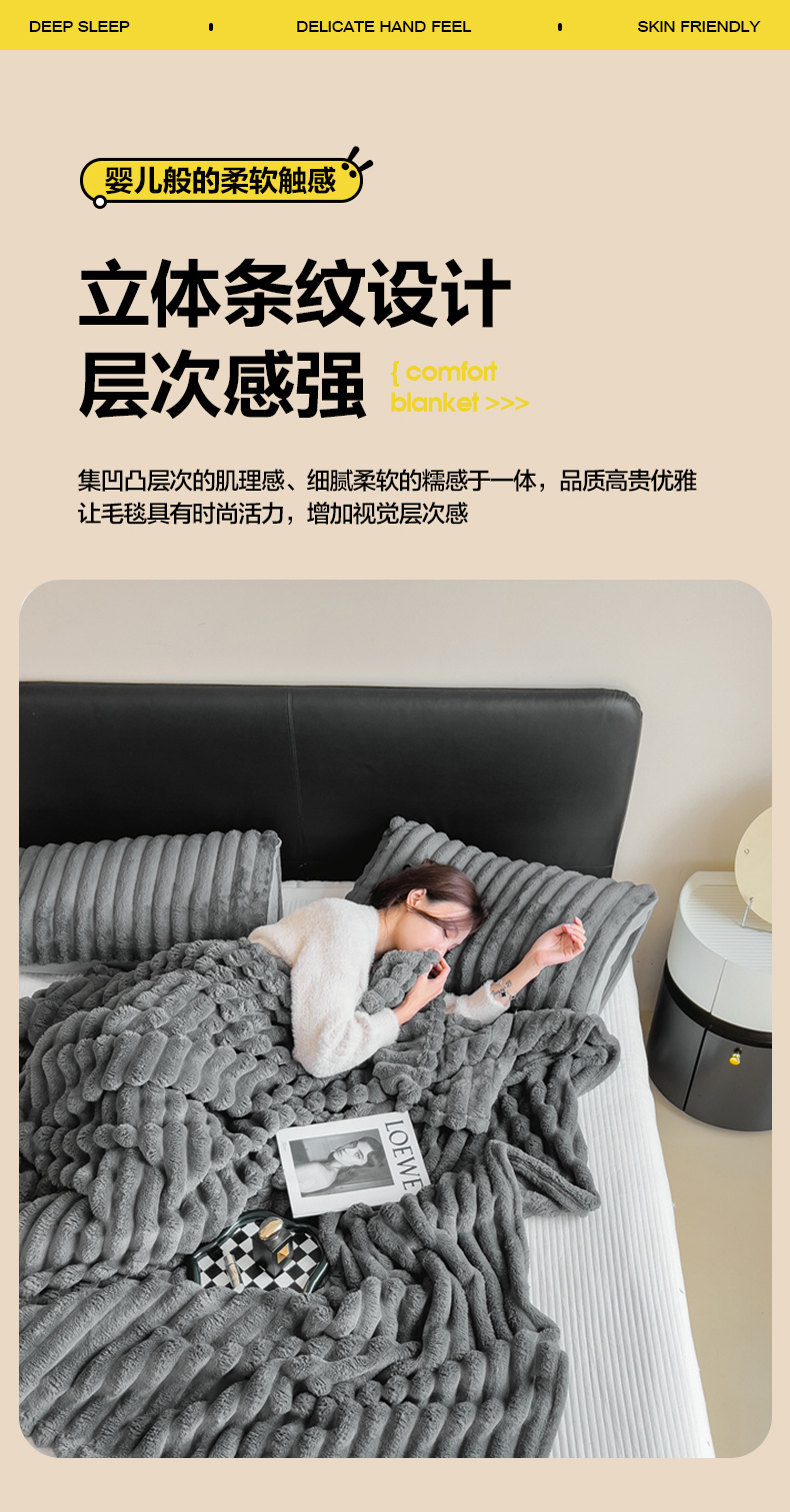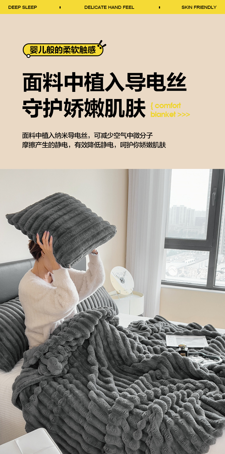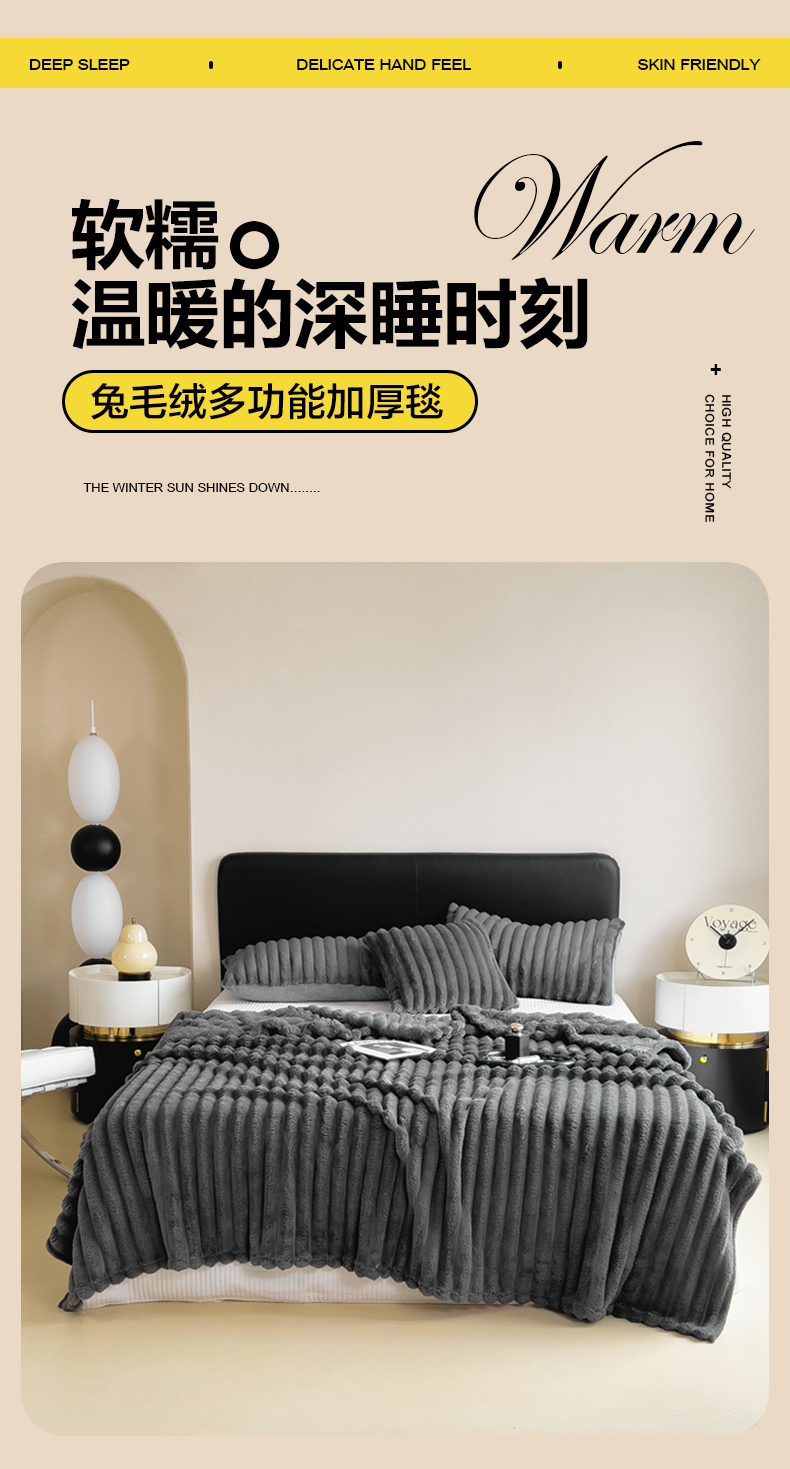 商品名称:一帆毯业 跨境外贸2025新款仿兔毛宽抽条牛奶绒盖毯 抽条深灰