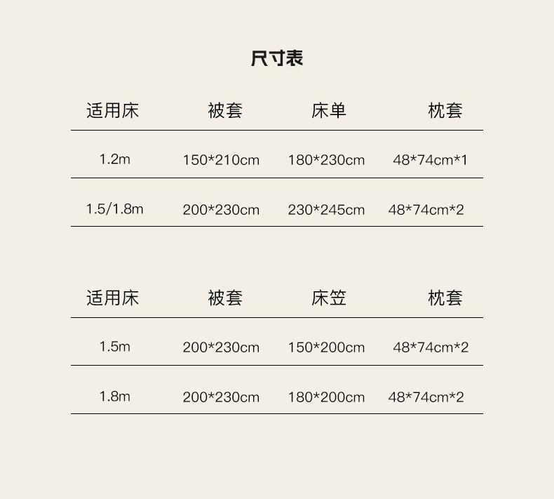 1.5米床笠款四件套:被套200*230cm 床笠150*200cm 枕套48*74cm*2 | ¥95.00 |