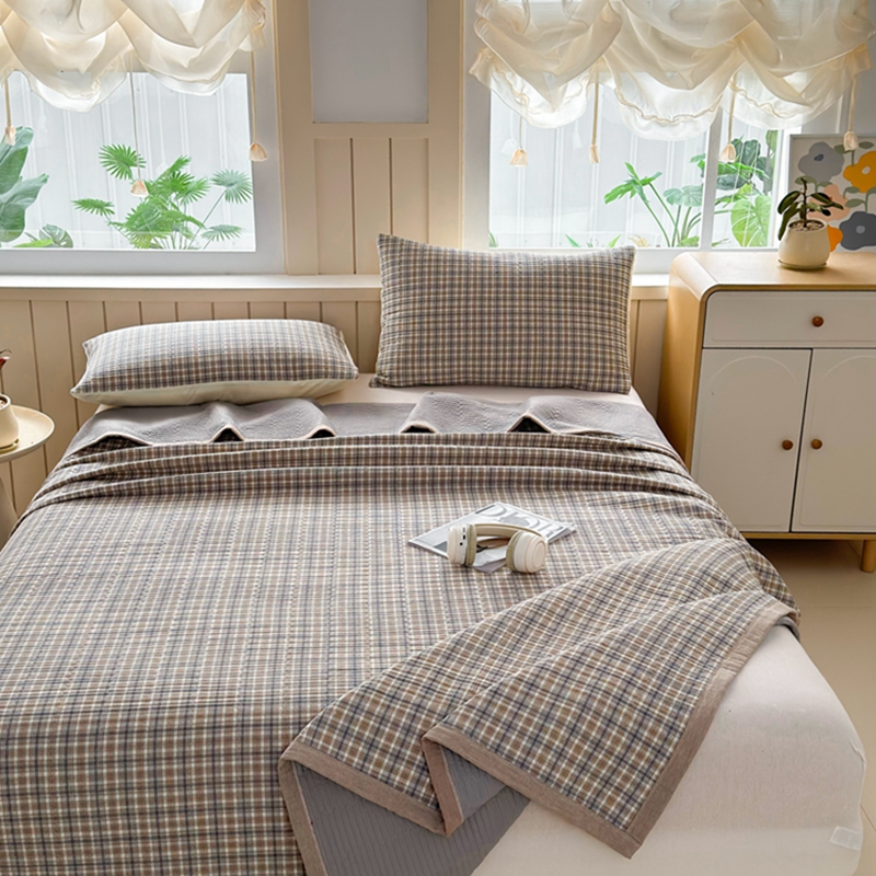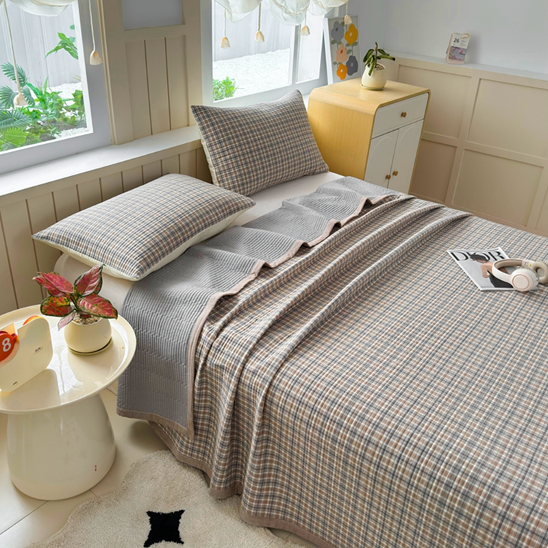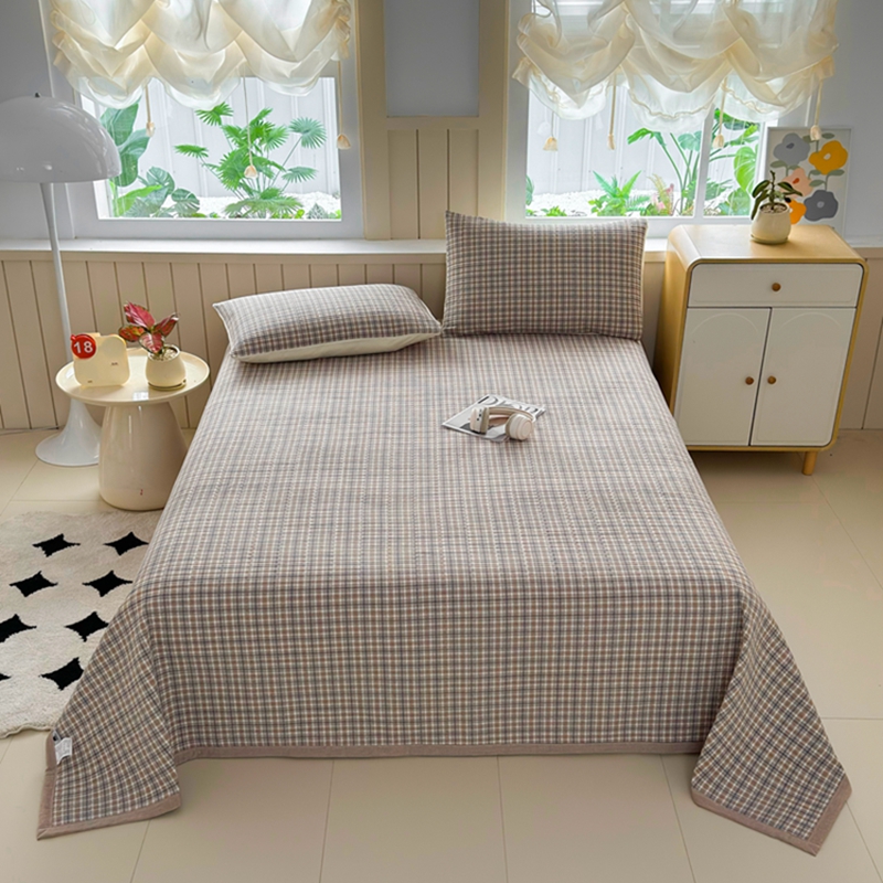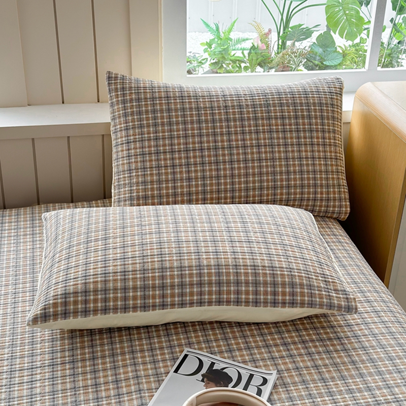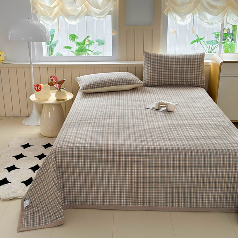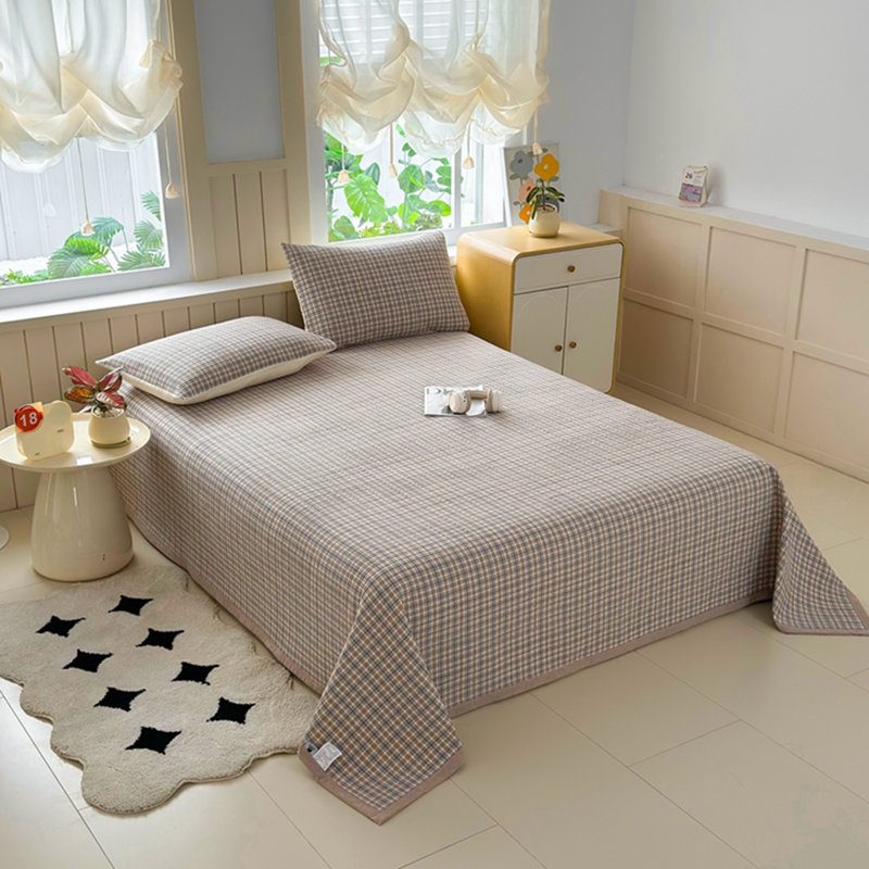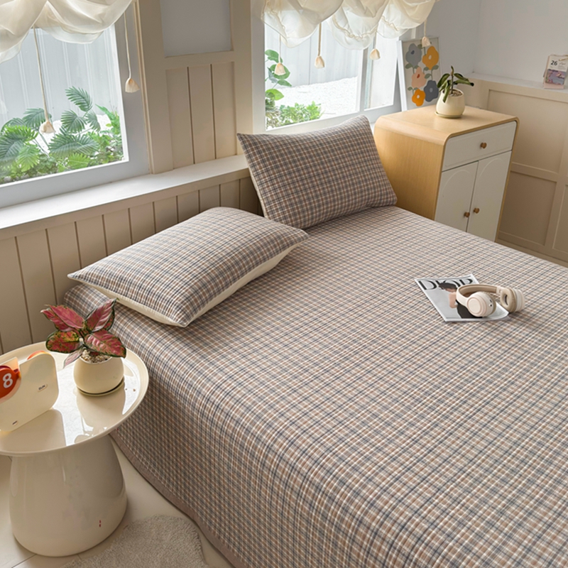 梦精灵家纺 2025新款全棉纯棉色织水洗棉床盖四件套加大尺寸单被套枕套 可颂-咖