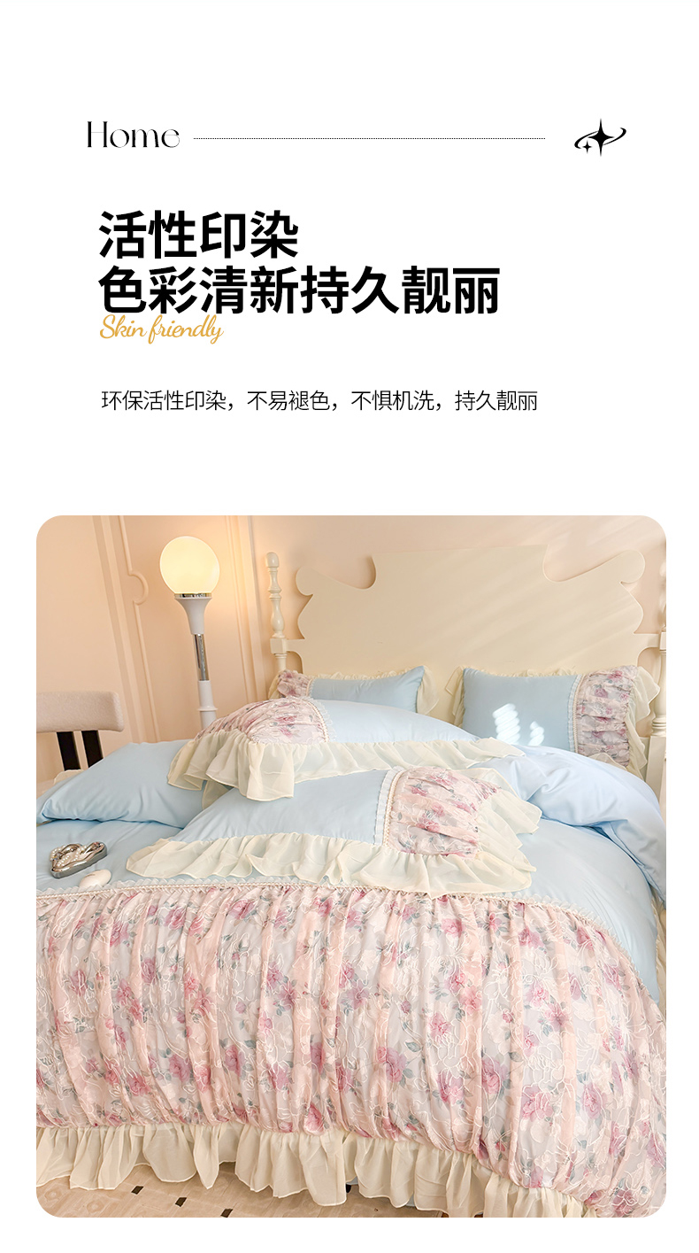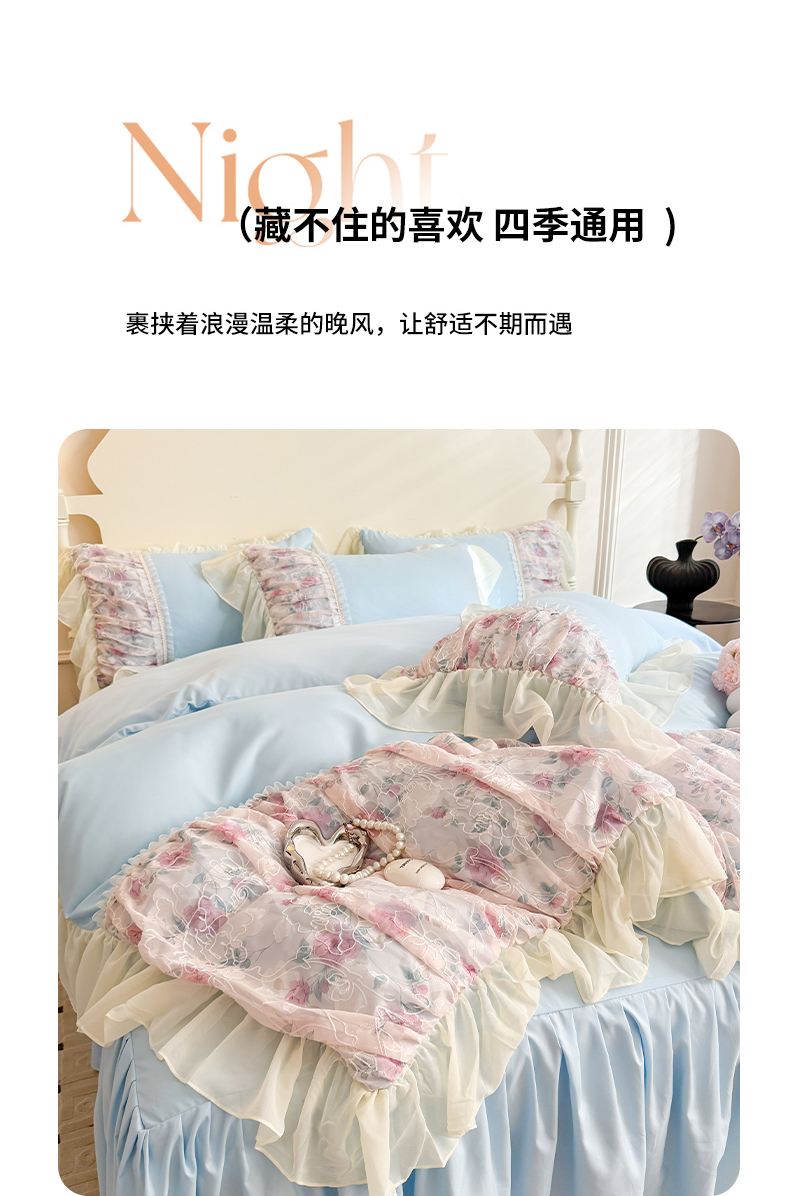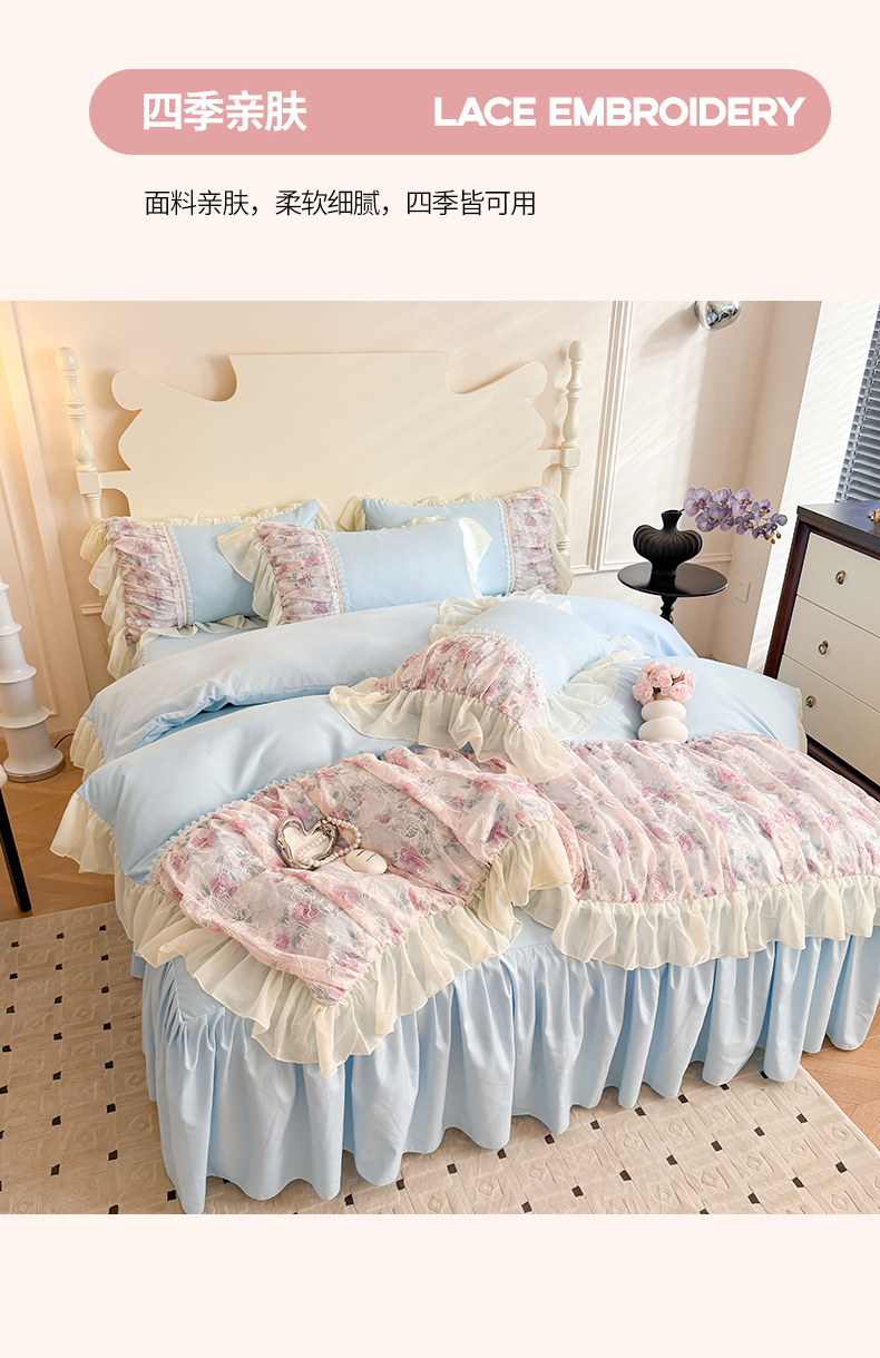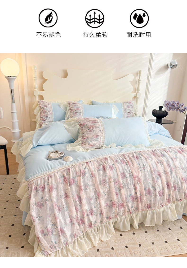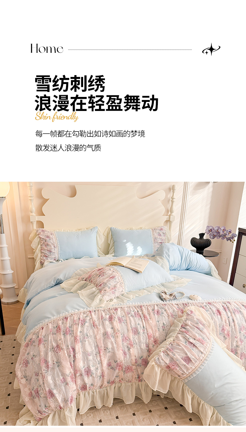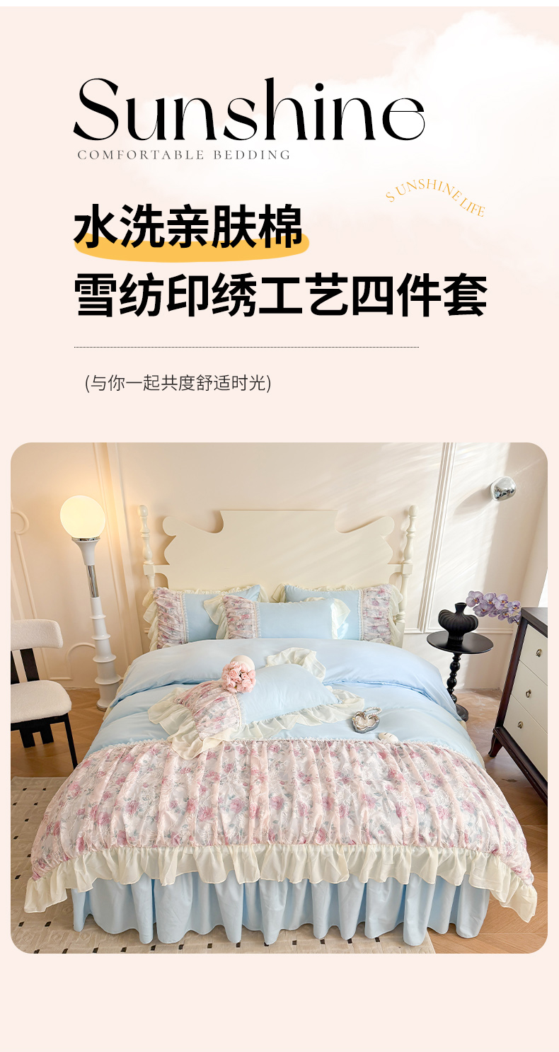 当前位置: 91家纺网 > 商品网购 > 床品套件 > 四件套 > 水洗棉四件套 > 富盛家纺 2025新款水洗亲肤棉雪纺印绣工艺四件套公主风四件套巴黎春天系列 巴黎春天-蓝