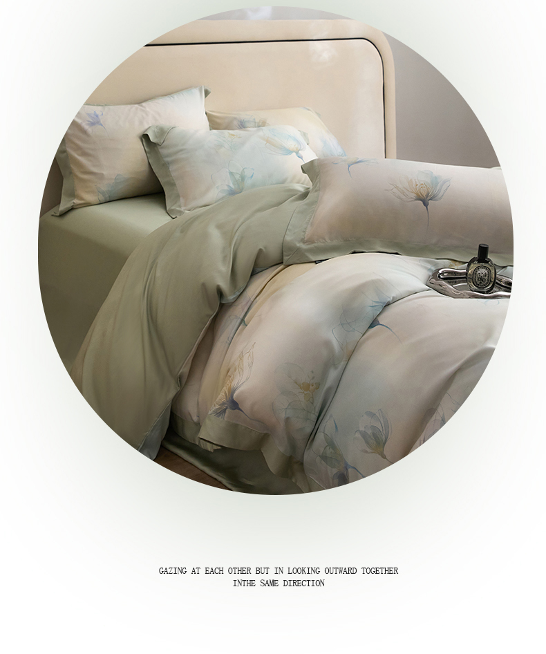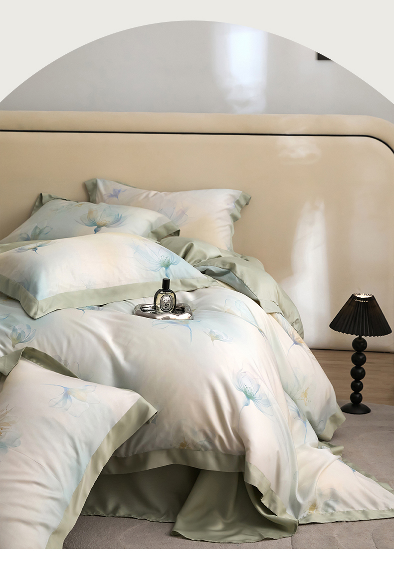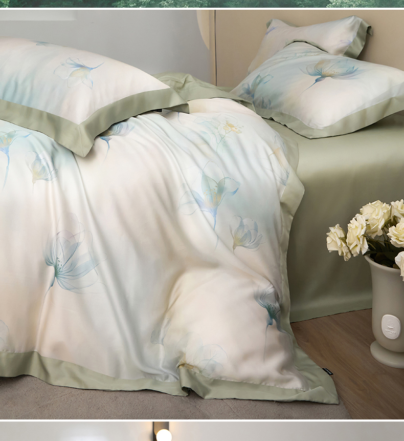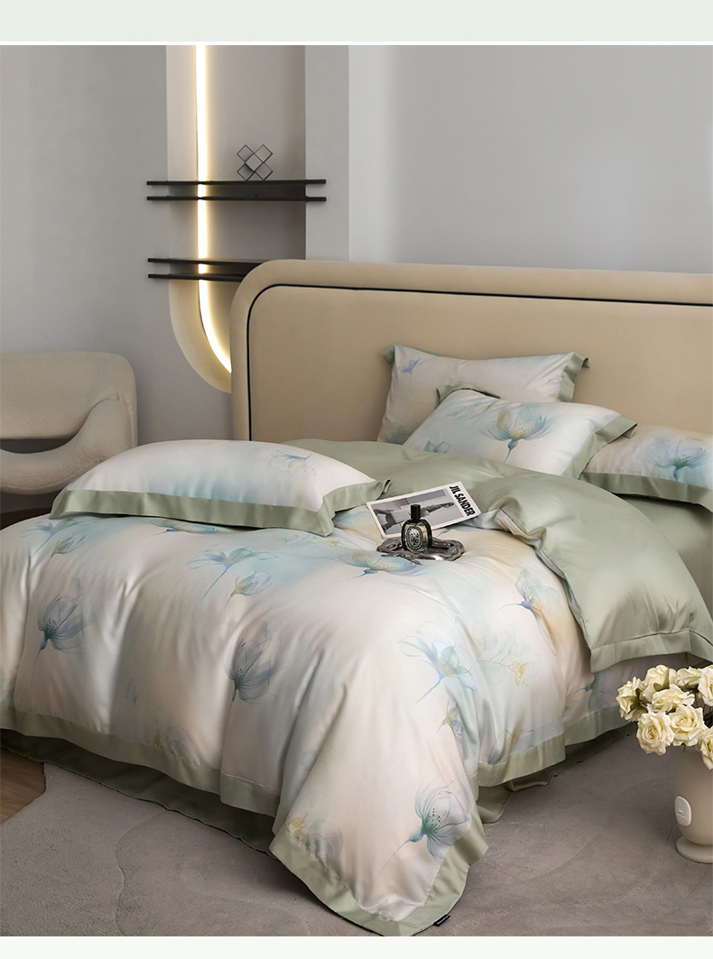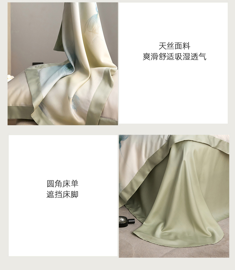 (总)薏思家纺 2025新款全棉100支数码印花生态磨毛轻奢款四件套-花边系列,橘子海,向云端,寻野-绿