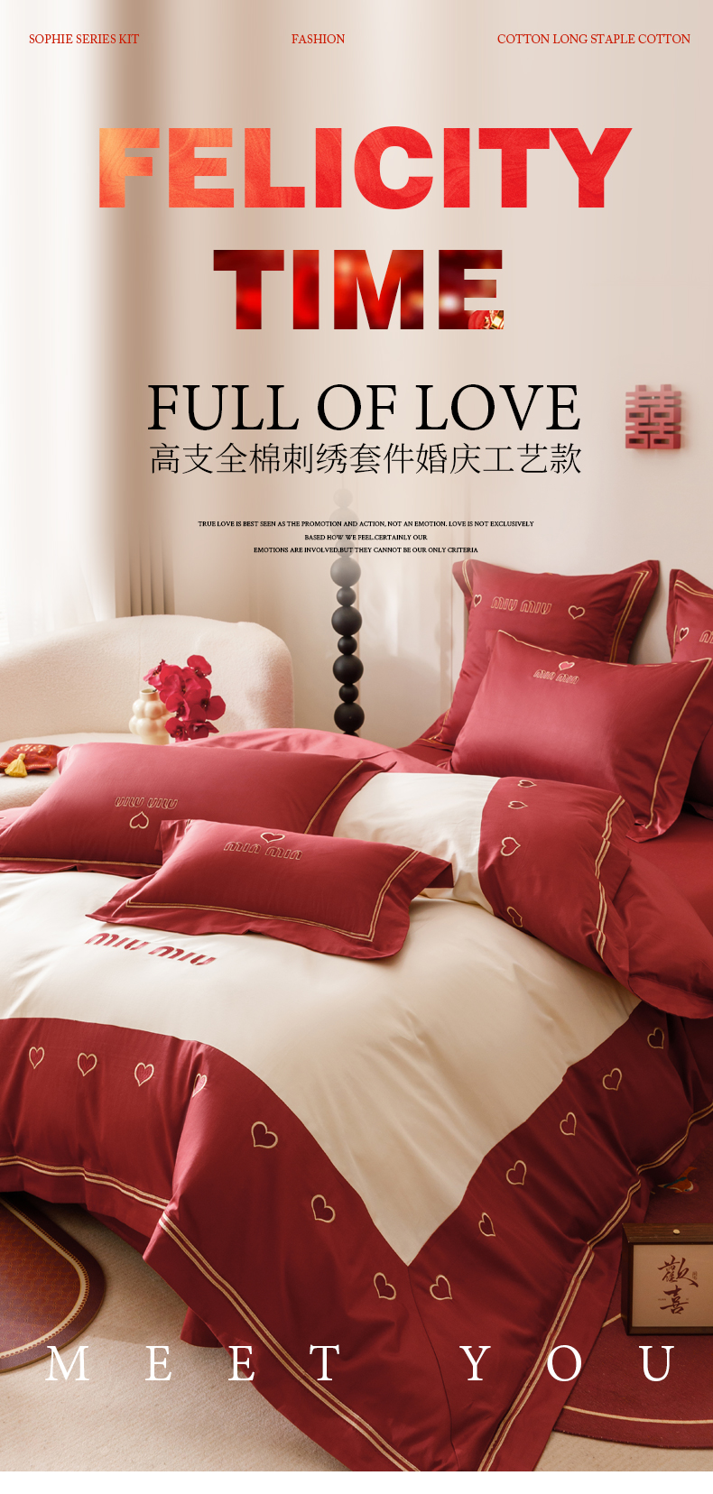 (总)慕晨 2024新款A类50支澳棉全棉纯棉贡缎婚庆绣花贴布绣四件套爆款,同心缘,花好月圆,花嫁,吾家有喜,喜庆缪缪