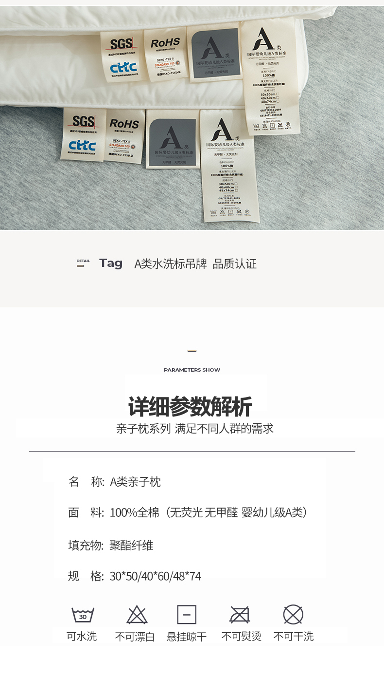 当前位置: 91家纺网 > 商品网购 > 枕头/枕芯/保健枕/颈椎枕 > 麦肯锡2025新款国际婴幼儿级A类无荧光 无甲醛低平亲子枕 成人款48×74受压高度:5cm