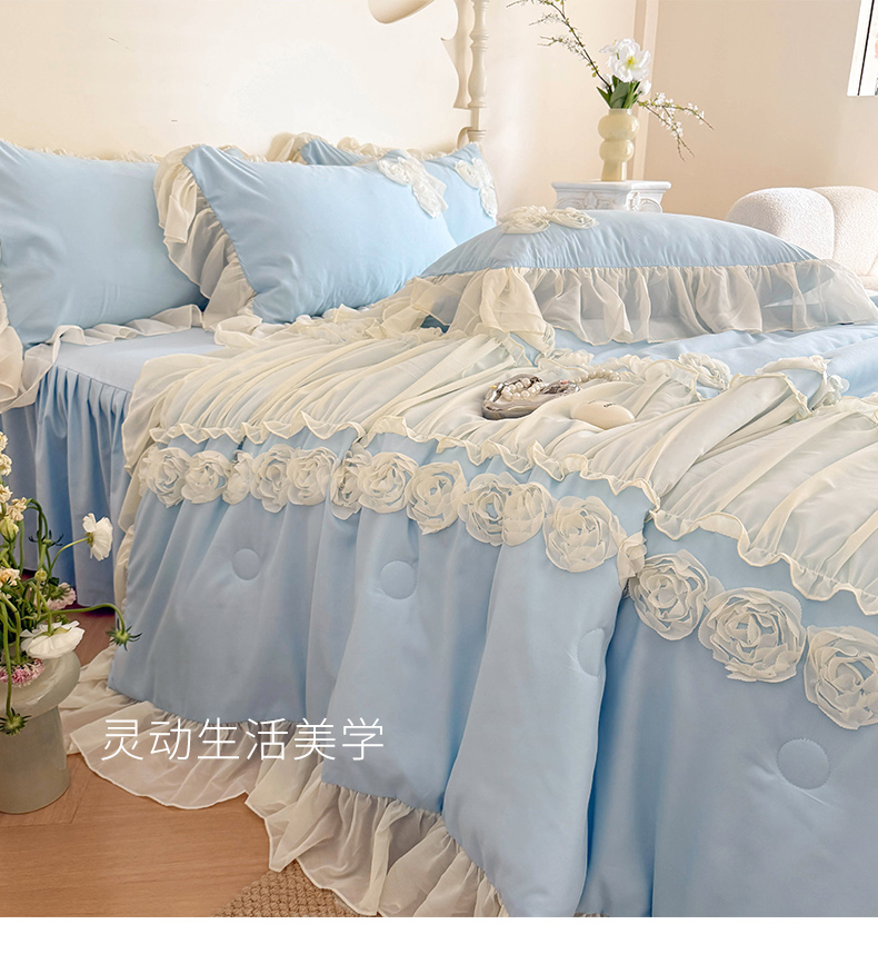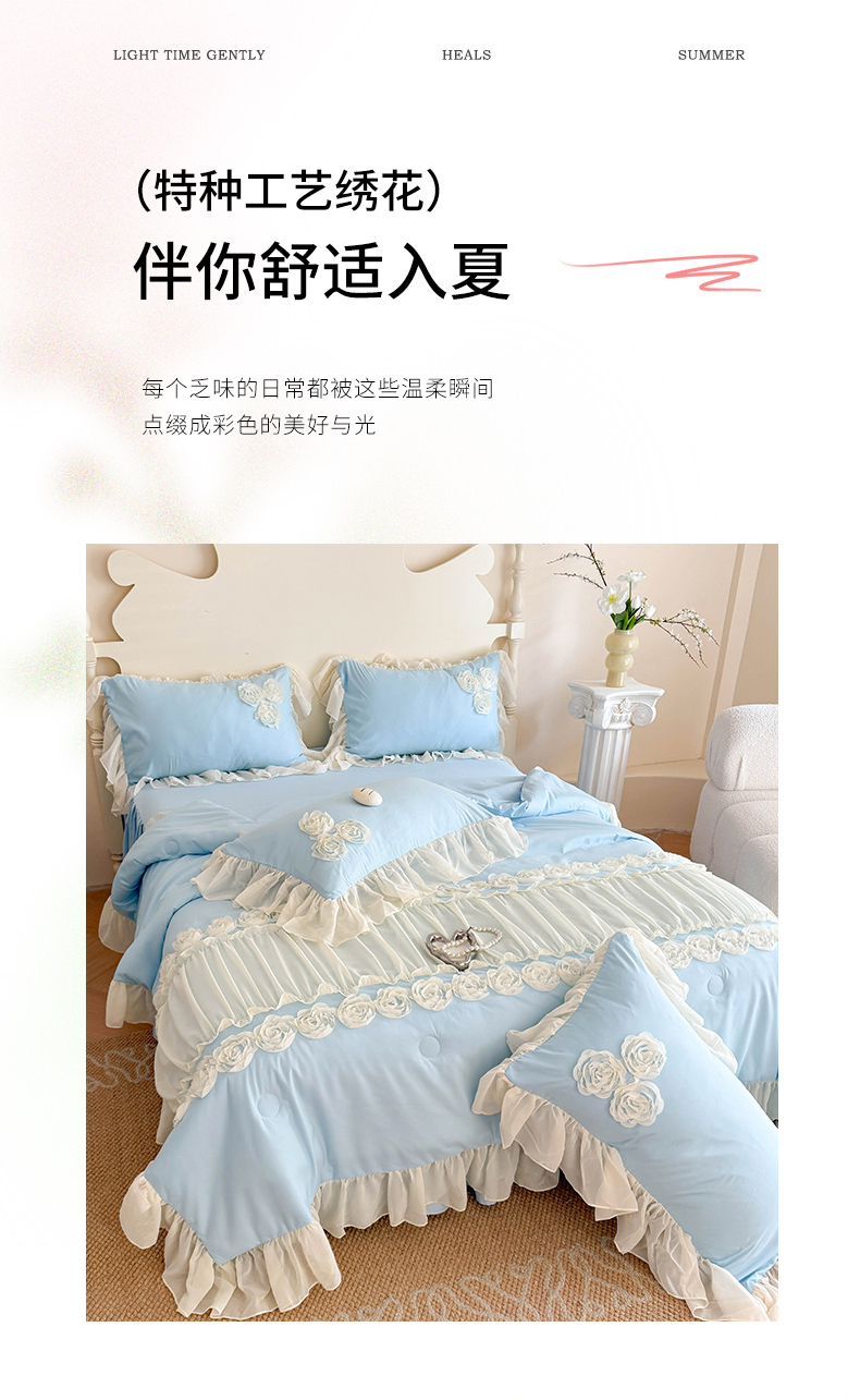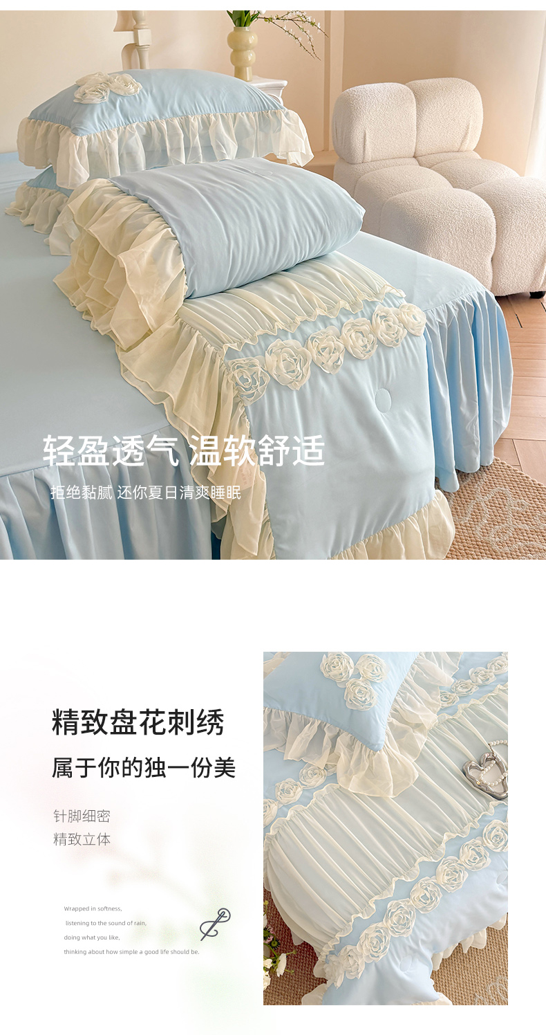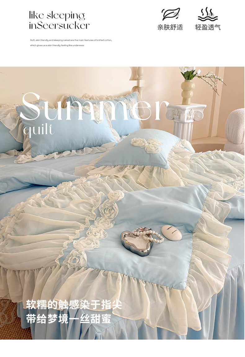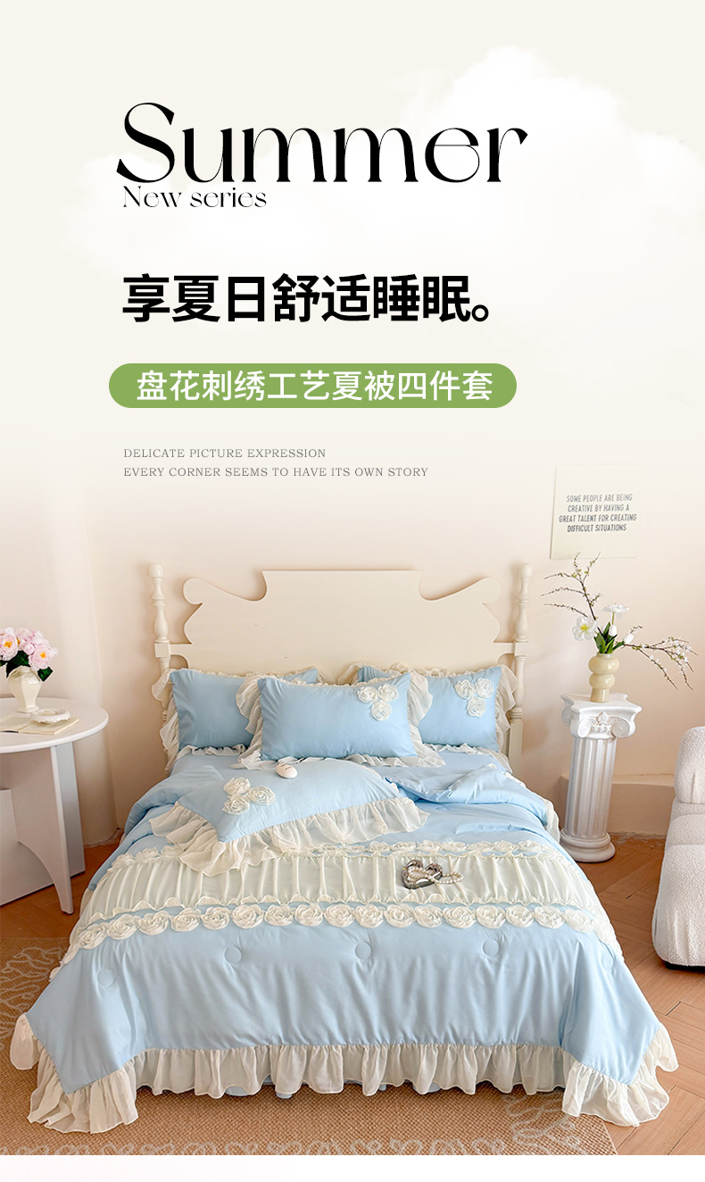当前位置: 91家纺网 > 商品网购 > 床品套件 > 四件套 > 夏被四件套 > 富盛家纺 2025新款水洗亲肤棉盘花特种刺绣夏被夏凉被空调被床裙款四件套 甜蜜蜜-蓝
