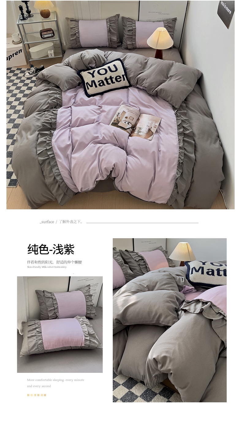 当前位置: 91家纺网 > 商品网购 > 床品套件 > 四件套 > 其它四件套 > 缦绣阁家纺 2025新款韩版花边水洗磨毛花边四件套床单款床笠款床裙款公主风四件套跨境外贸可定制 银灰拼浅紫
