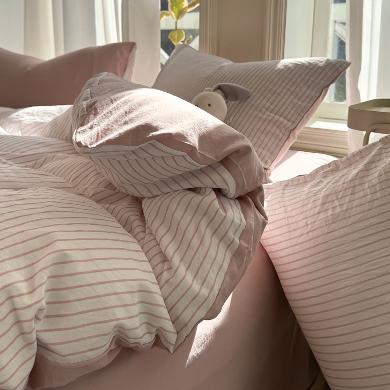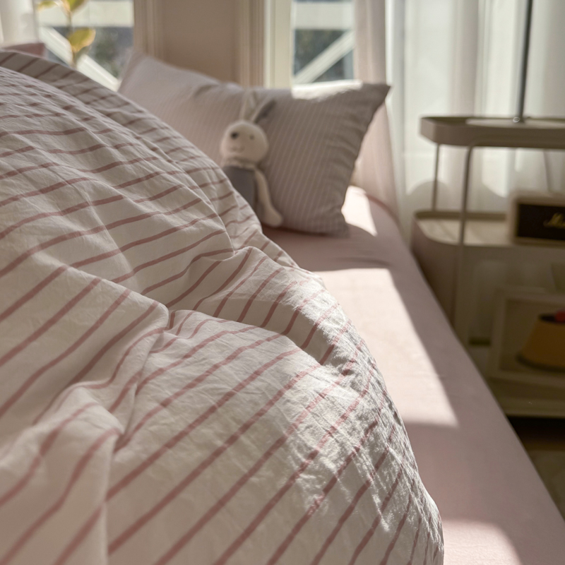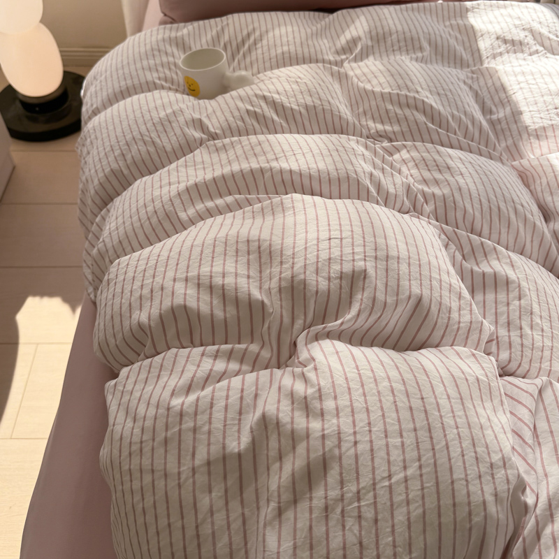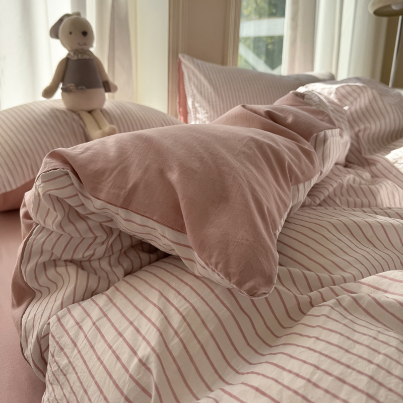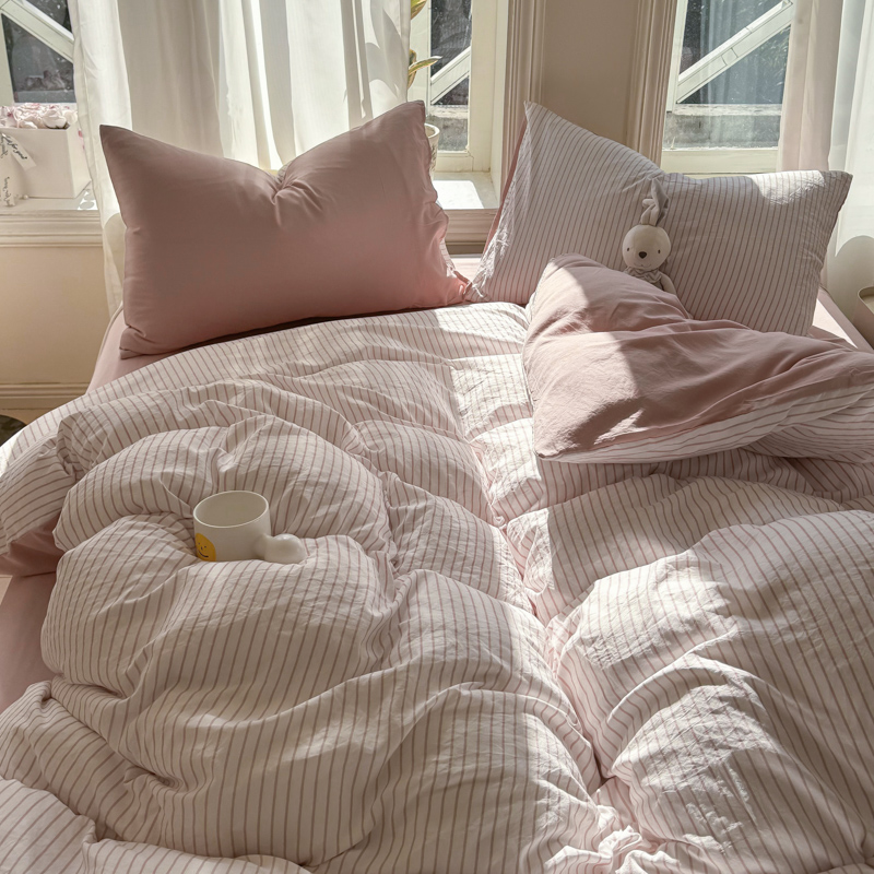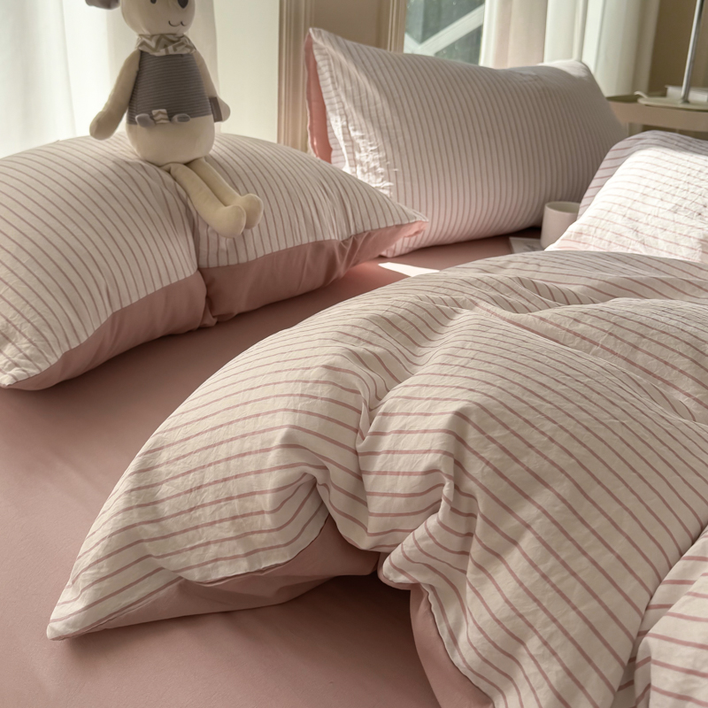 商品名称:缦绣阁家纺 2025新款无印风条纹水洗磨毛四件套简约风4件套学生宿舍三件套 良品条纹粉玉