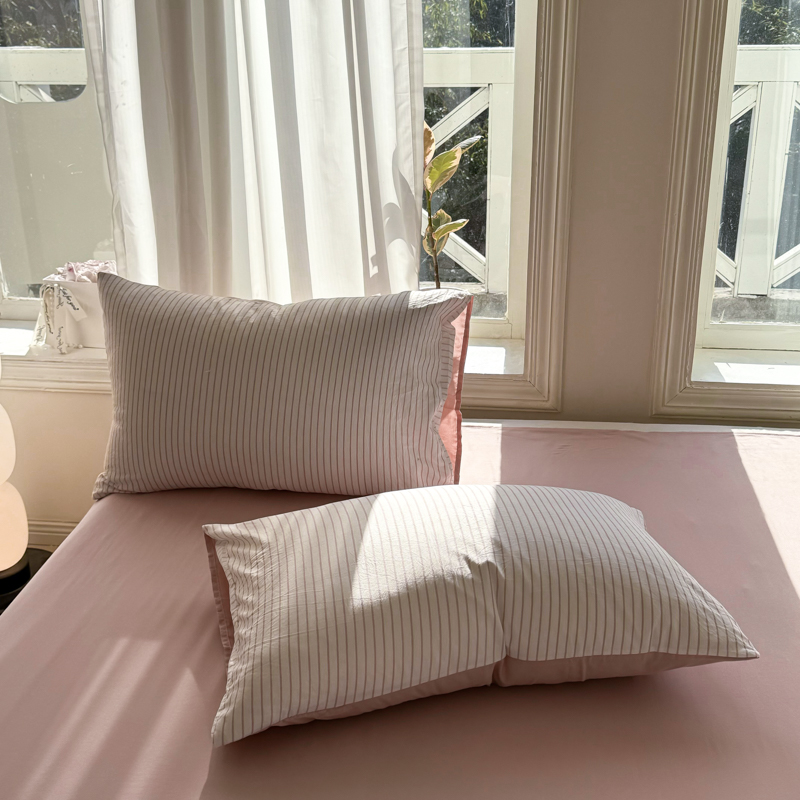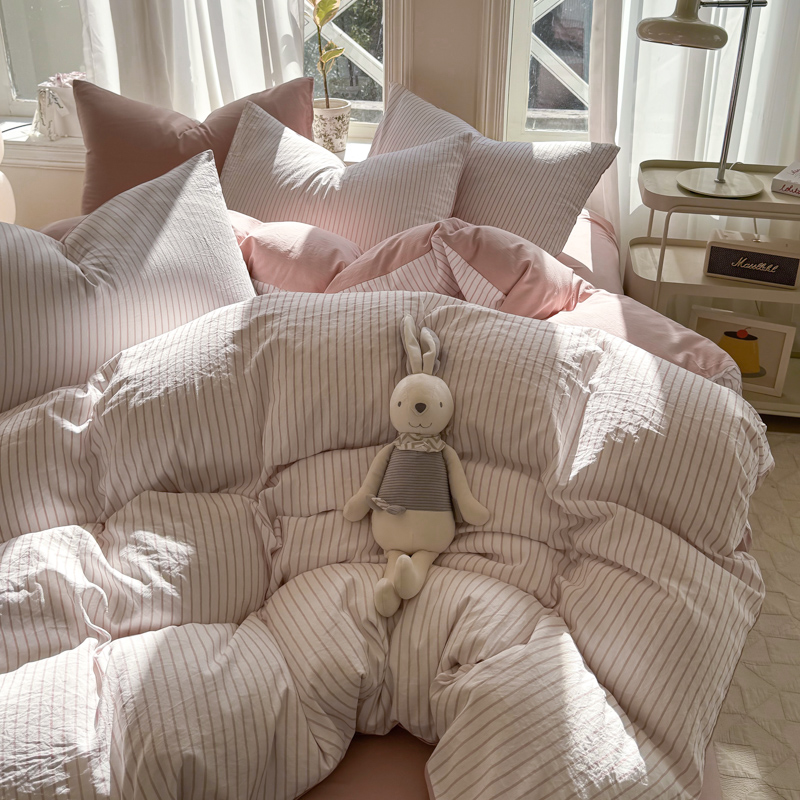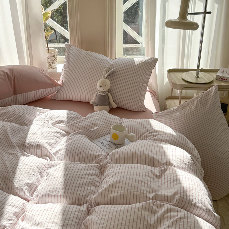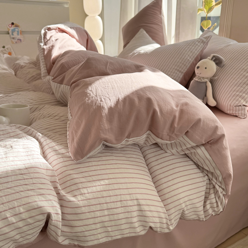 缦绣阁家纺 2025新款无印风条纹水洗磨毛四件套简约风4件套学生宿舍三件套 良品条纹粉玉
