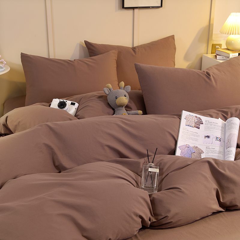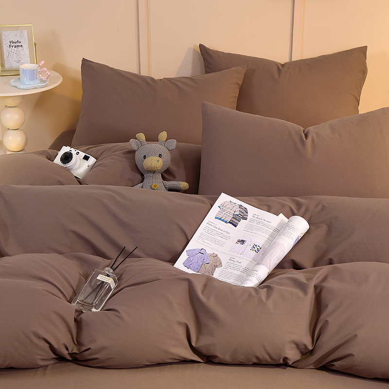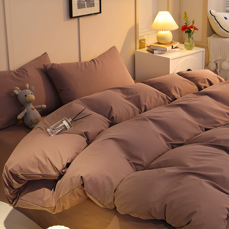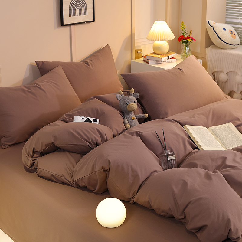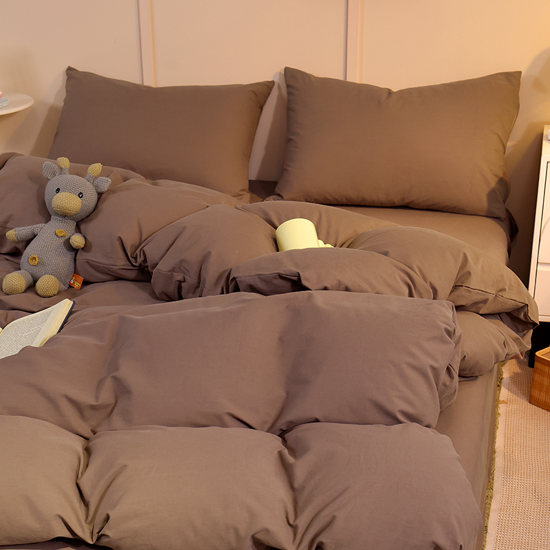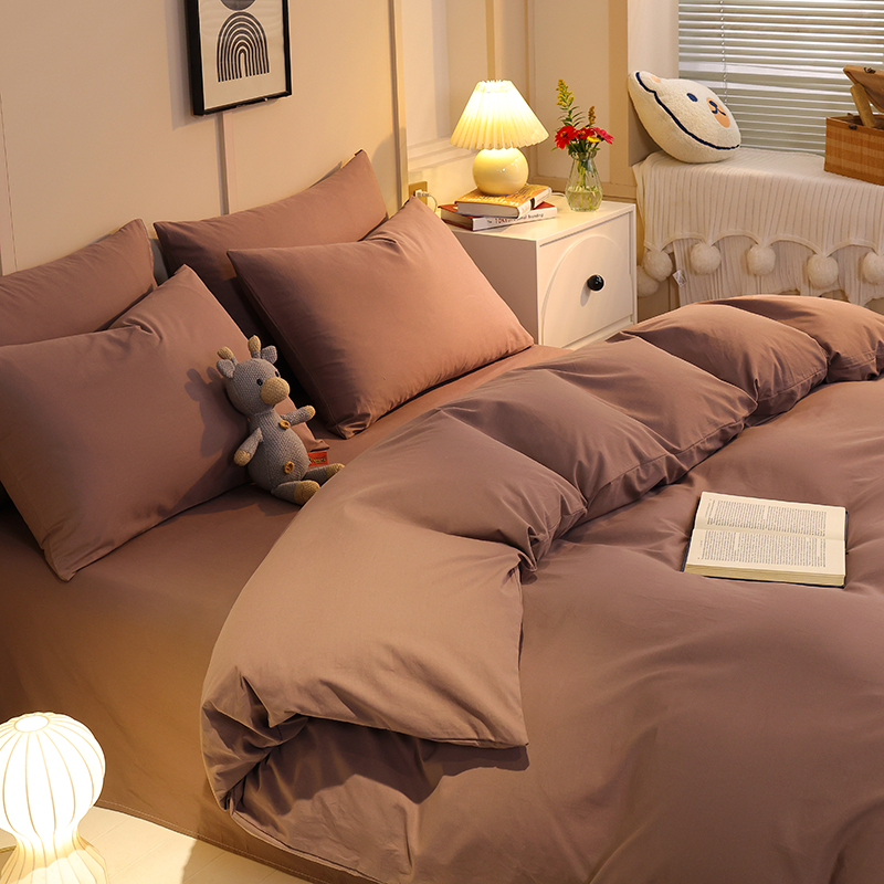 缦绣阁家纺 2025新款亲肤水洗棉纯色双拼四件套简约风床单款床笠款四件套宿舍三件套 纯色深咖