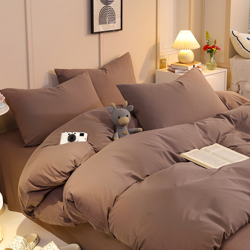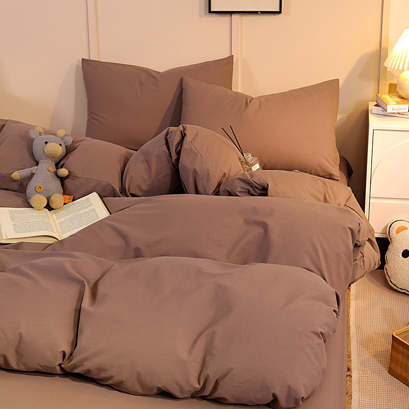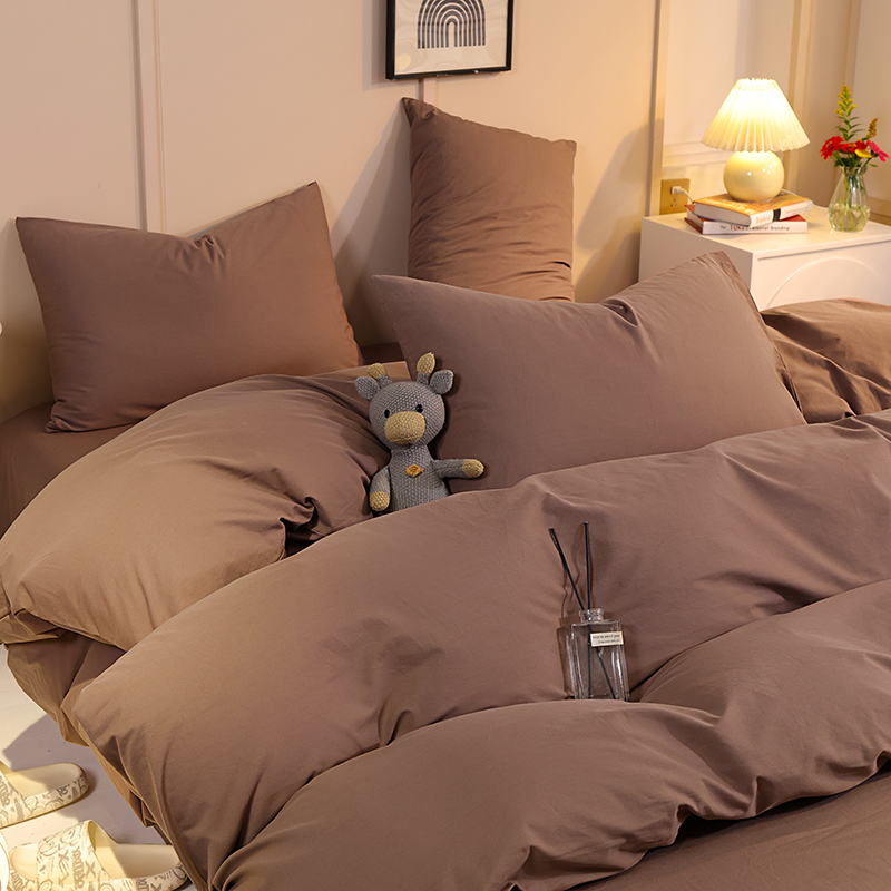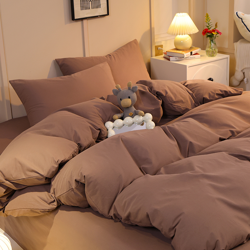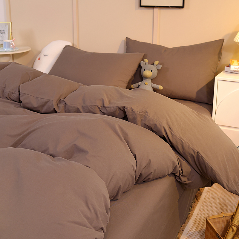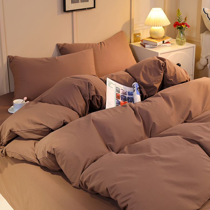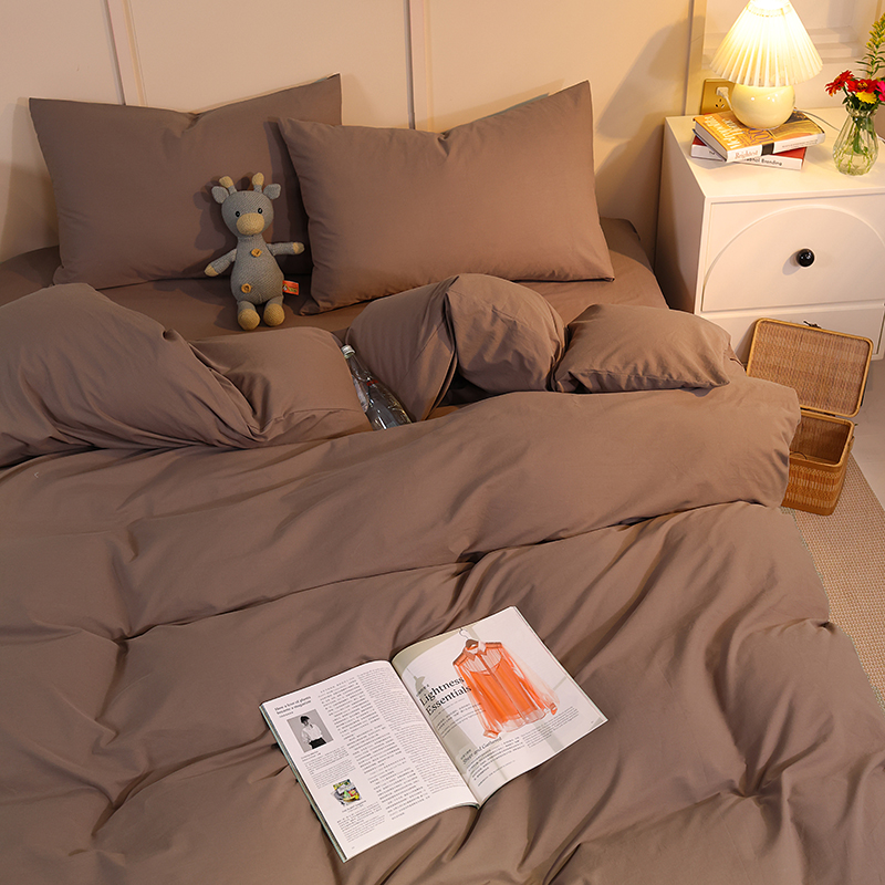 缦绣阁家纺 2025新款亲肤水洗棉纯色双拼四件套简约风床单款床笠款四件套宿舍三件套 纯色深咖