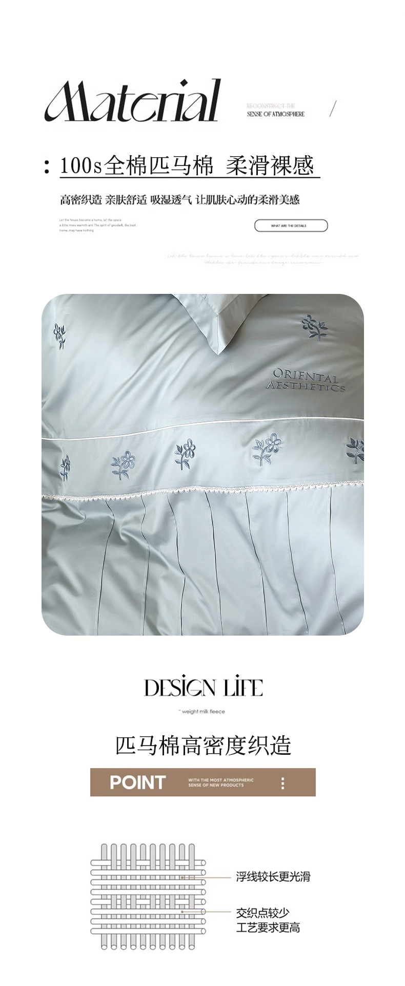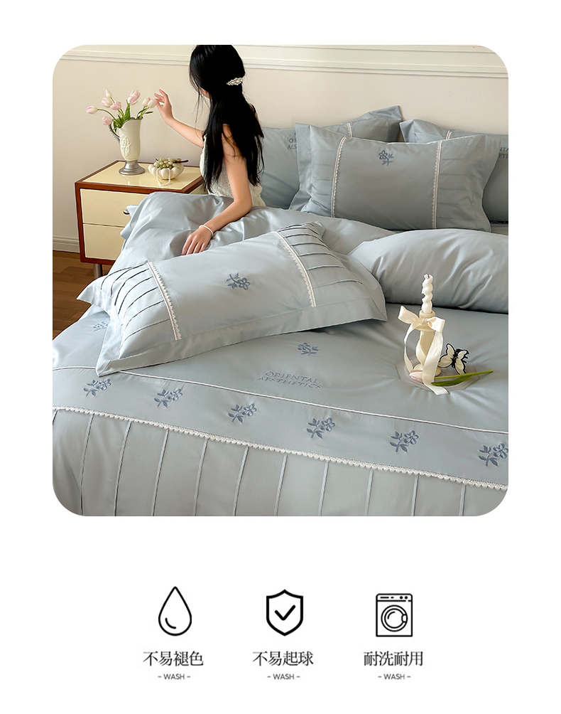 商品名称:红番天家居馆 2025新款全棉纯棉贡缎长绒棉手工捏折刺绣蕾丝四件套-觅春 觅春-午后清晨