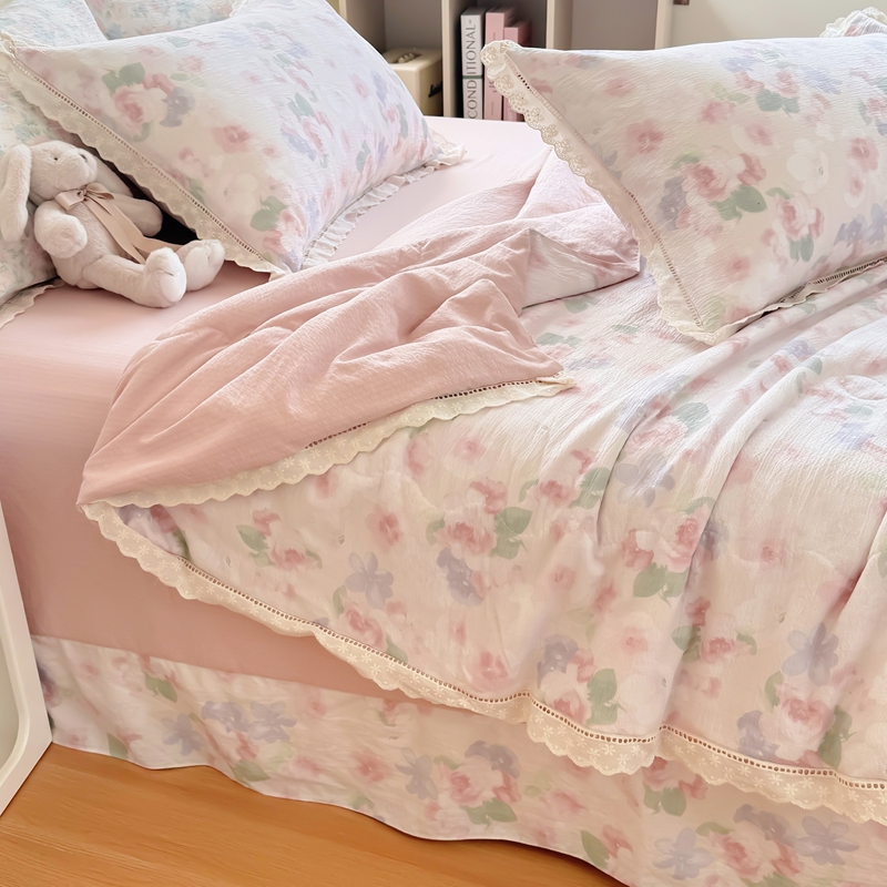 奥虎家纺 2025新款纯棉花边小竹棉夏被四件套 蔷薇