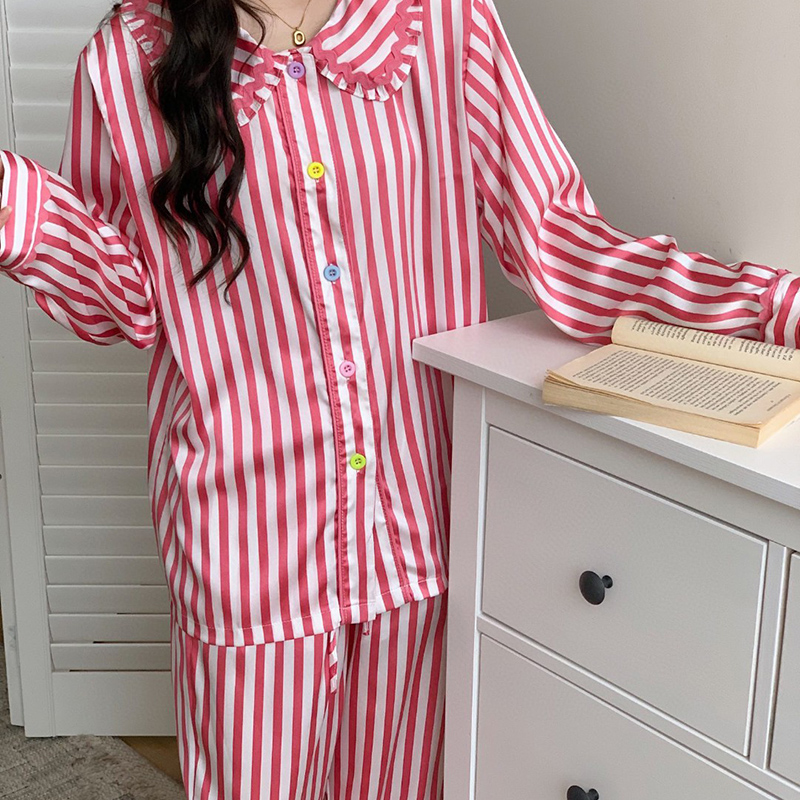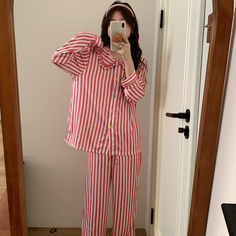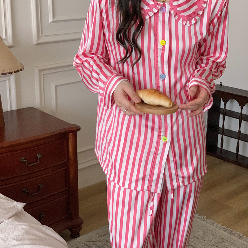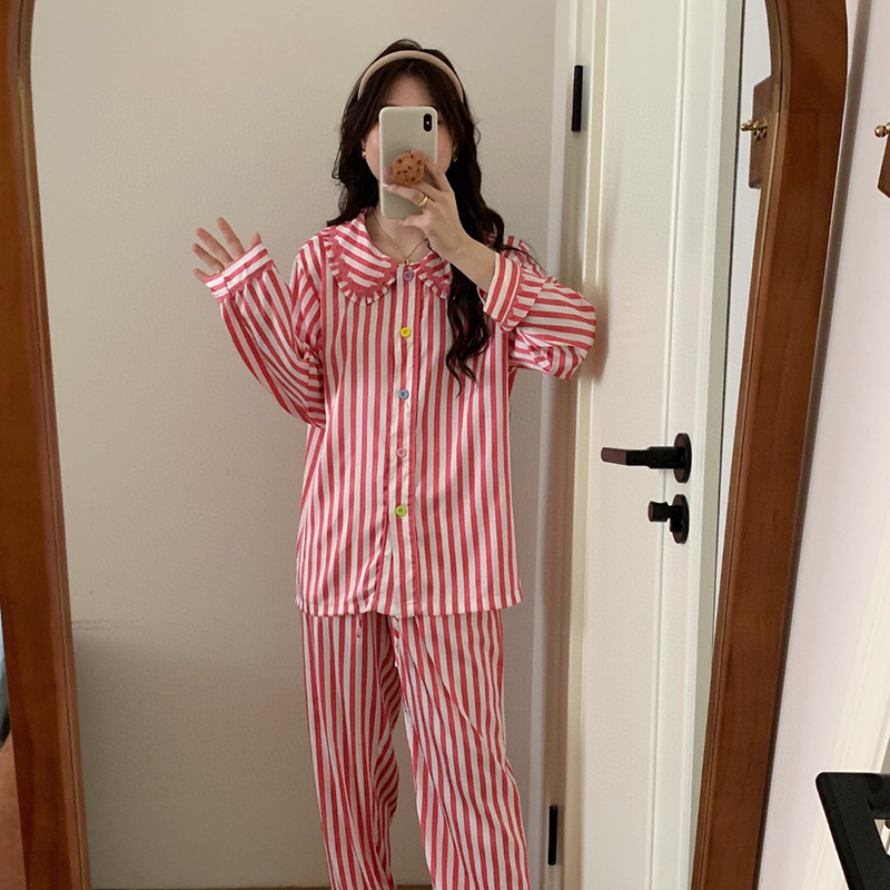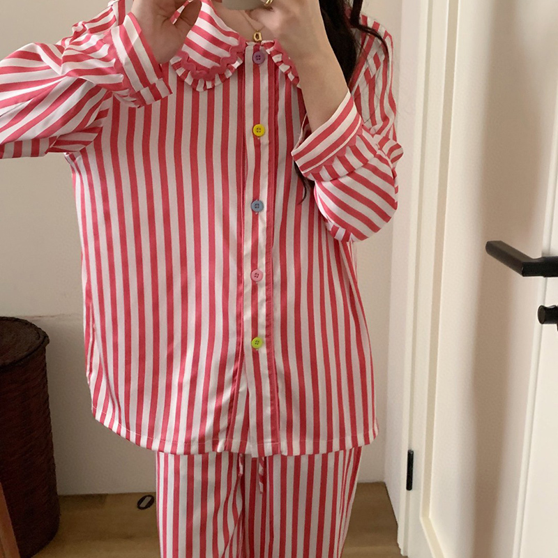 (总)妍景家居生活馆 2025新款81861 韩系拼色条纹娃娃领套装