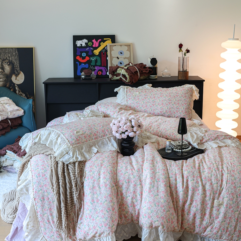 紫碧螺家纺 2025新款A类全棉纯棉仙女双层纱大韩边四件套 晴岛桔梗
