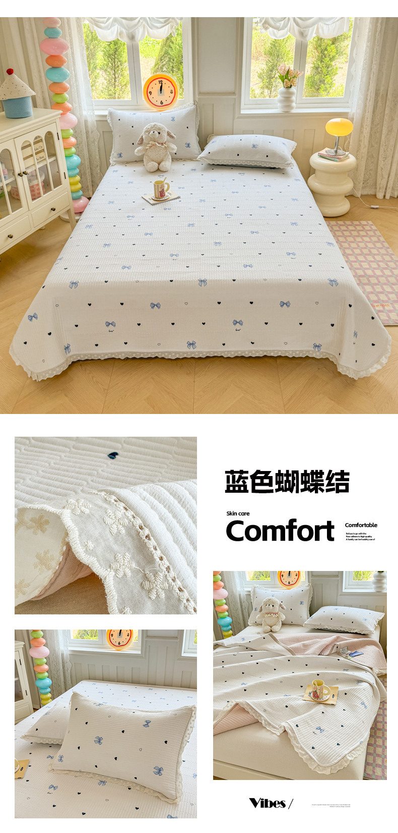 源舜 2025新款全棉法式花边云感双层纱全棉花边床盖三件套 蓝色蝴蝶结