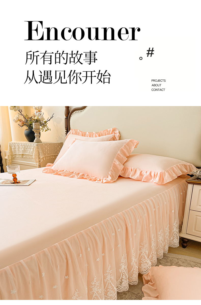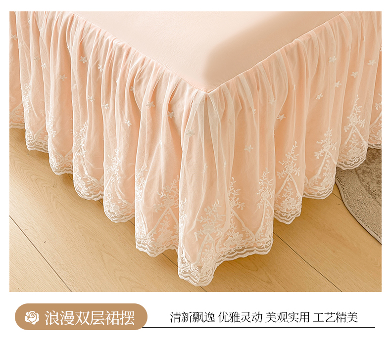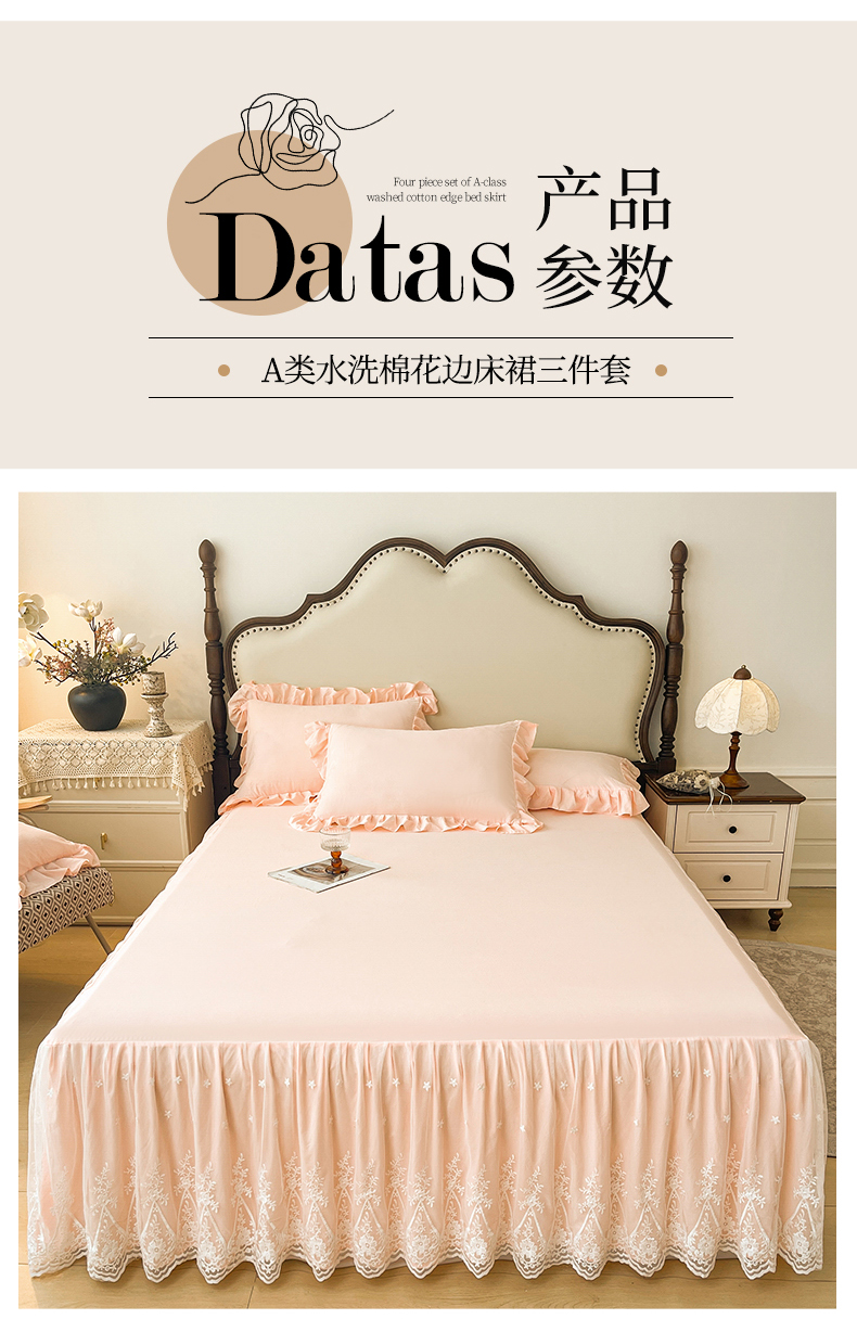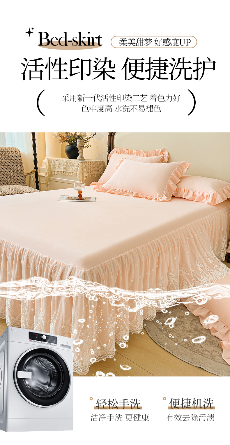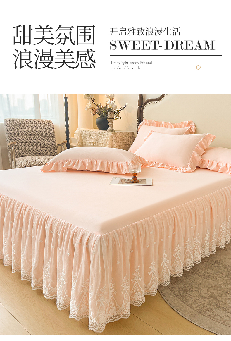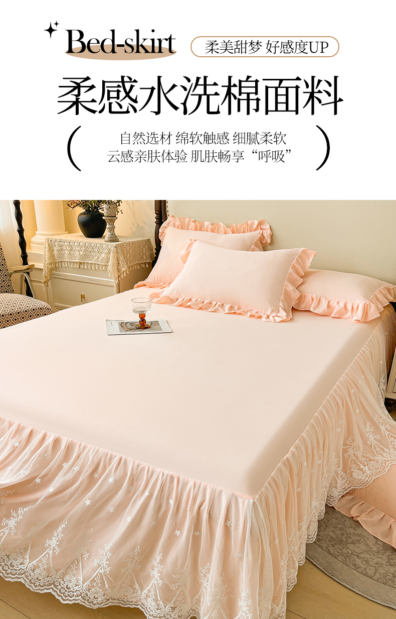 当前位置: 91家纺网 > 商品网购 > 床品套件 > 三件套 > 好儿喜家纺 2025新款A类水洗棉花边床裙蕾丝床罩三件套-梦之香 梦之香-浅粉