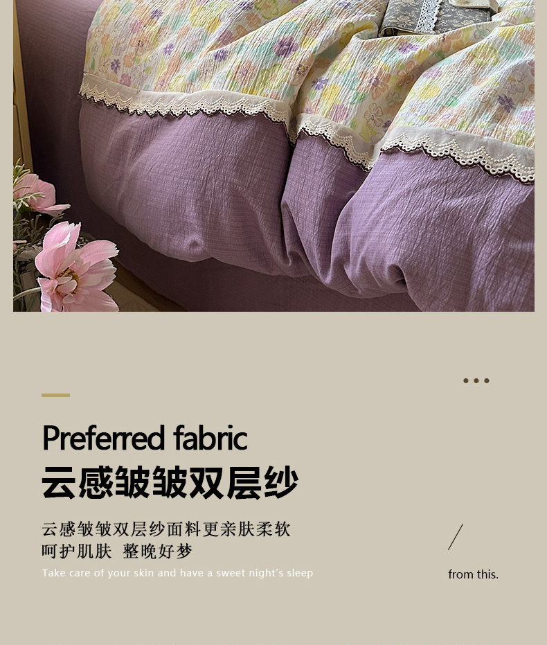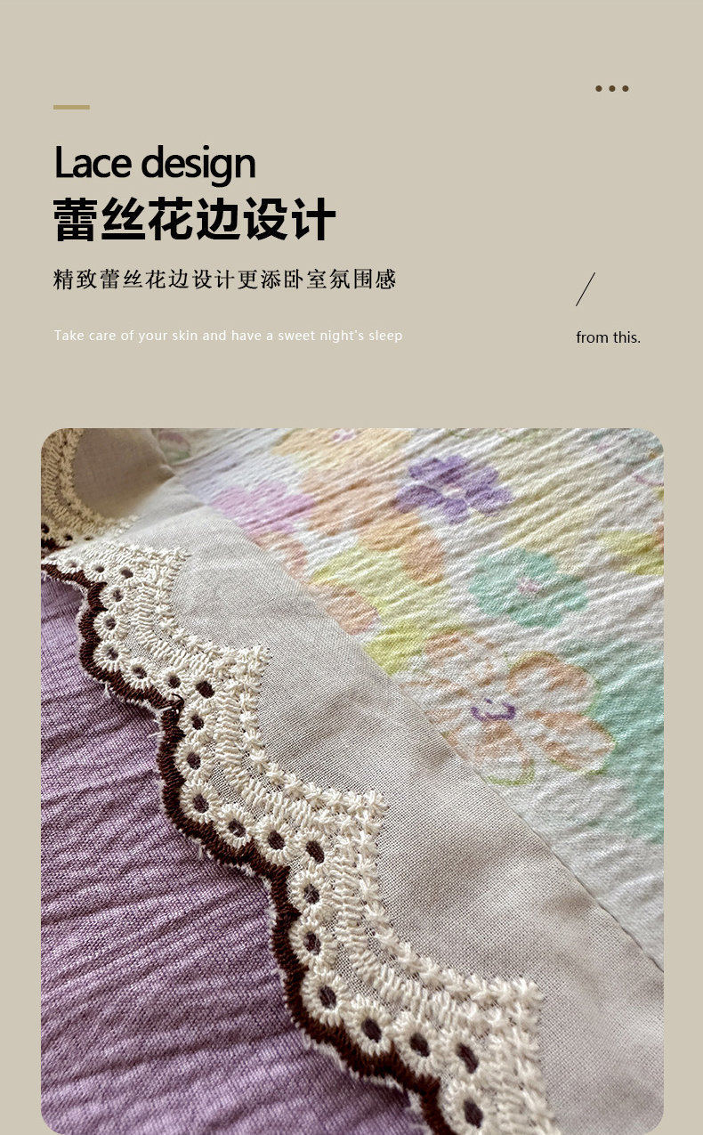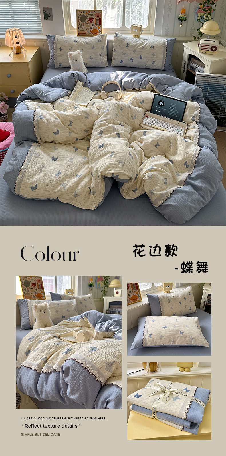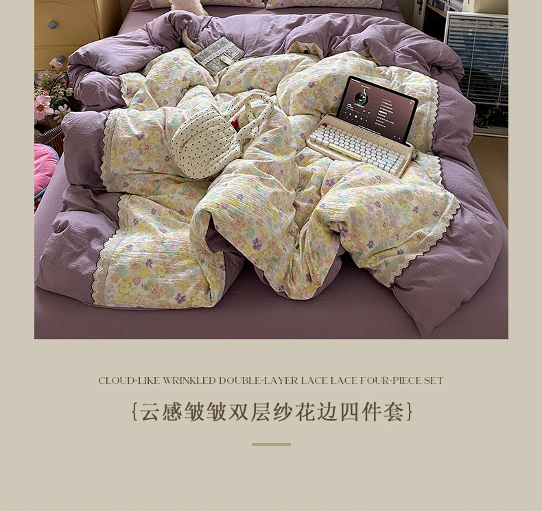 当前位置: 91家纺网 > 商品网购 > 床品套件 > 四件套 > 全棉普通四件套 > 水墨江南 2025新款云感皱皱纱全棉花边四件套场景一 花边款-花雨