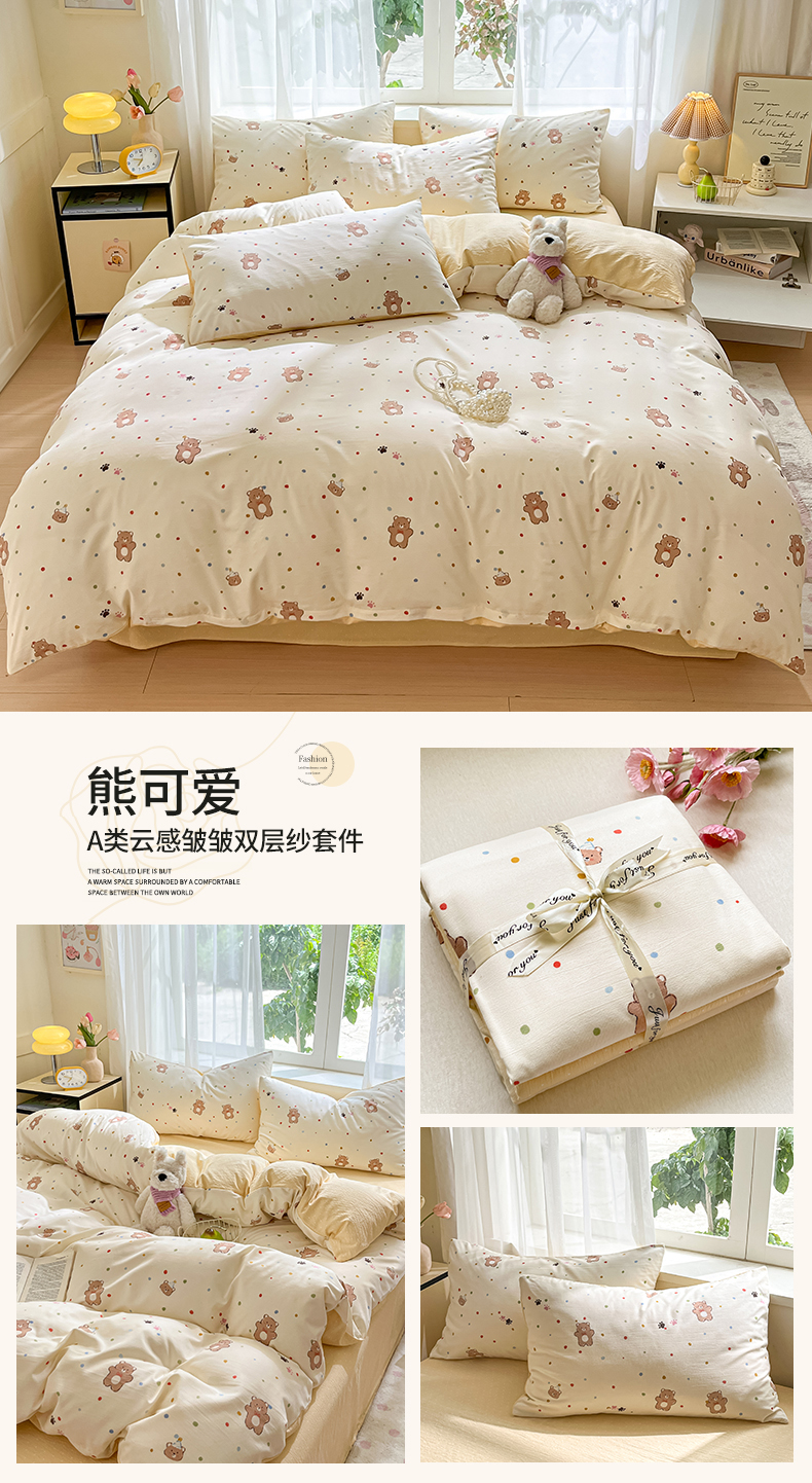 当前位置: 91家纺网 > 商品网购 > 床品套件 > 四件套 > 双层纱四件套 > 格真 2025秋冬新款110克高克重提花加厚皱皱纱双层纱四件套双面印花 熊可爱