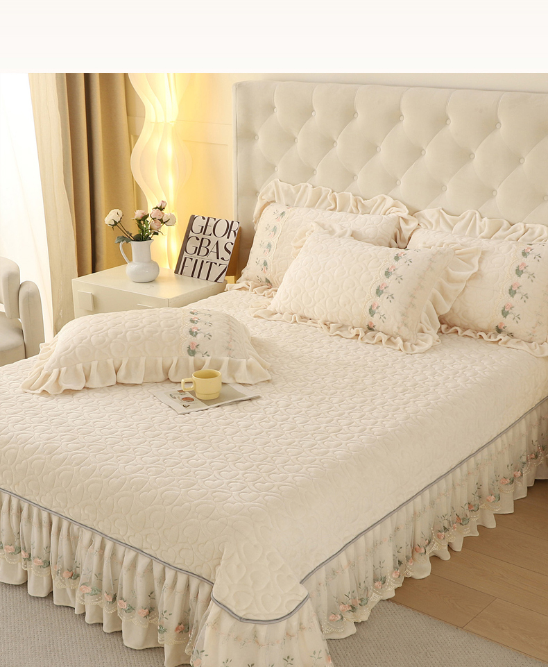• 91家纺网 家纺一手货源 找家纺 (总)能好家纺 2025新款蕾丝工艺水晶绒夹棉床裙,宝石兰,藏青,豆沙,粉玉,灰,酒红,墨绿,月光蓝