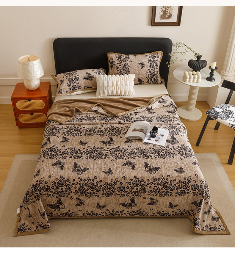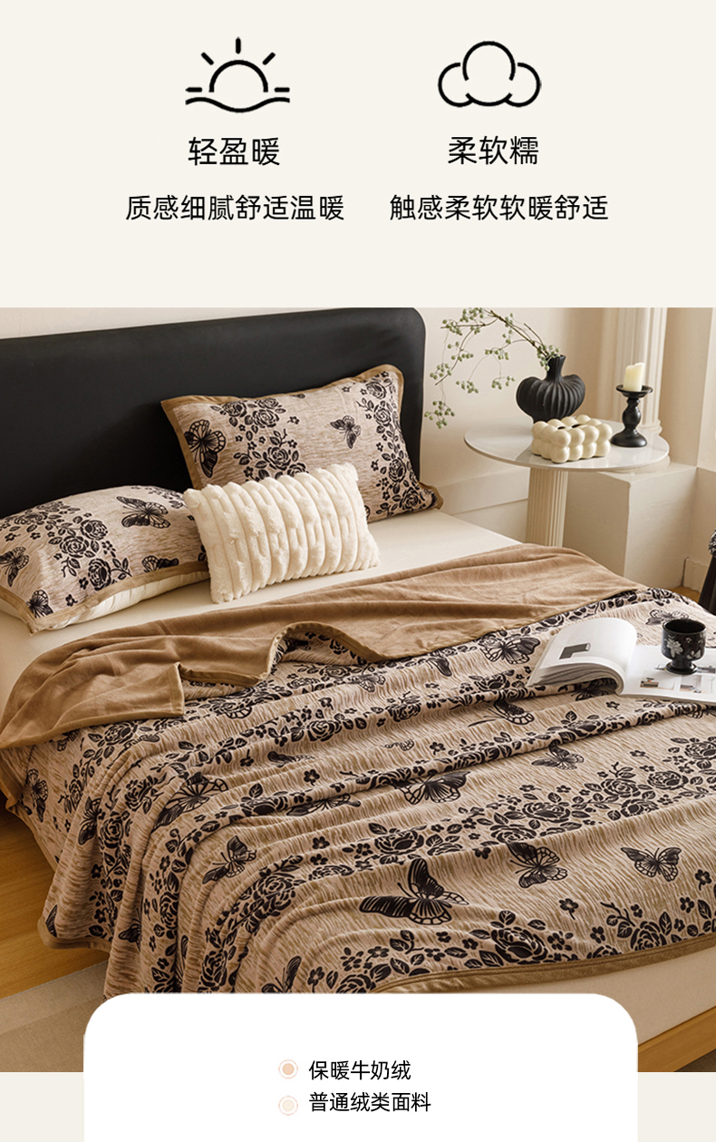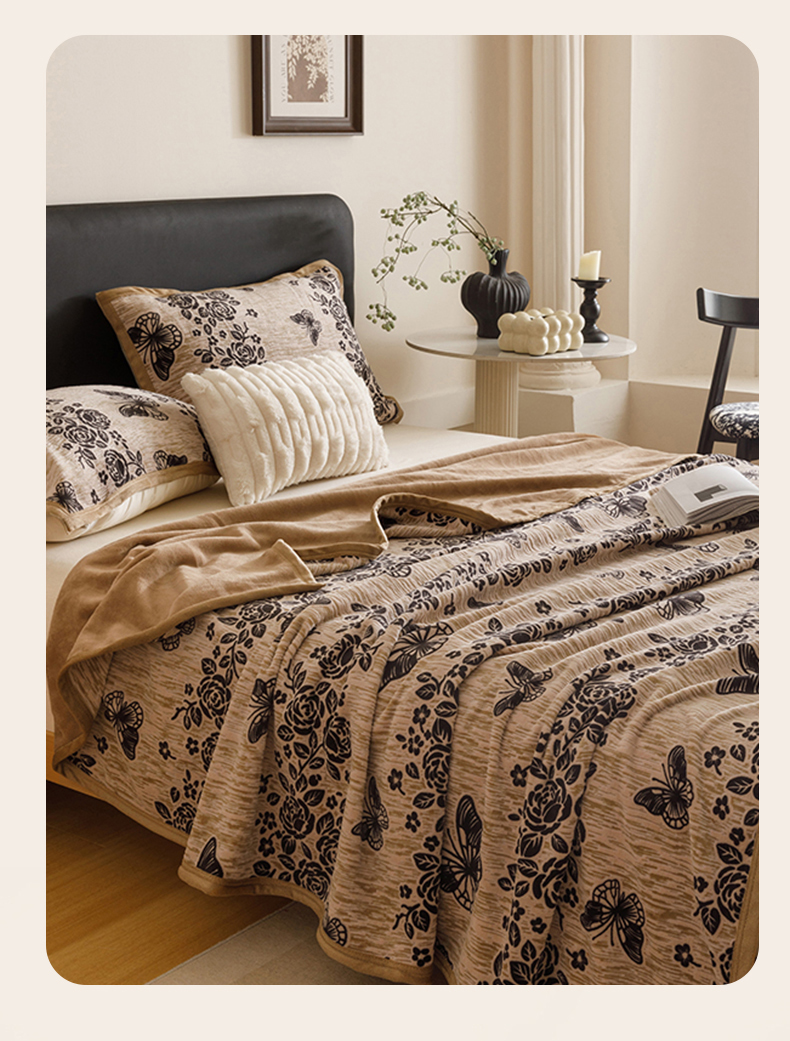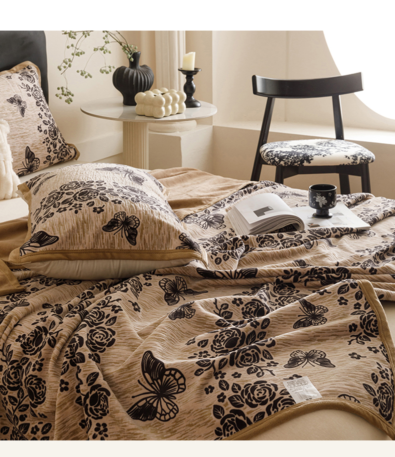 当前位置: 91家纺网 > 商品网购 > 毛毯休闲毯绒毯 > 毛毯 > 悦然毛巾被 2025新款复合毯休闲兔毛绒提花印花工艺盖毯 碟影花语