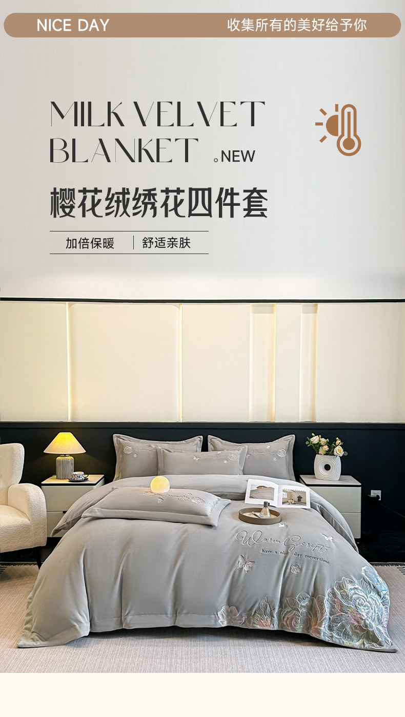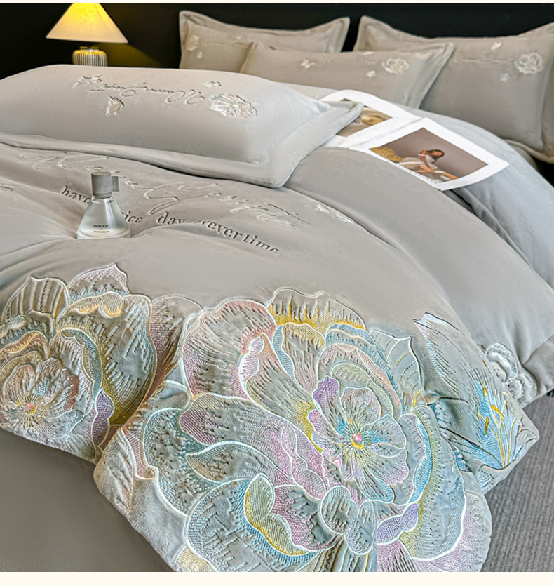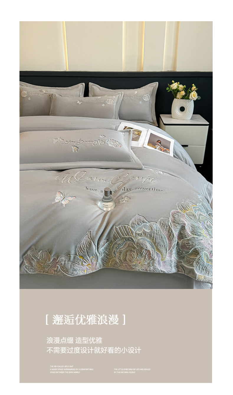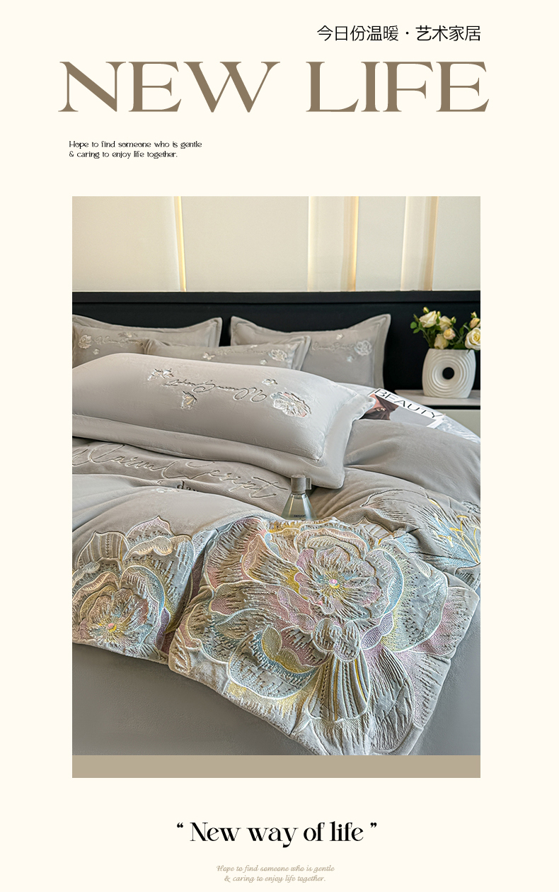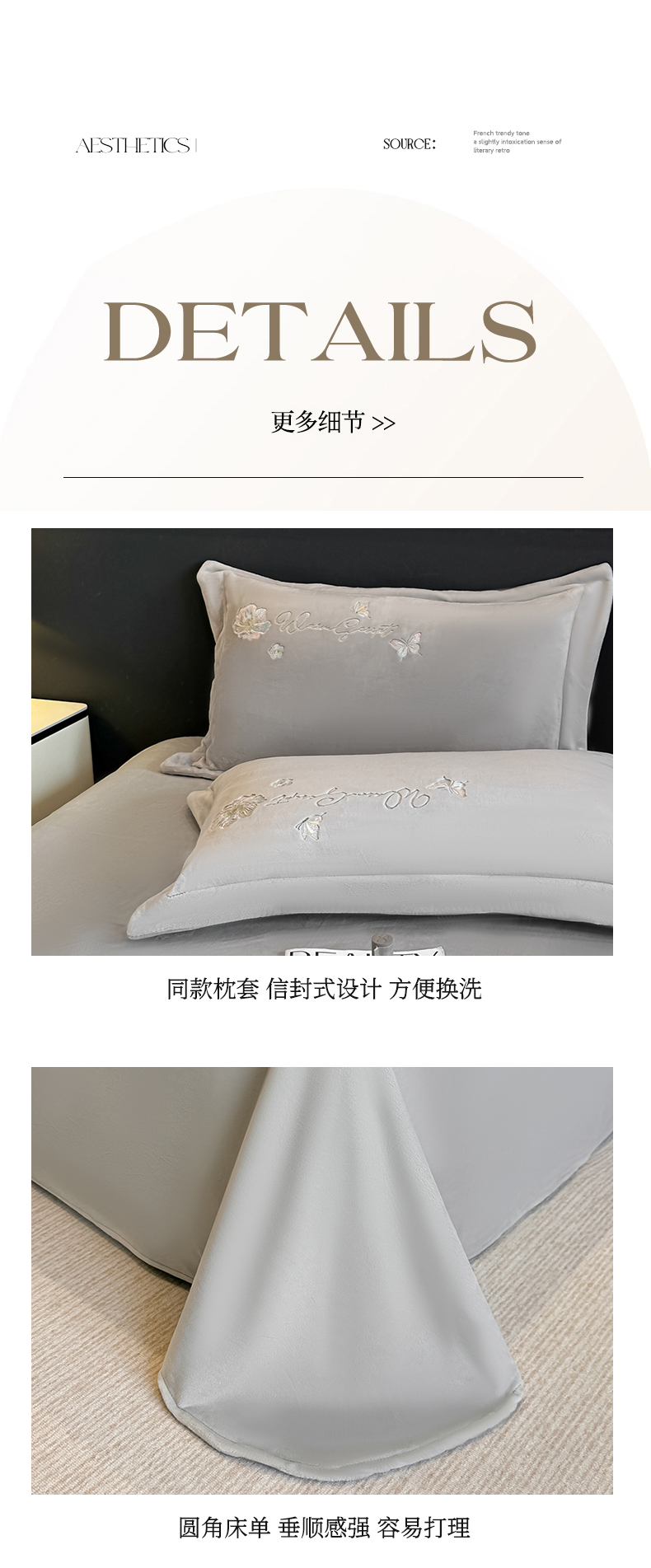 商品名称:锦铭源家纺 2025新款75D全消光超柔樱花绒绣花四件套牛奶绒四件套【有买家秀】 花颜-灰
