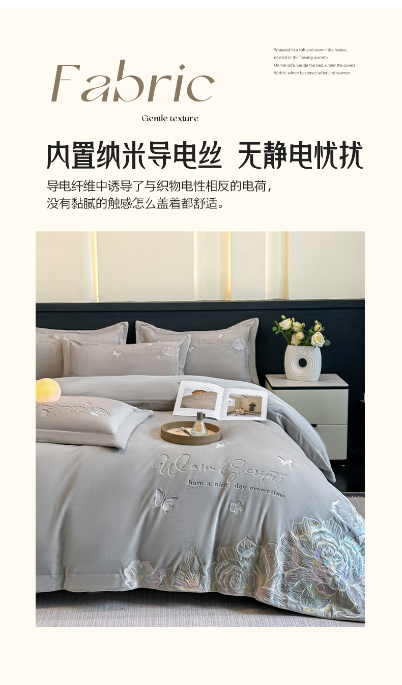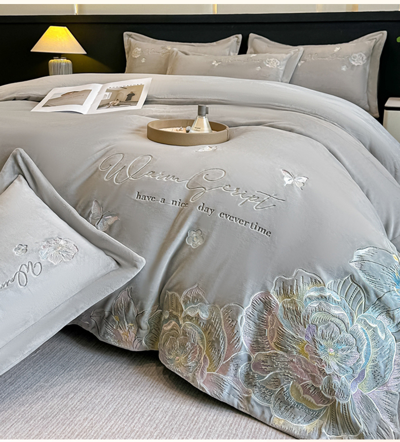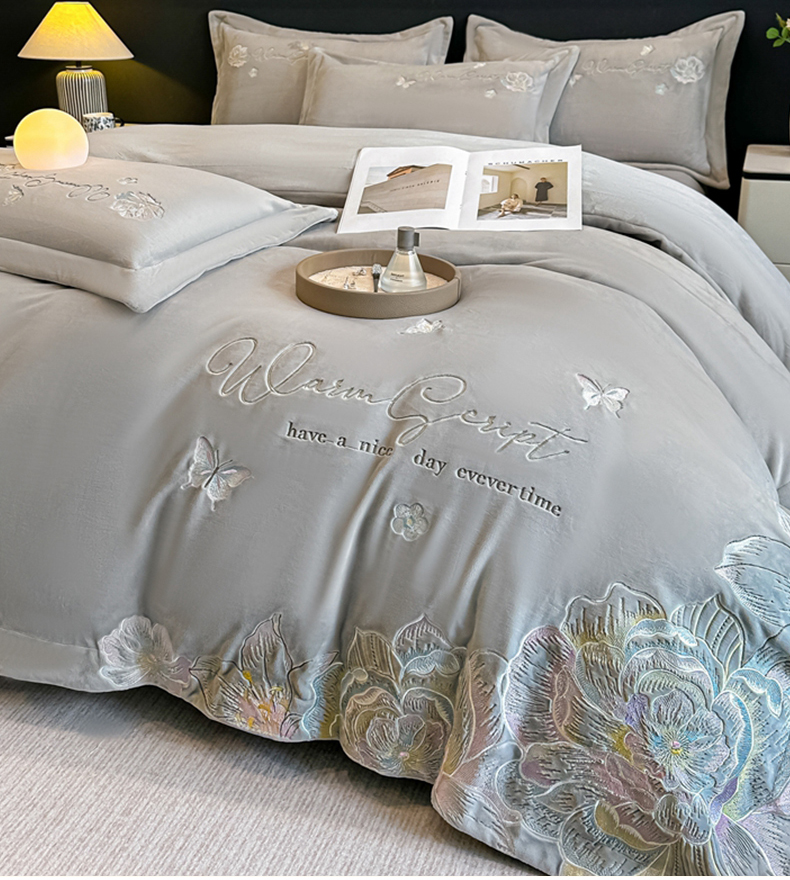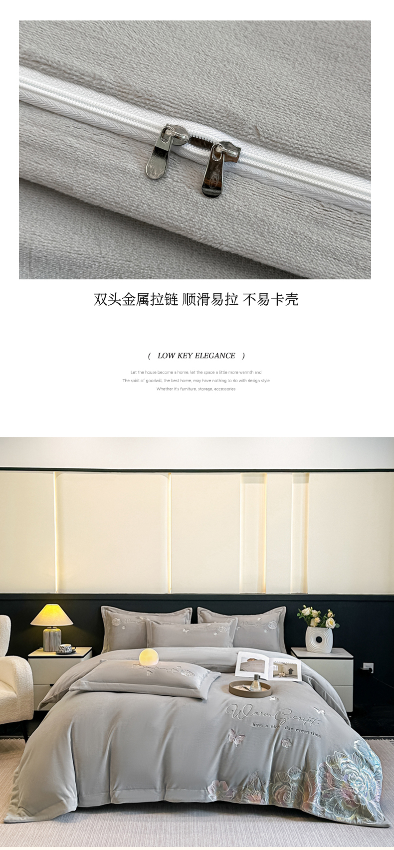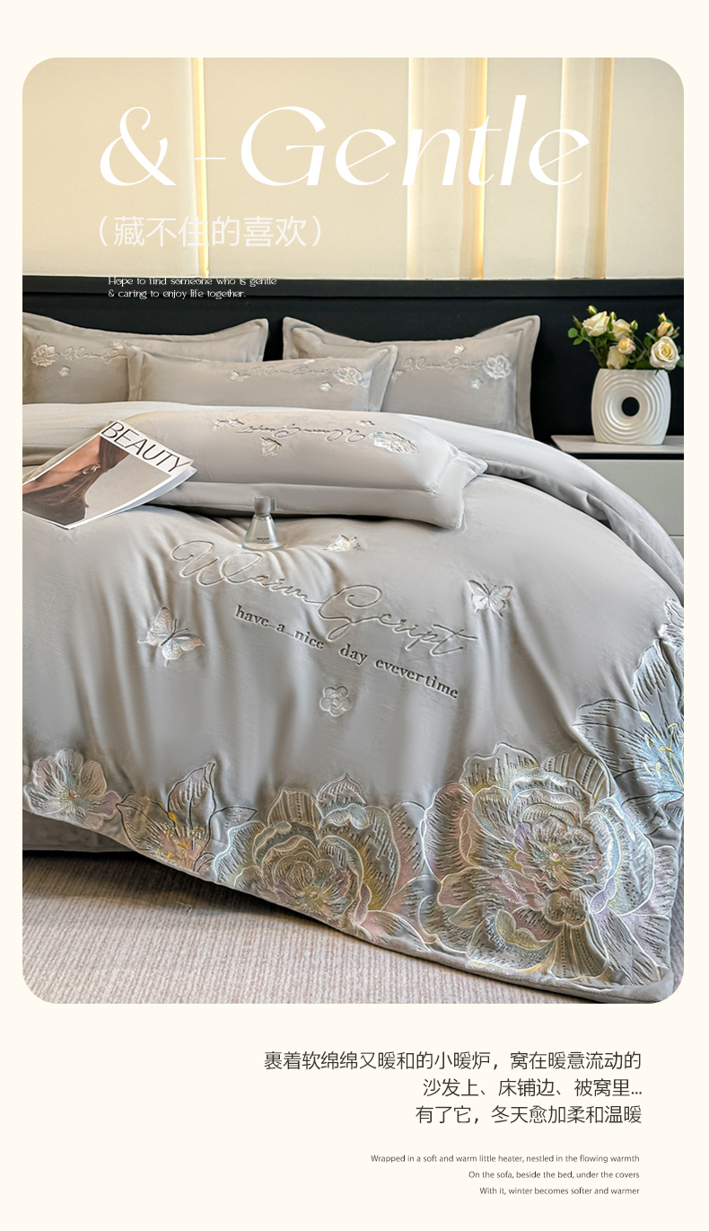 商品名称:锦铭源家纺 2025新款75D全消光超柔樱花绒绣花四件套牛奶绒四件套【有买家秀】 花颜-灰