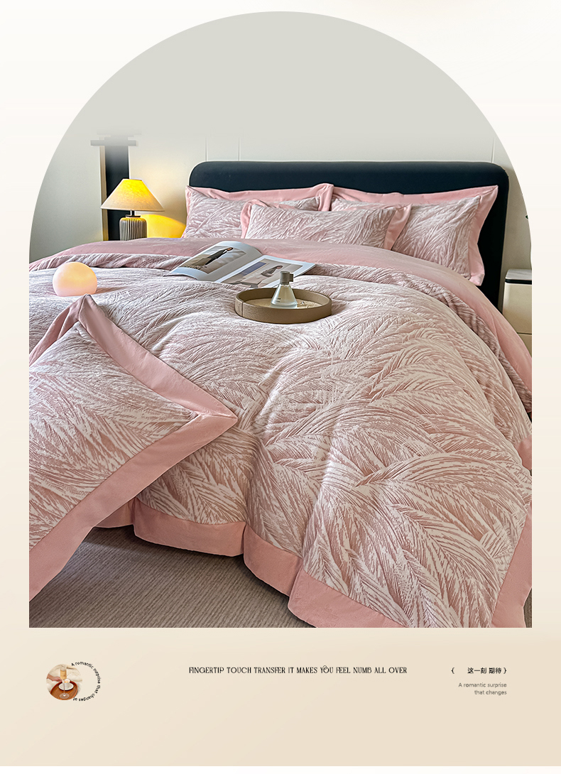 商品名称:锦铭源家纺 2025新款烂花75D全消光超柔樱花绒牛奶绒四件套拼角四件套【有买家秀】 芦影摇波-粉