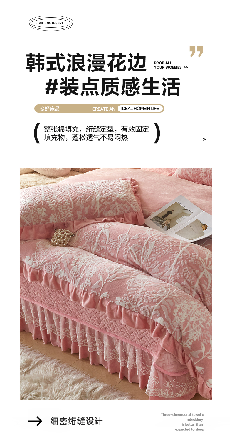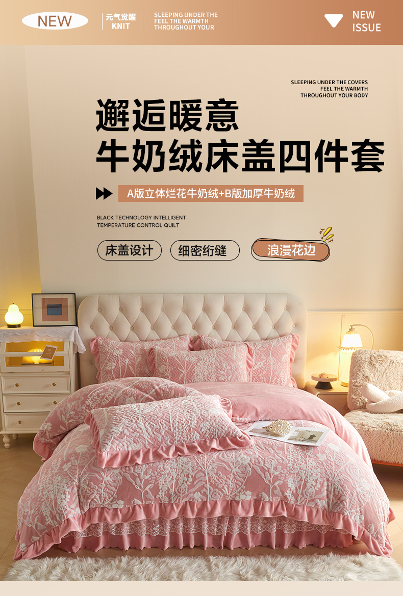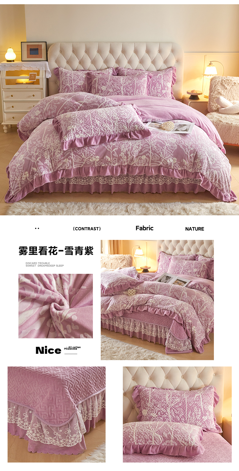 商品名称:畅畅家纺 2025新款11斤高克重新款韩版烂花牛奶绒冬季加厚床盖四件套系列 雾里看花-桃粉