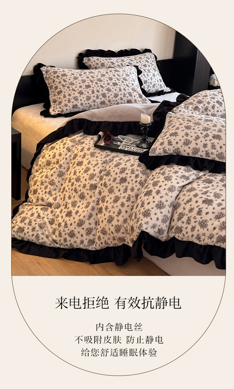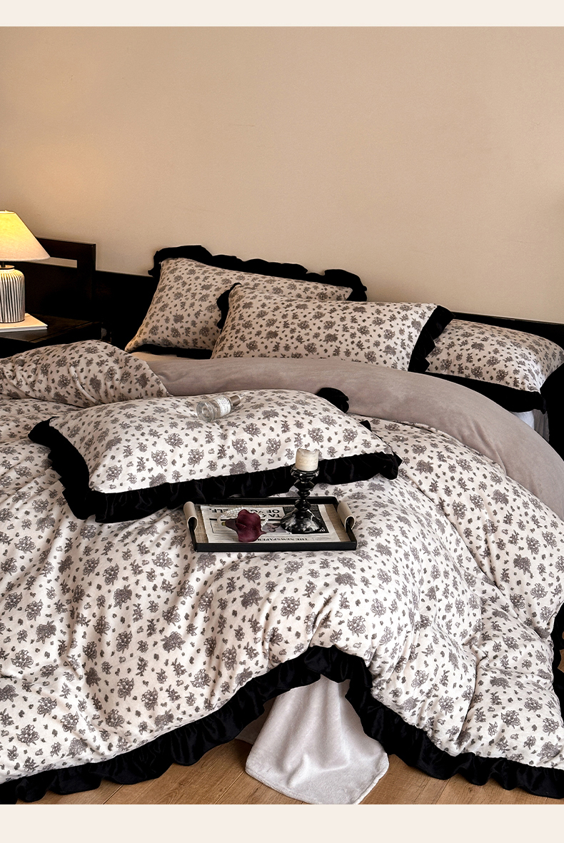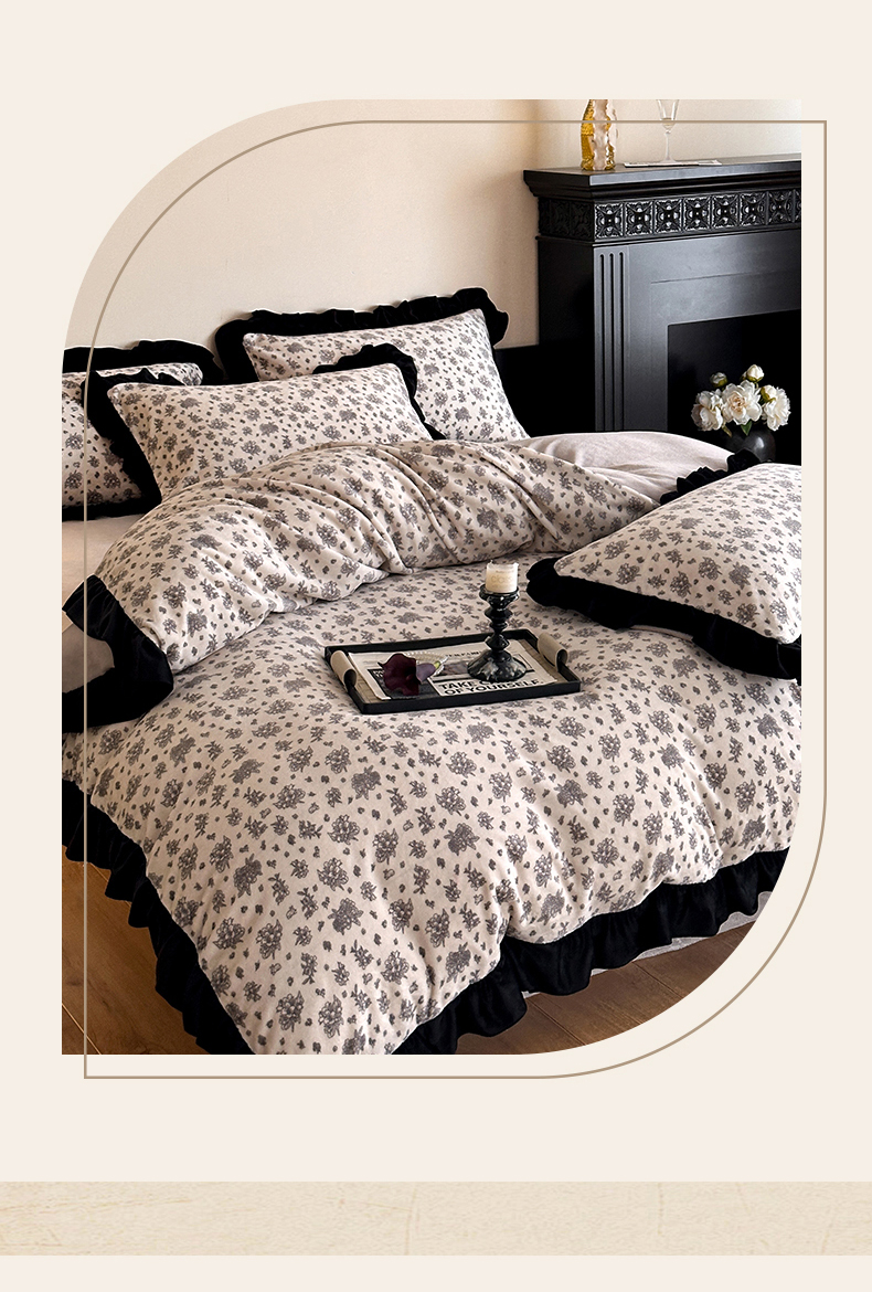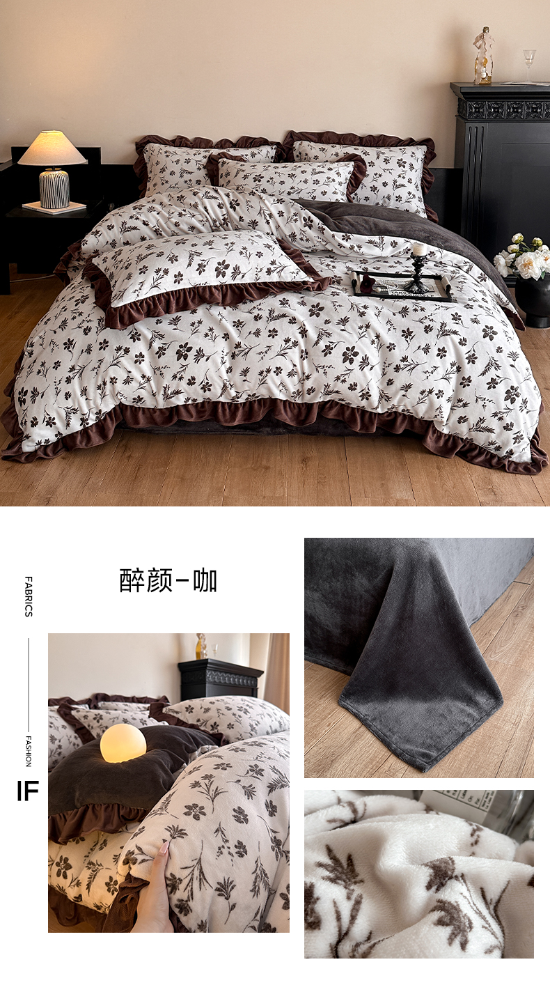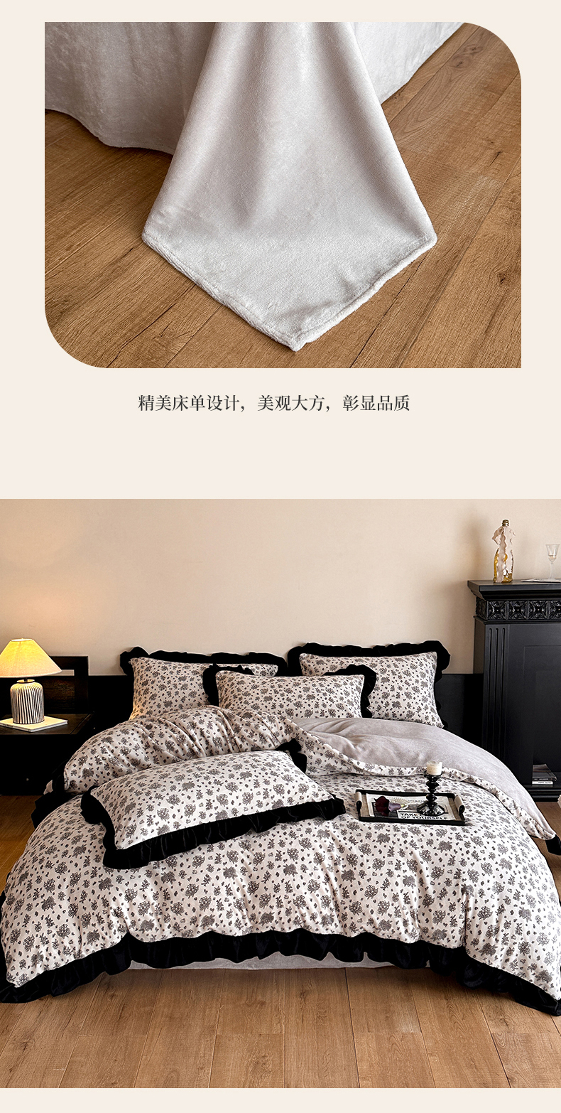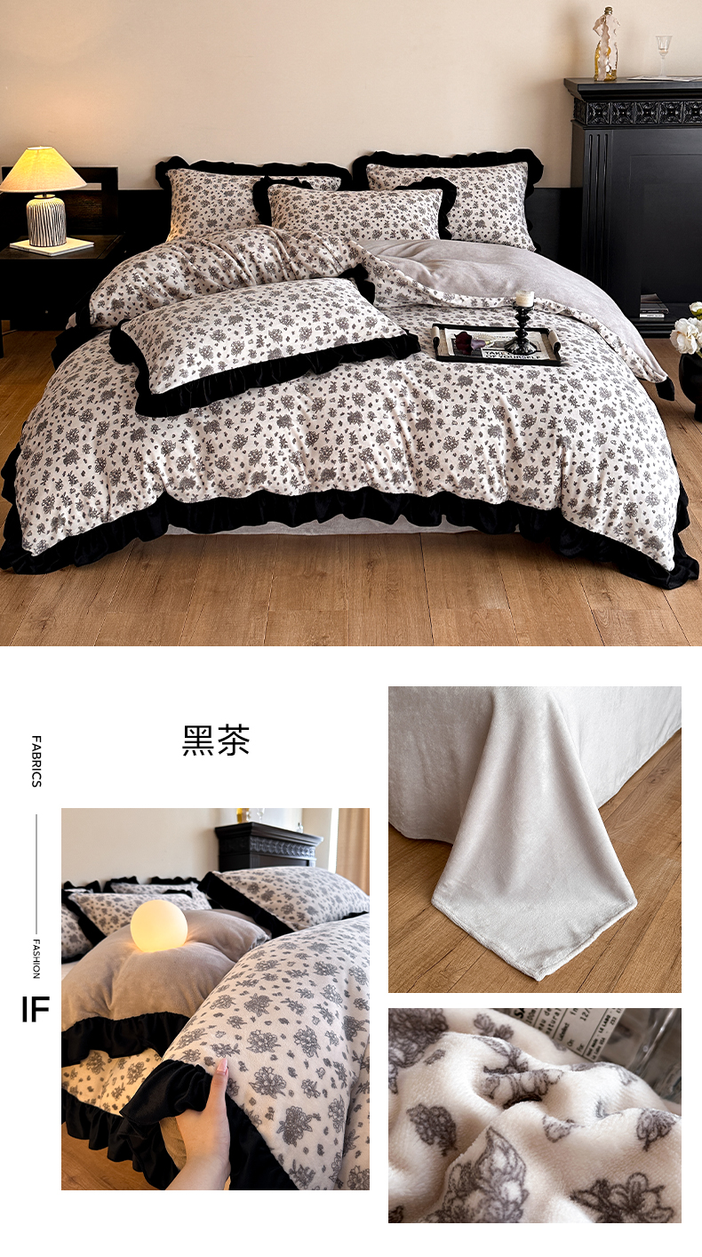 商品名称:三朵家纺 2025新款秋冬法式复古风法莱绒花边四件套 黑茶