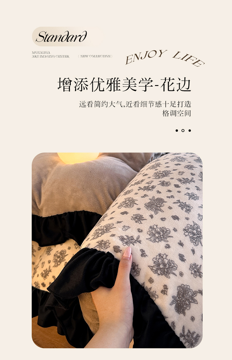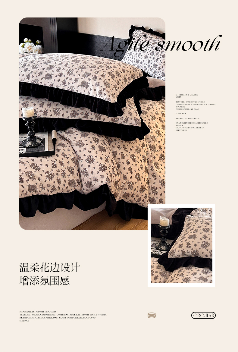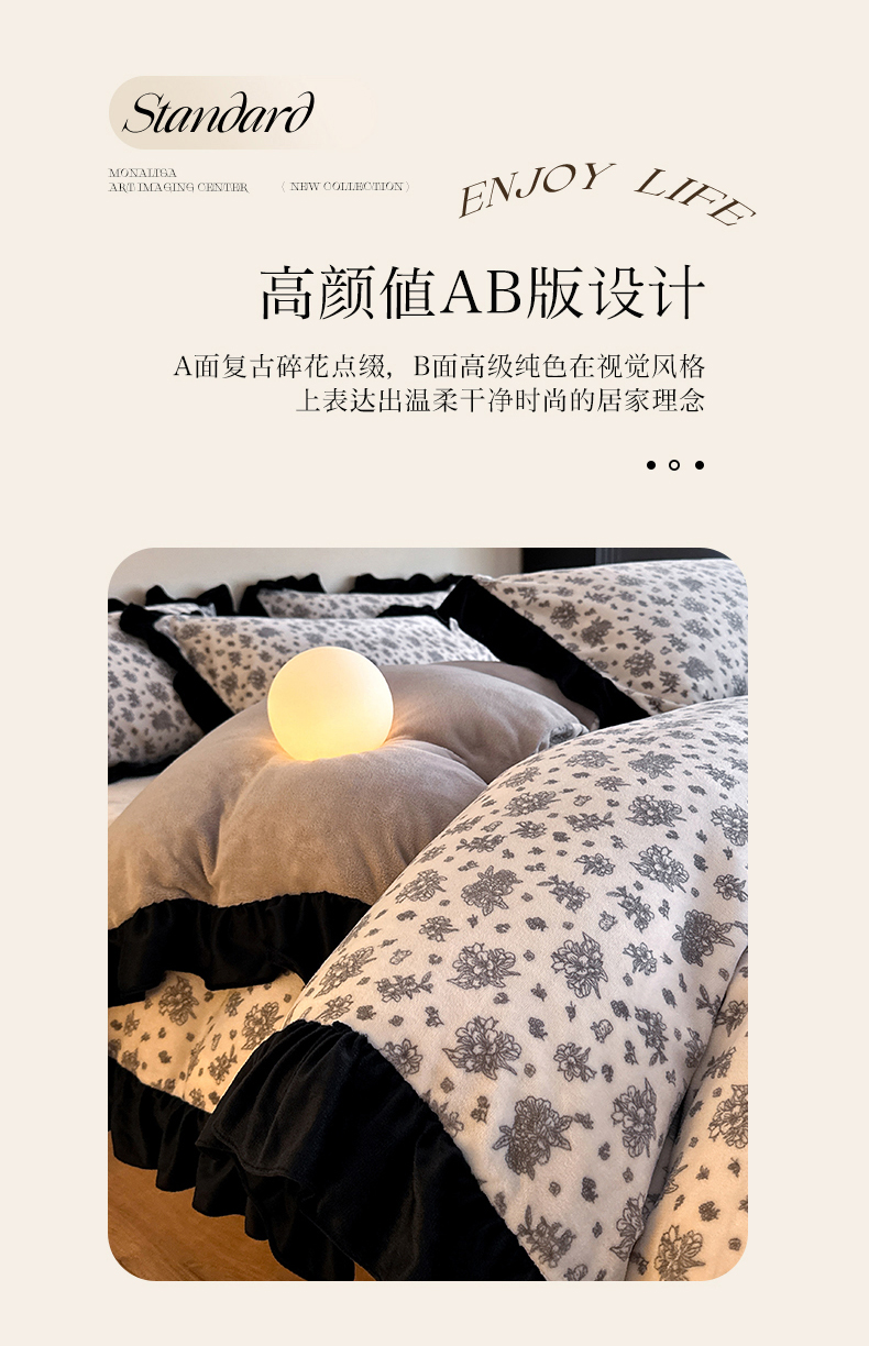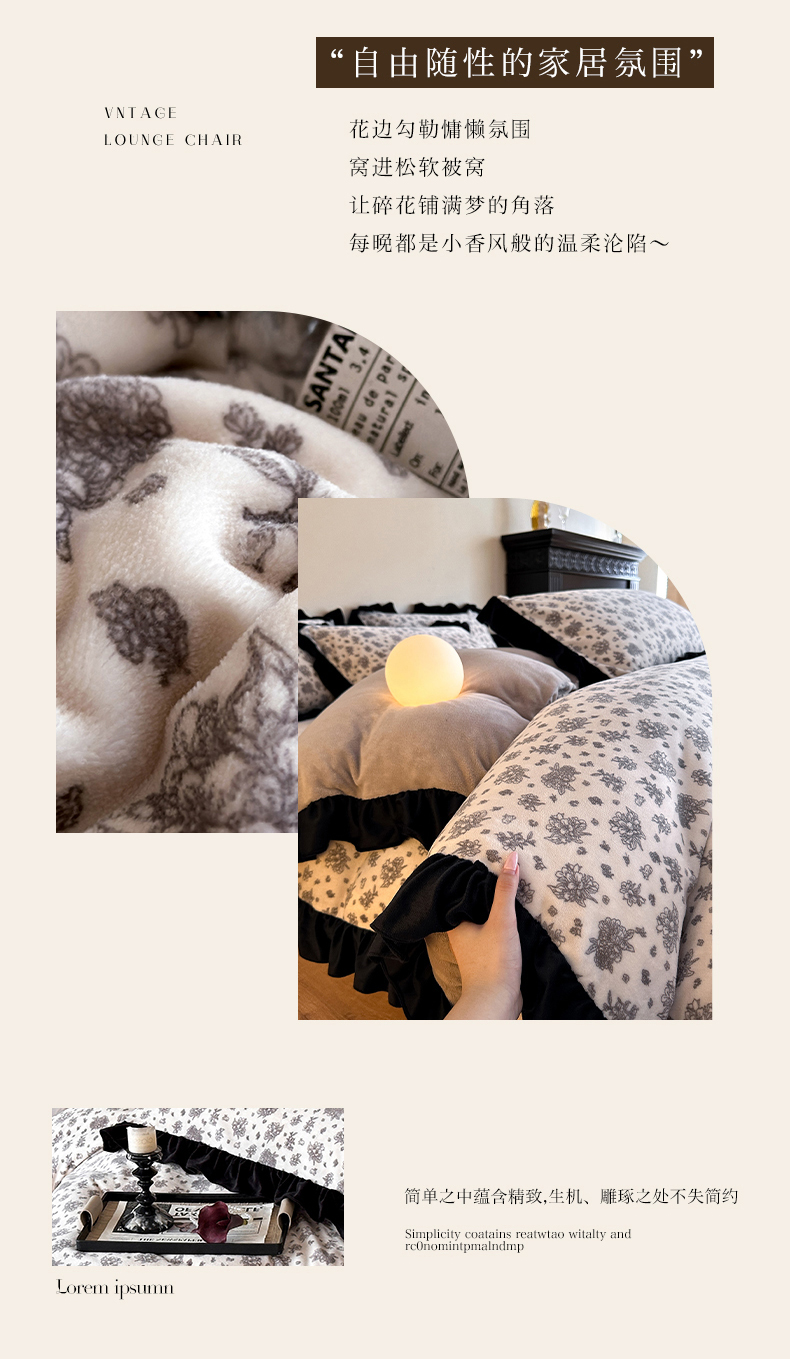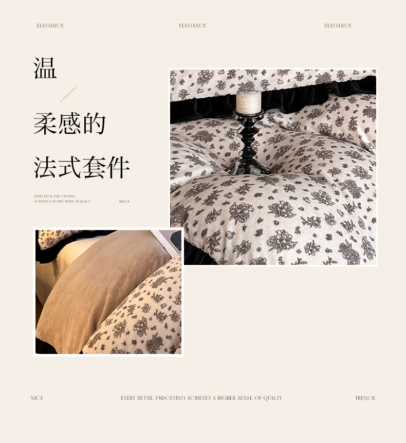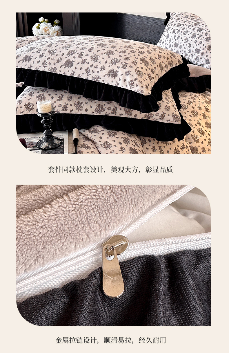 商品名称:三朵家纺 2025新款秋冬法式复古风法莱绒花边四件套 黑茶