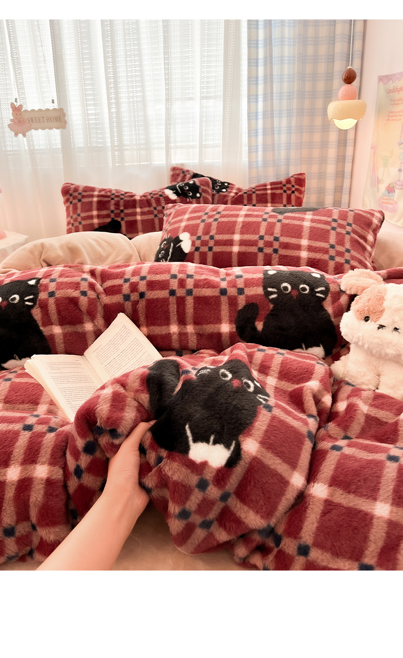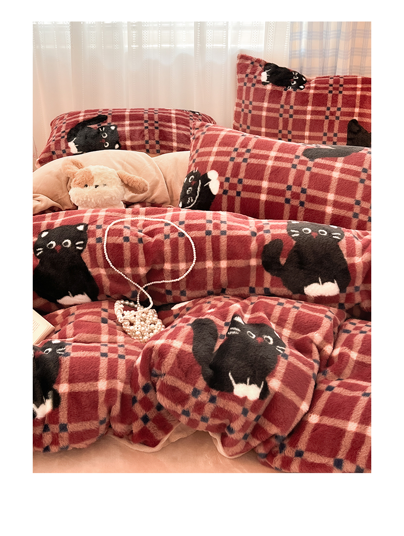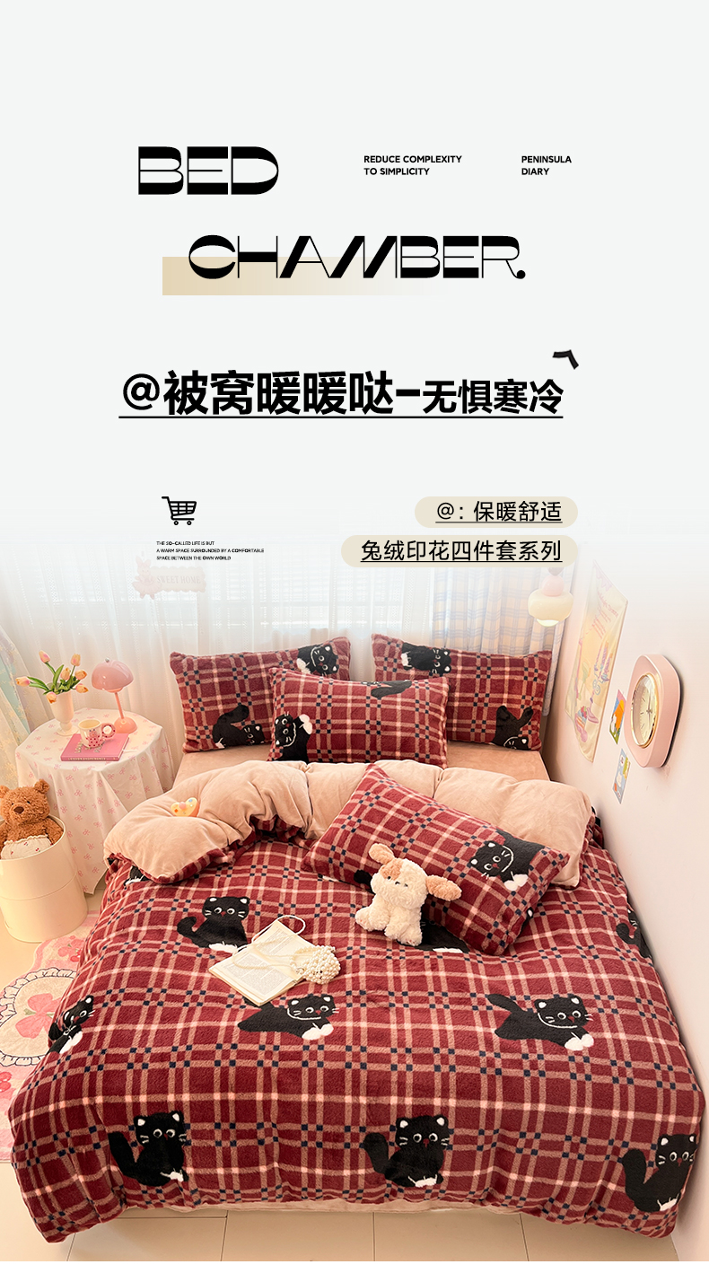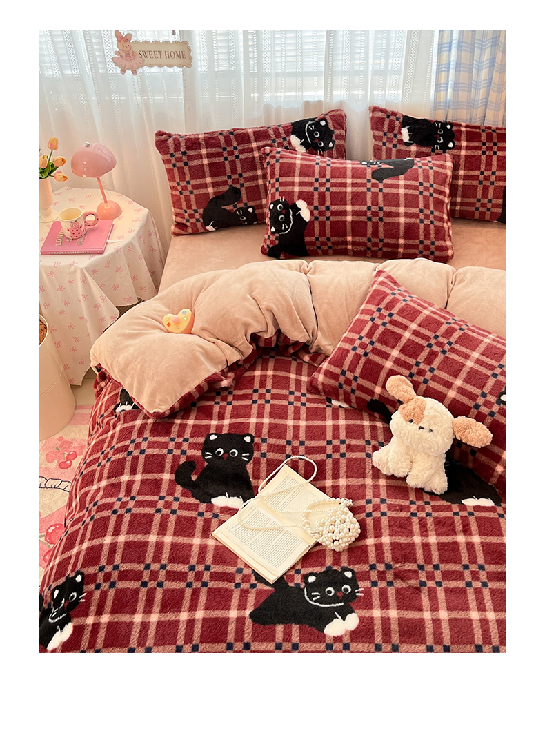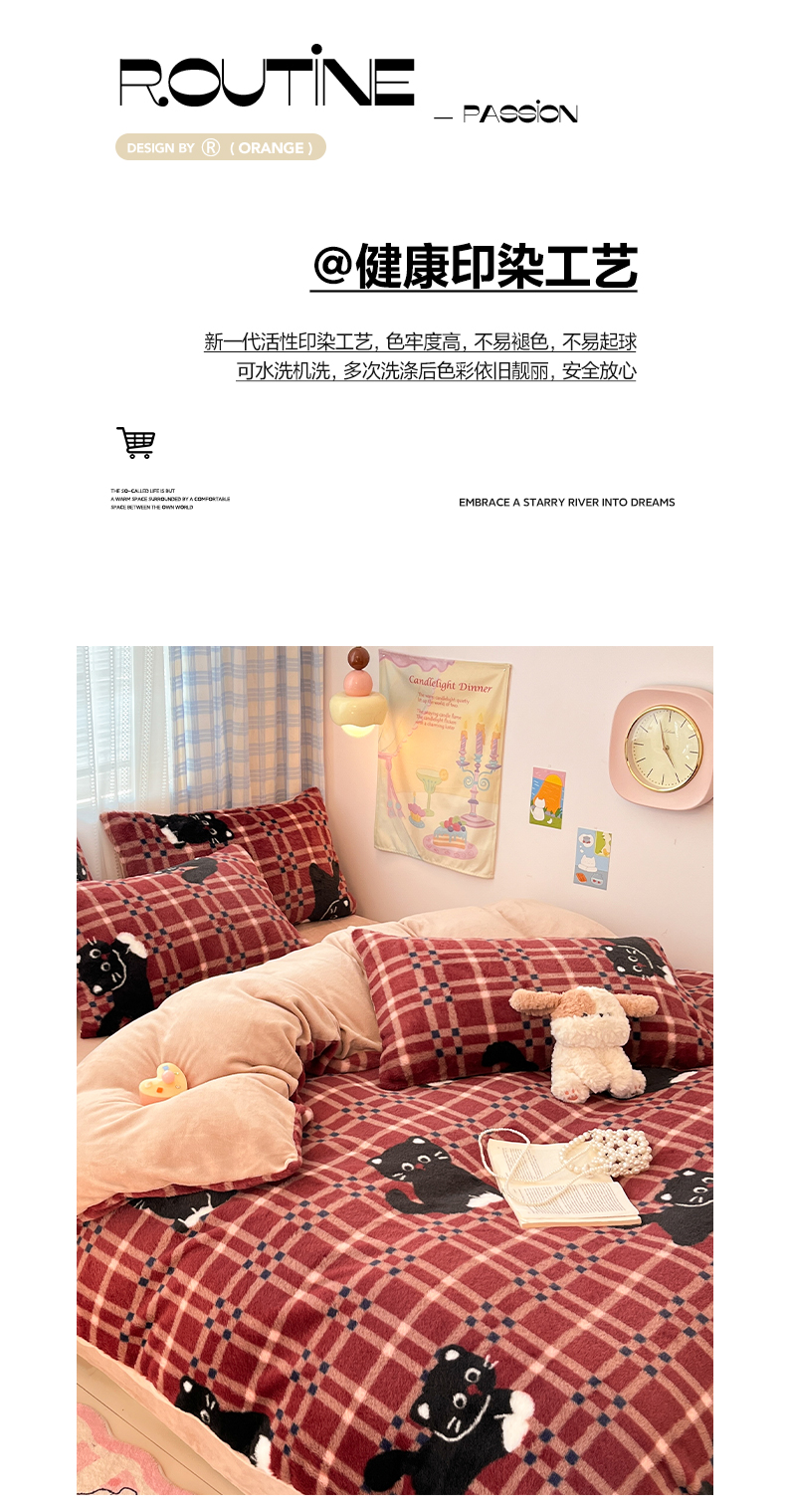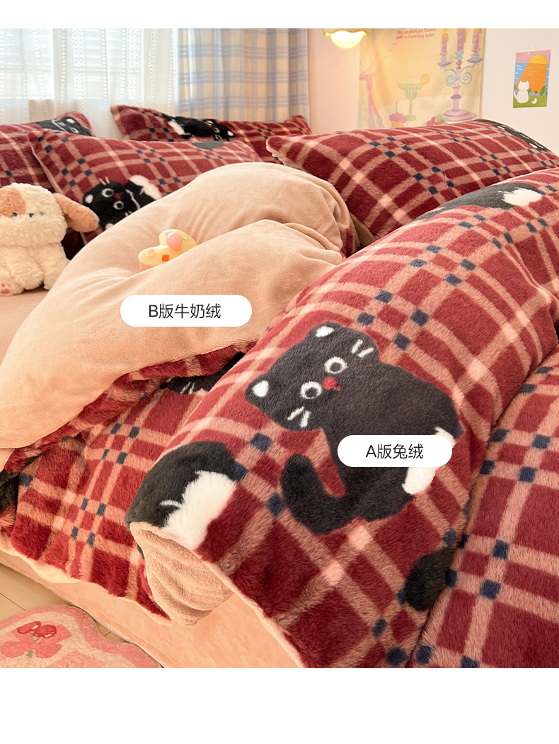 雅居纺家纺 2025新款保暖舒适兔绒印花四件套 幸福小黑猫