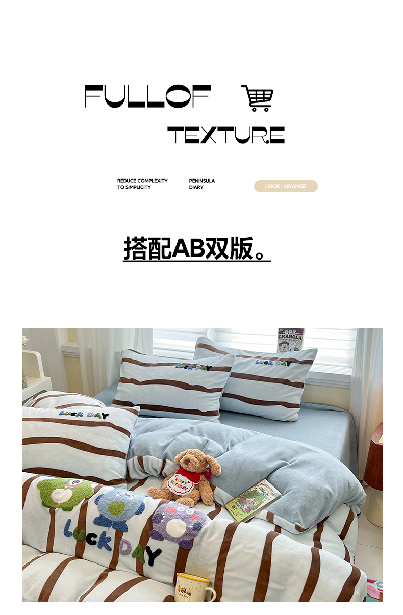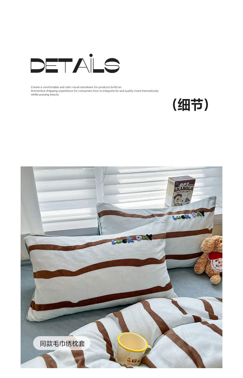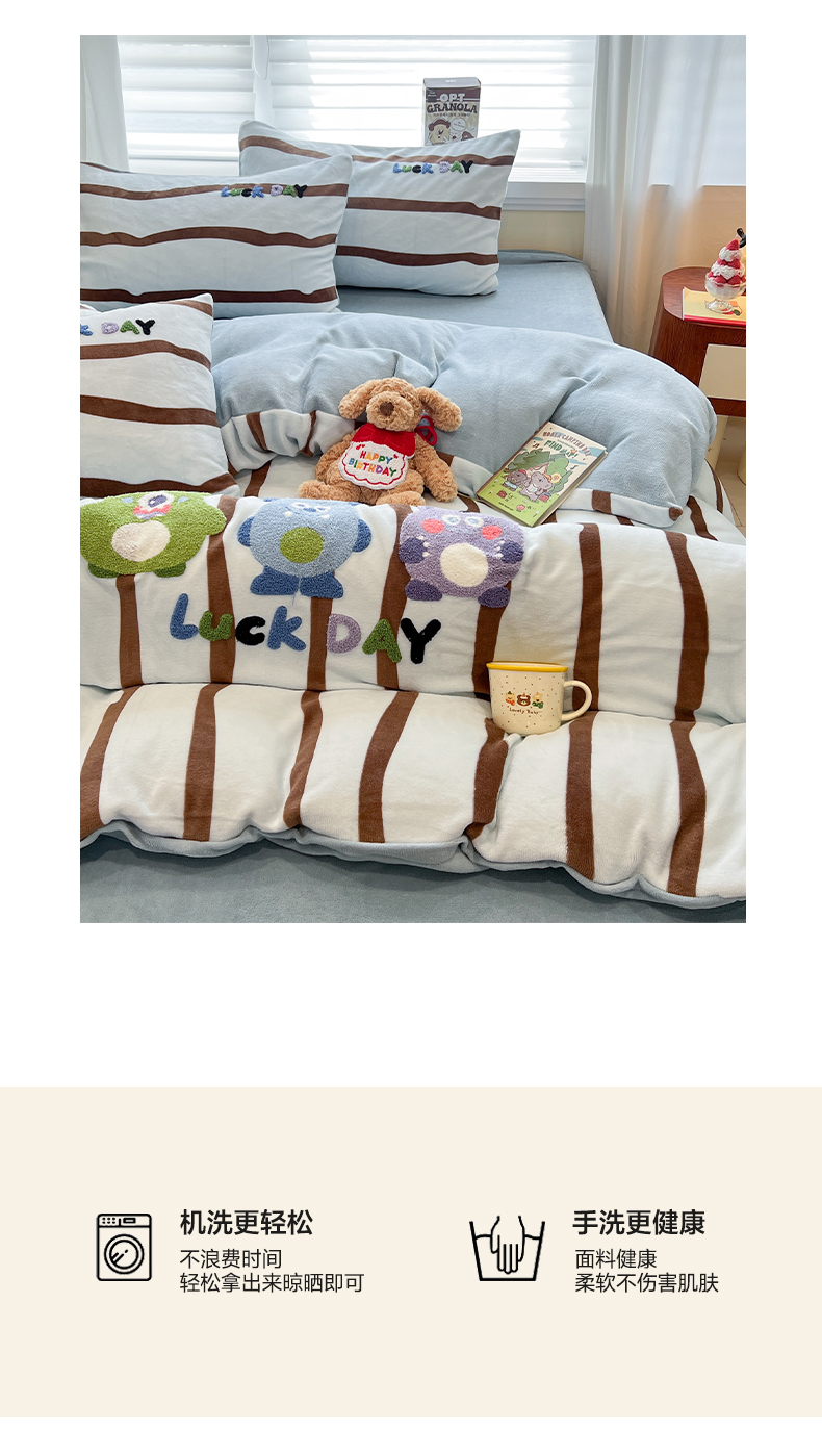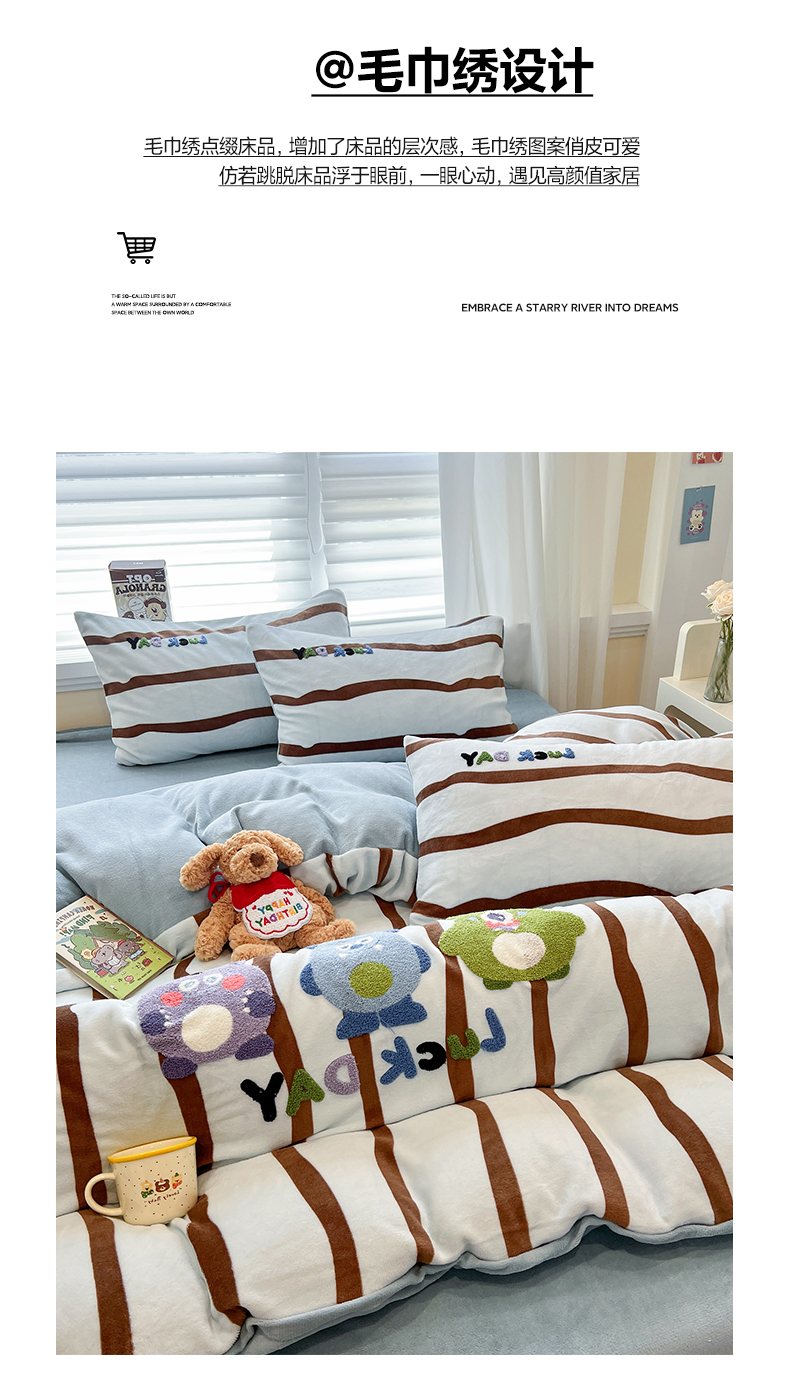 商品名称:雅居纺家纺 2025新款加厚牛奶绒毛巾绣卡通四件套 幸运小小怪