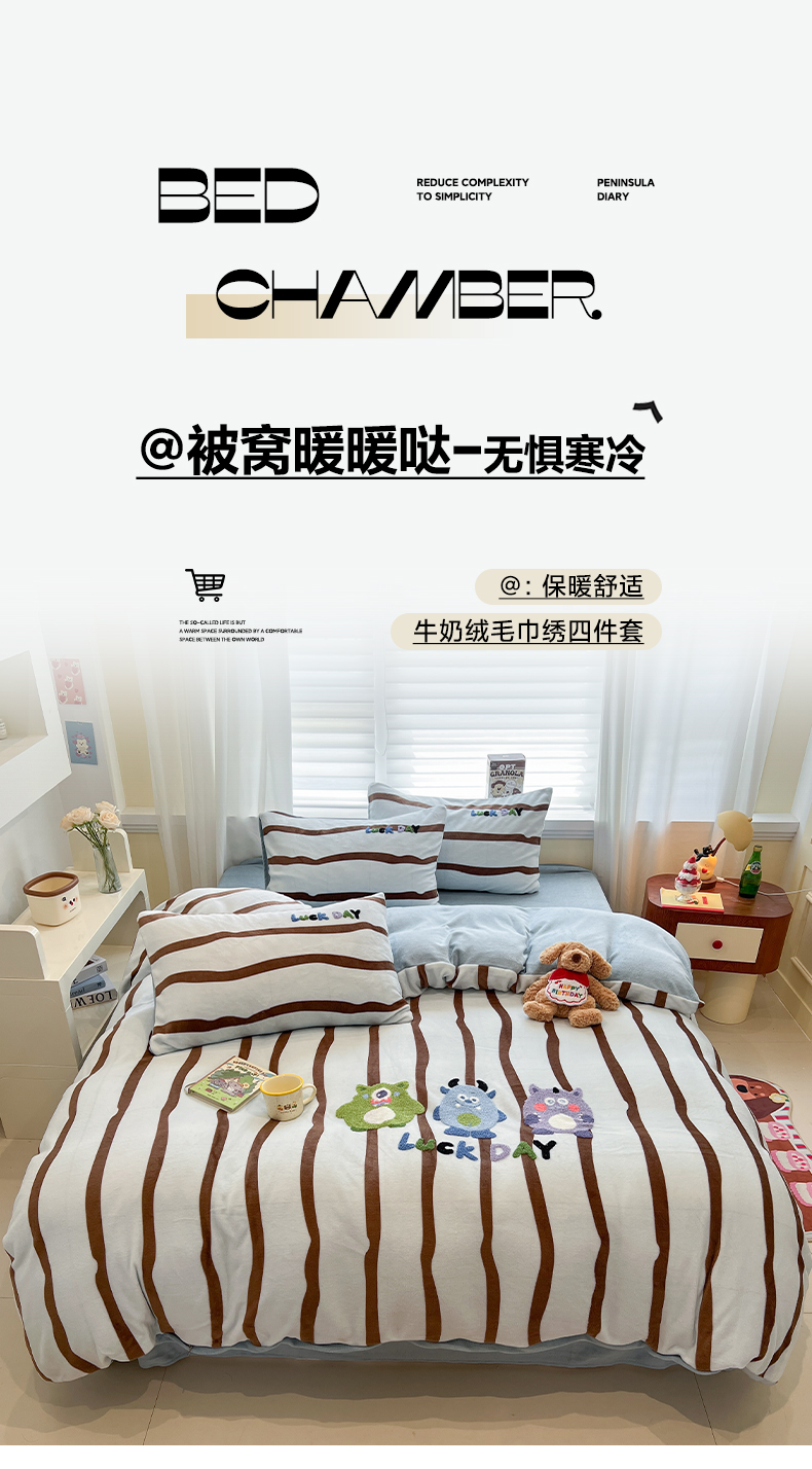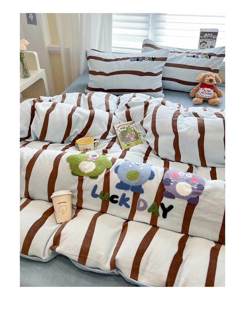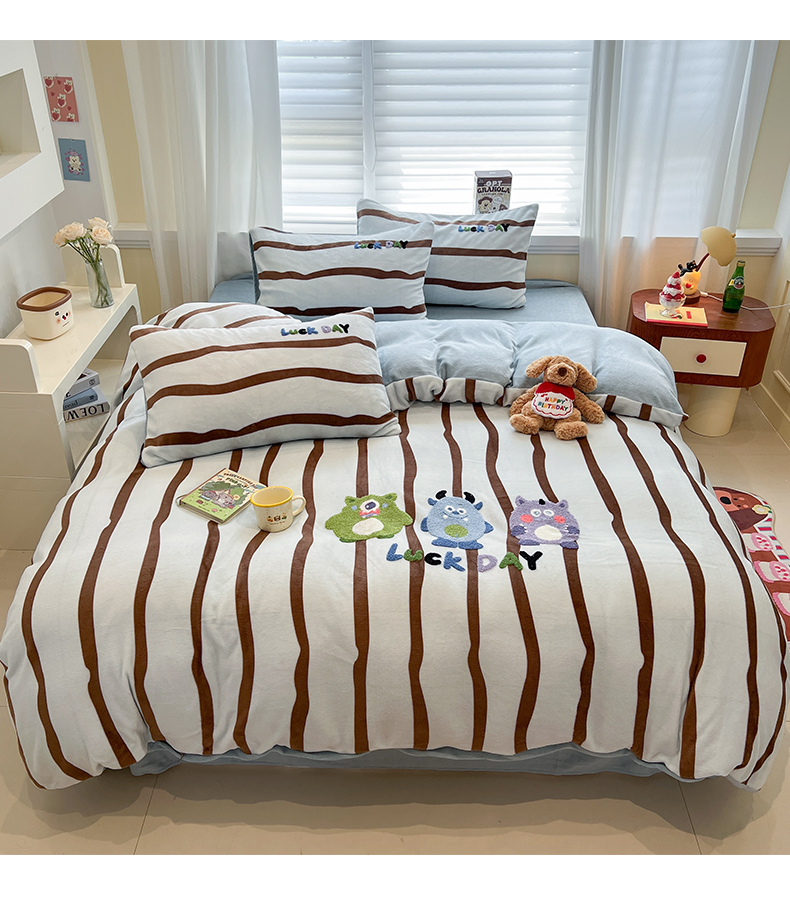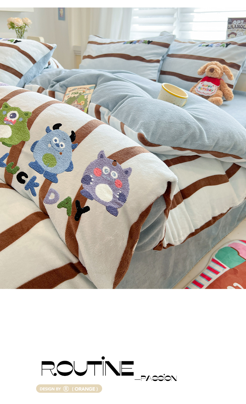 雅居纺家纺 2025新款加厚牛奶绒毛巾绣卡通四件套 幸运小小怪