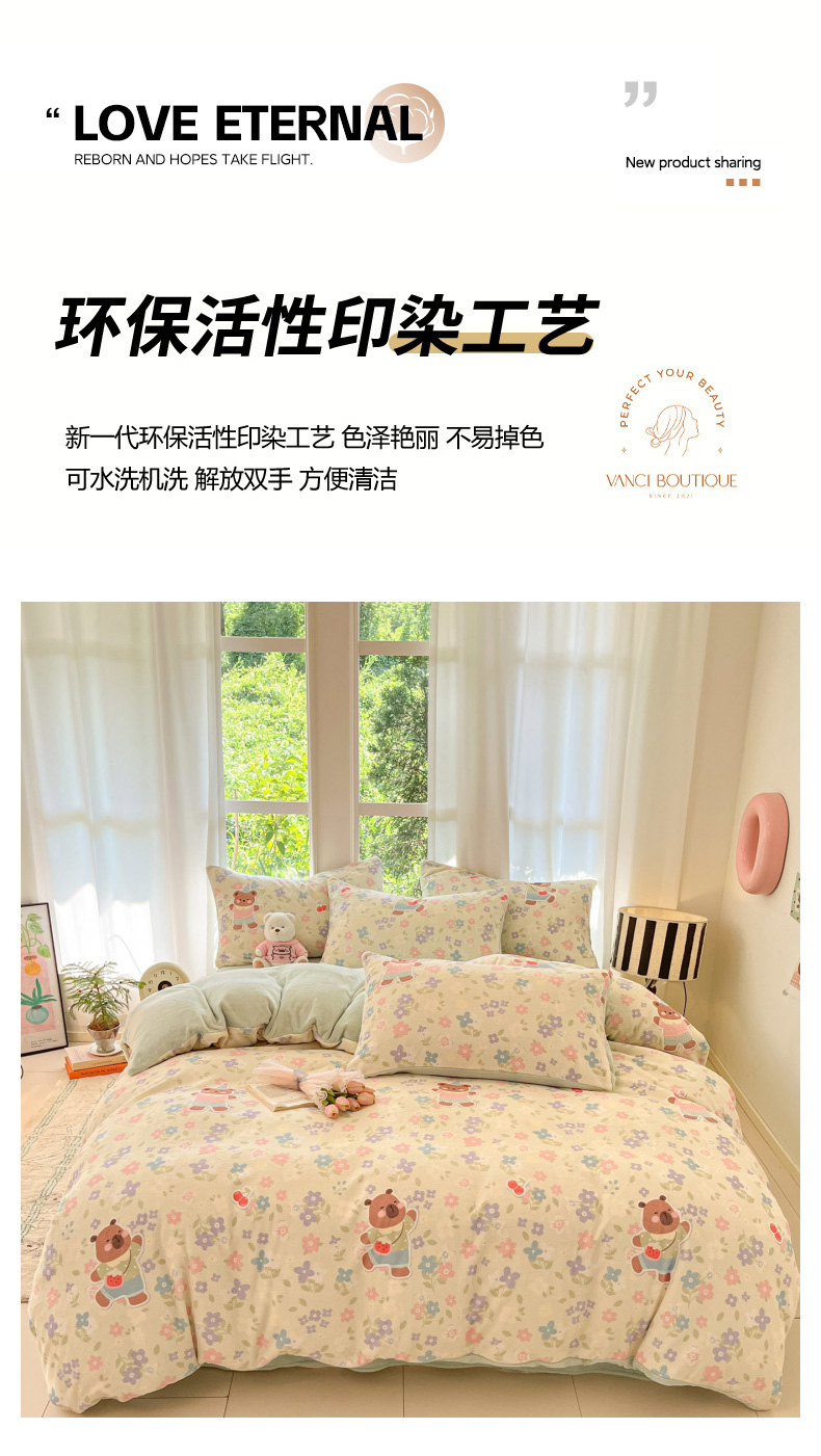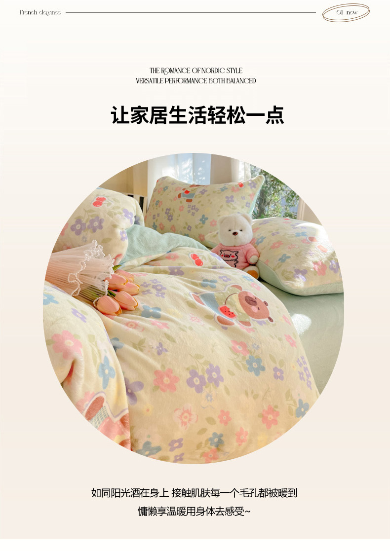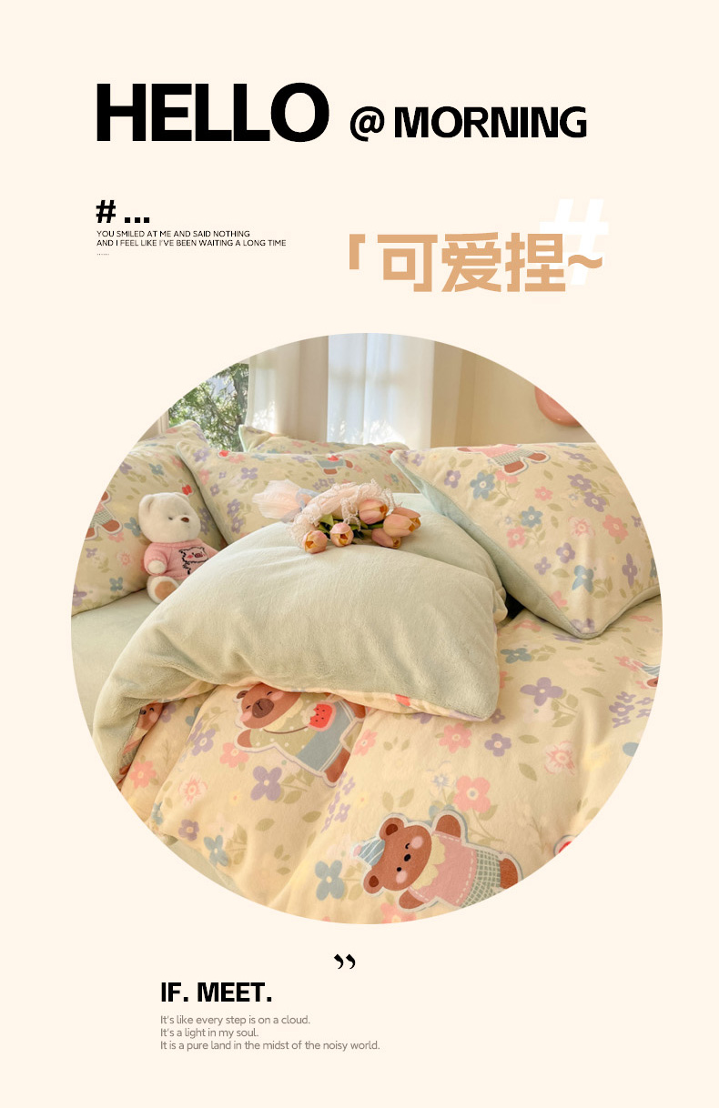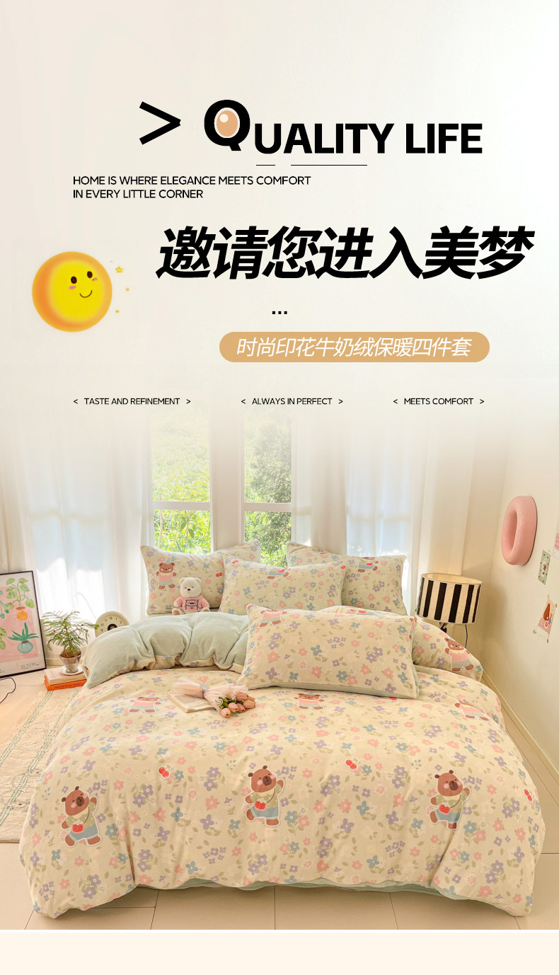 当前位置: 91家纺网 > 商品网购 > 床品套件 > 四件套 > 牛奶绒四件套 > 慕澄家纺 2025新款小清新牛奶绒印花四件套 快乐卡皮