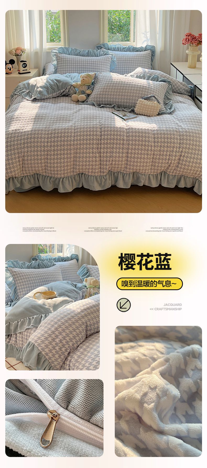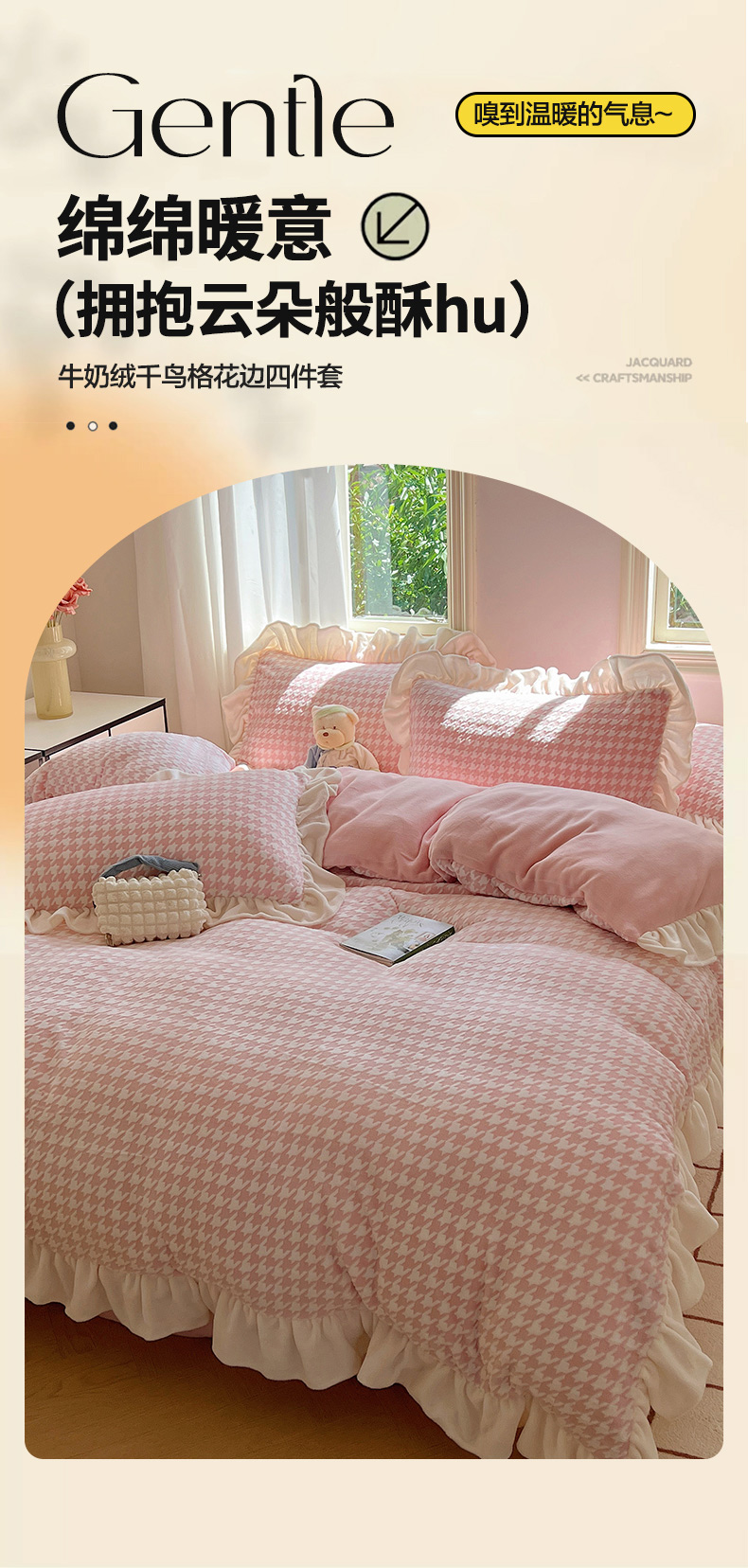 当前位置: 91家纺网 > 商品网购 > 床品套件 > 四件套 > 牛奶绒四件套 > 轻奢坊 2025新款牛奶绒千鸟格烂花花边款四件套-场景二 奶酪绿