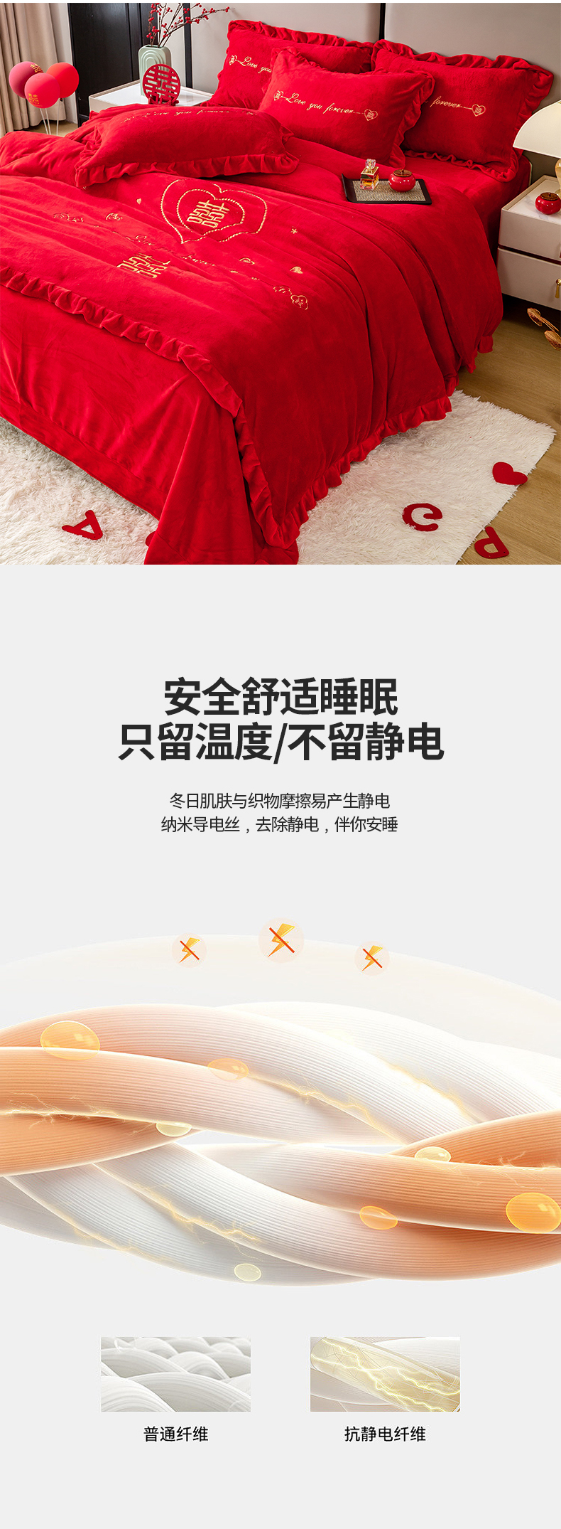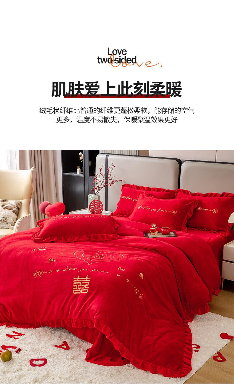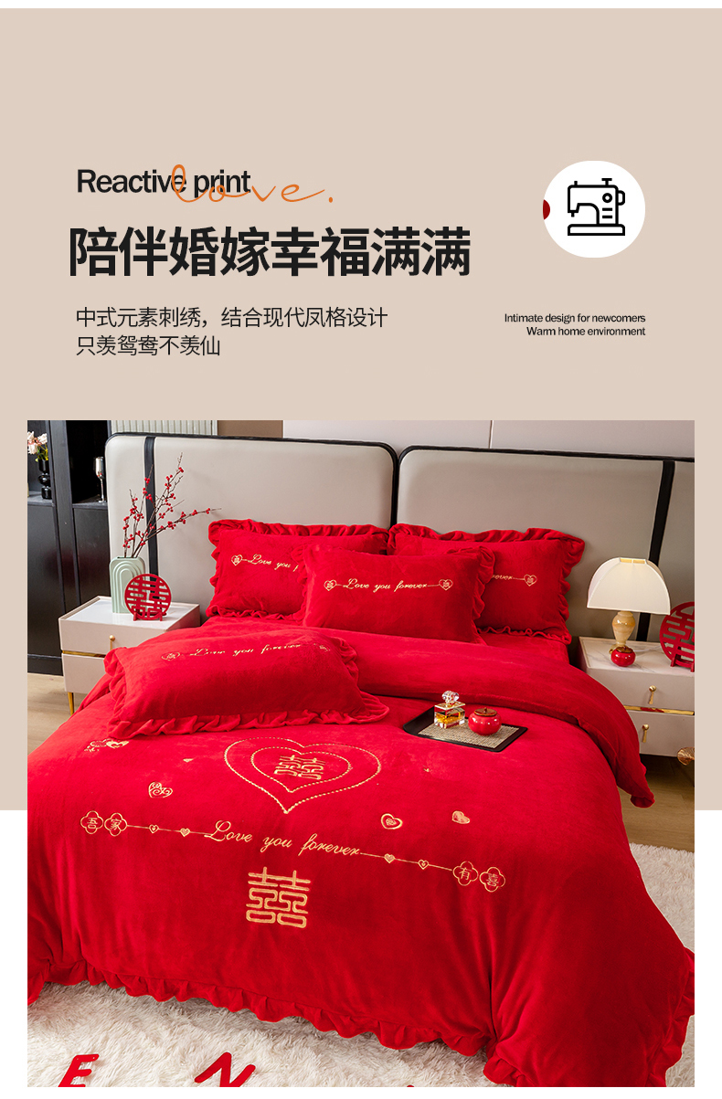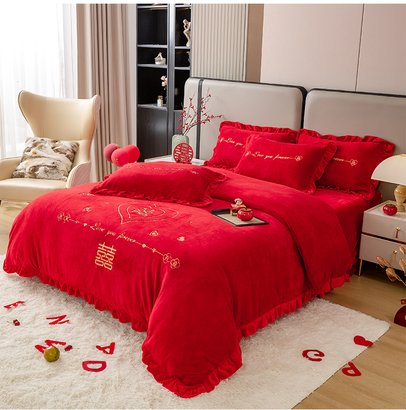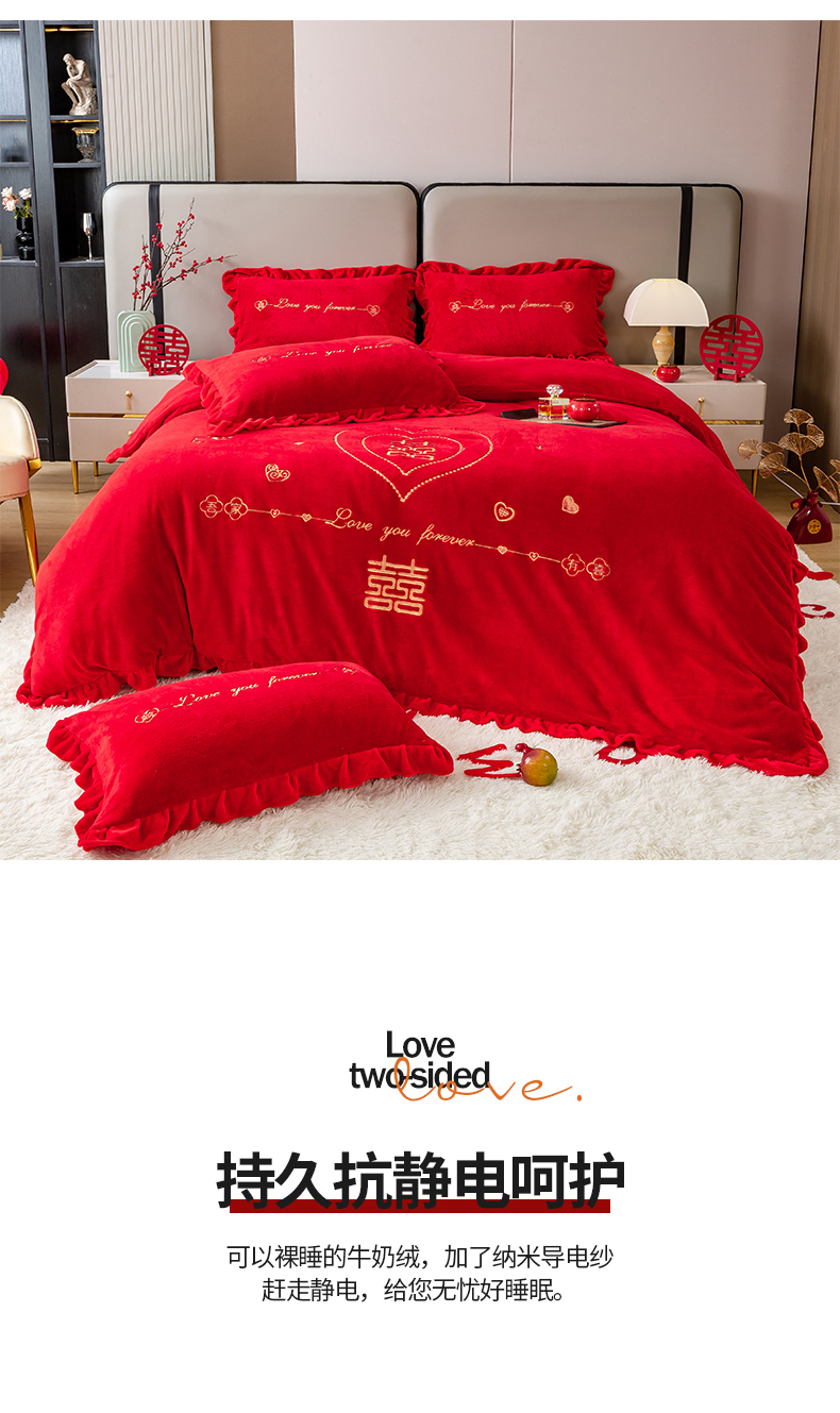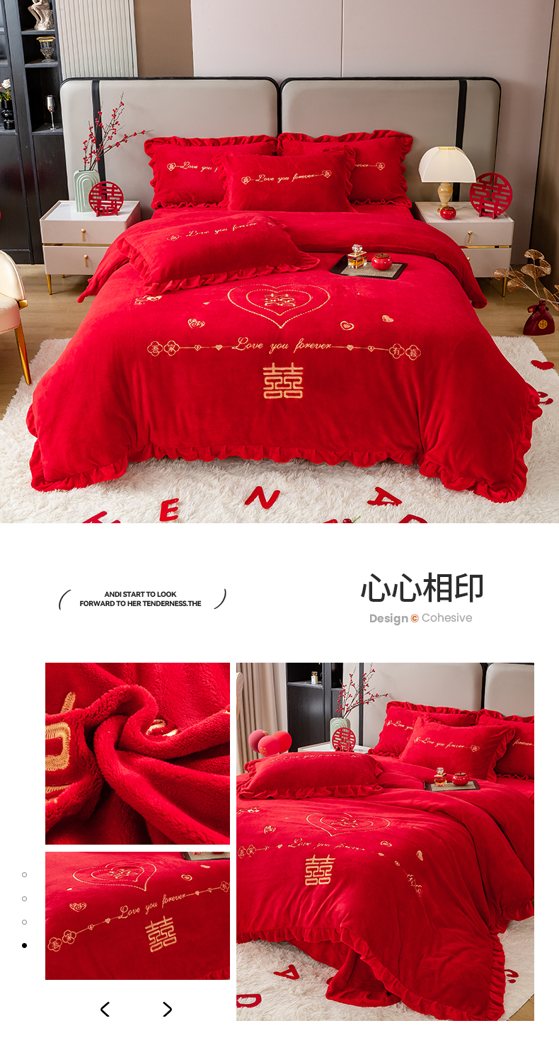 商品名称:银石 2025新款230克全消光牛奶绒婚庆大红高克重四件套 心心相印