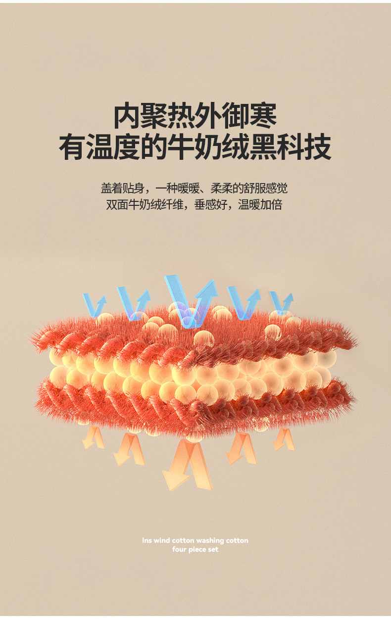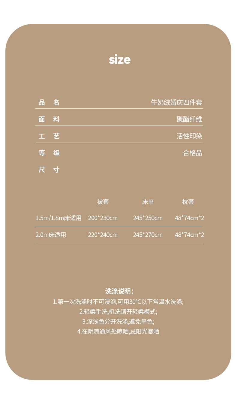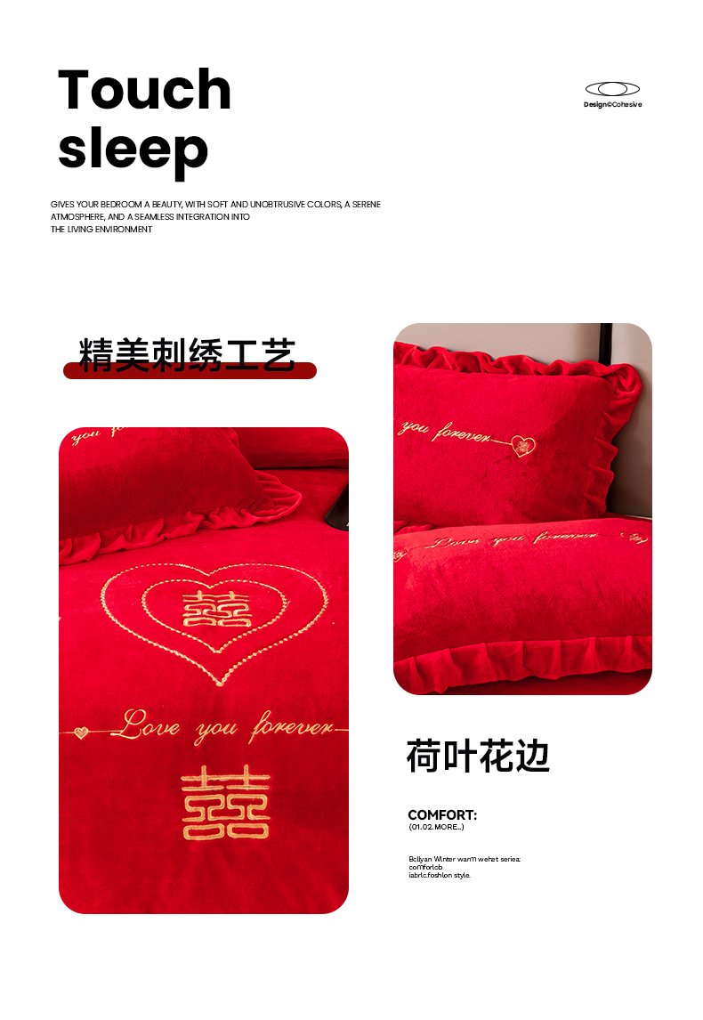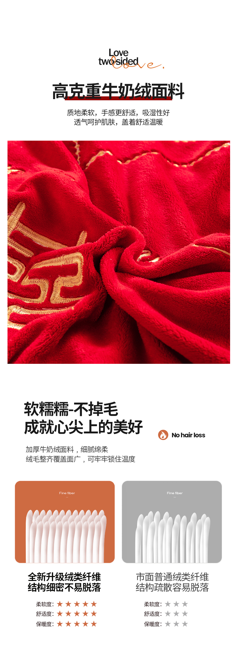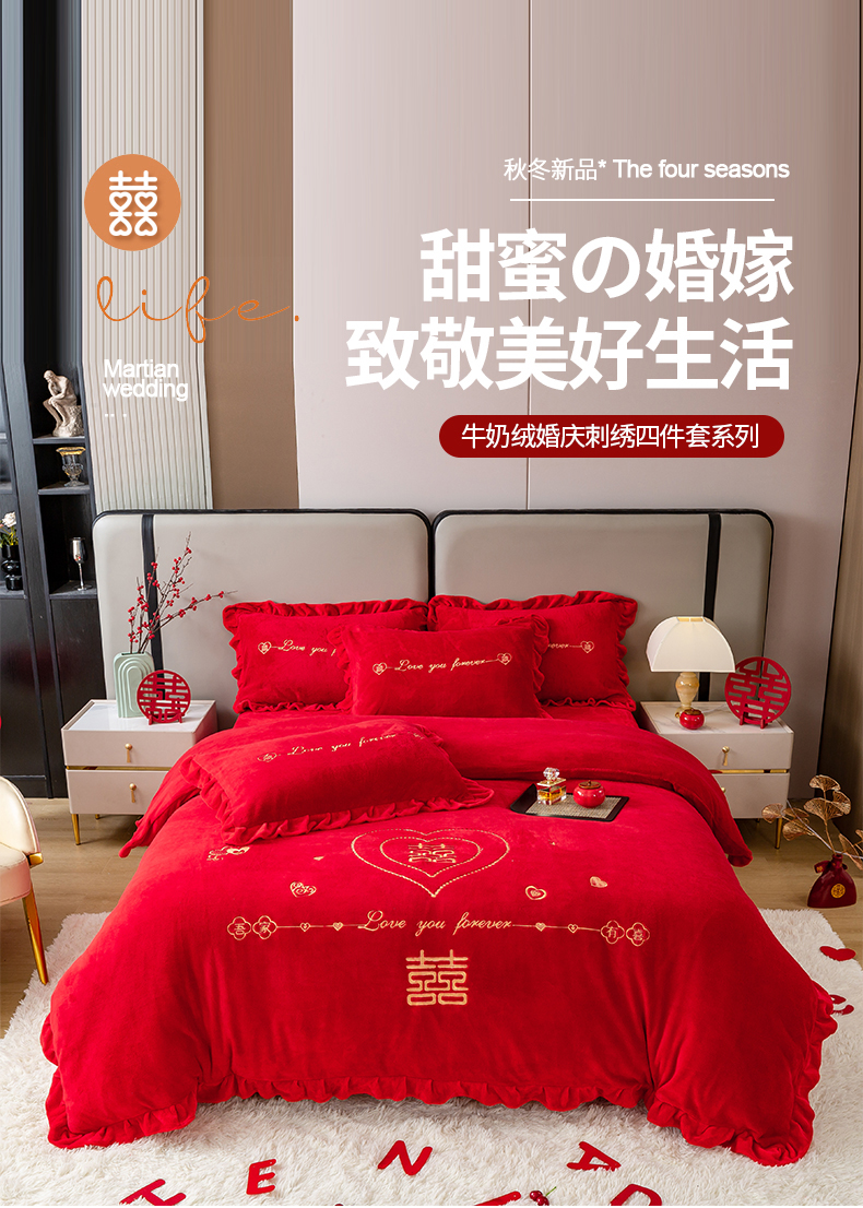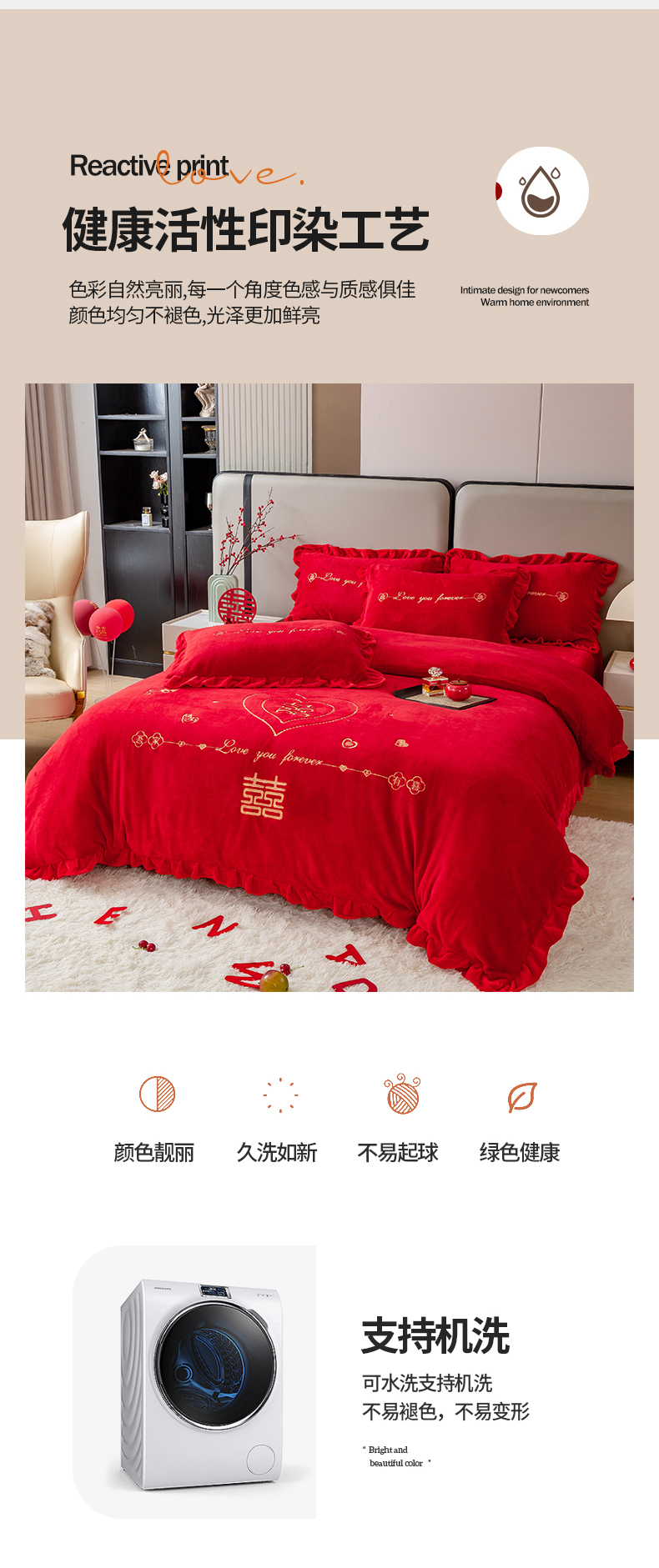 商品名称:银石 2025新款230克全消光牛奶绒婚庆大红高克重四件套 心心相印