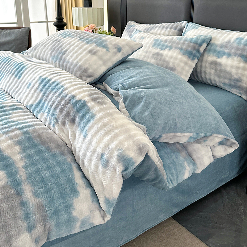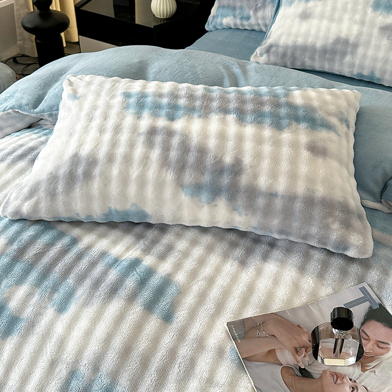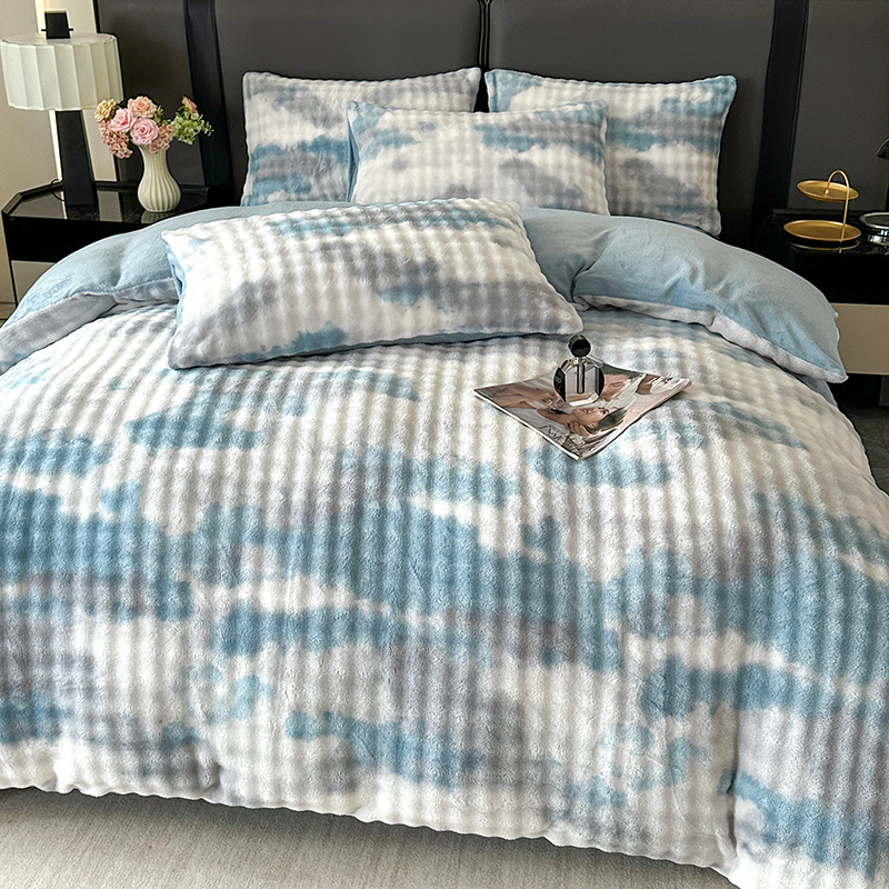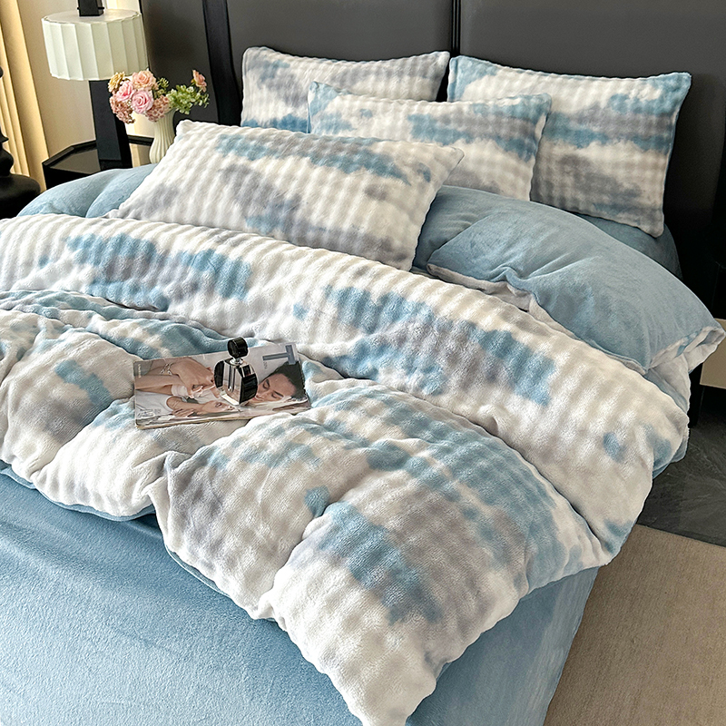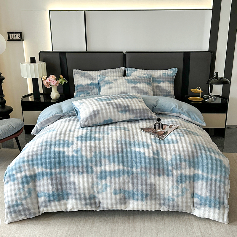商品名称:柏薇 2025新款炫彩仿兔毛绒大泡泡绒印大理石纹高克重绒四件套 炫彩泡泡蓝
