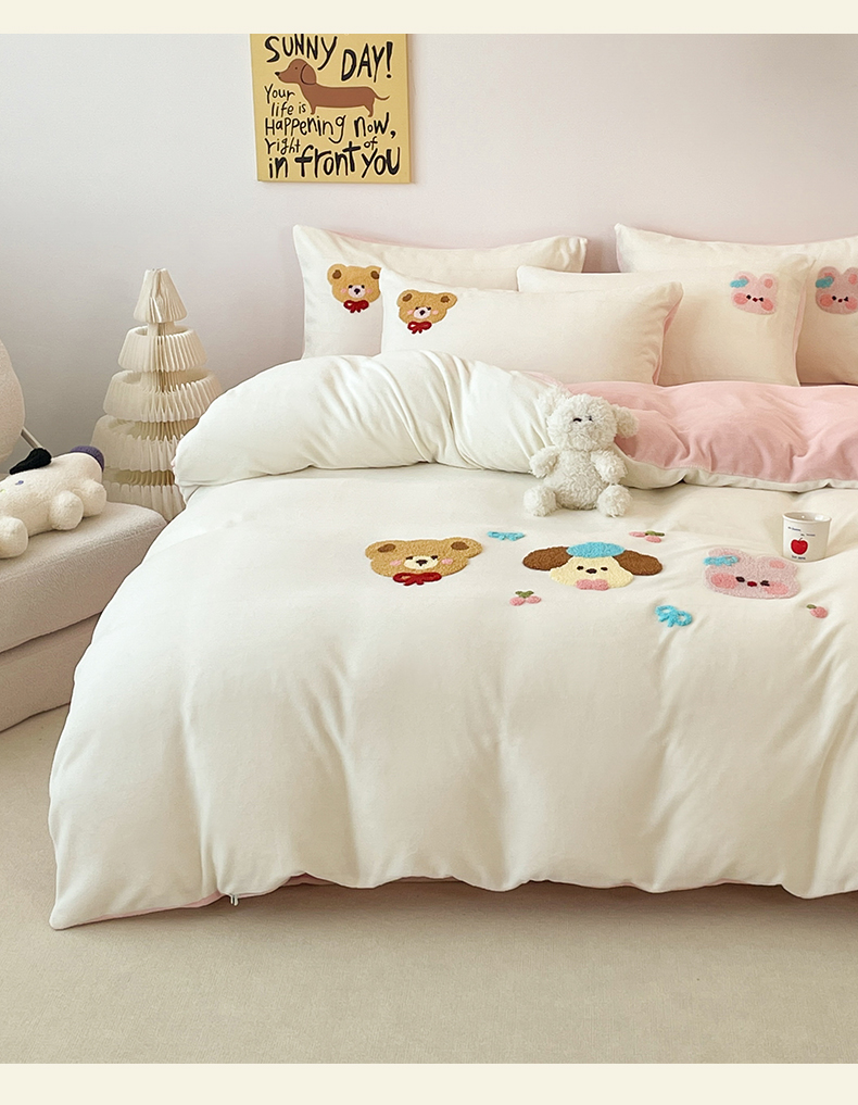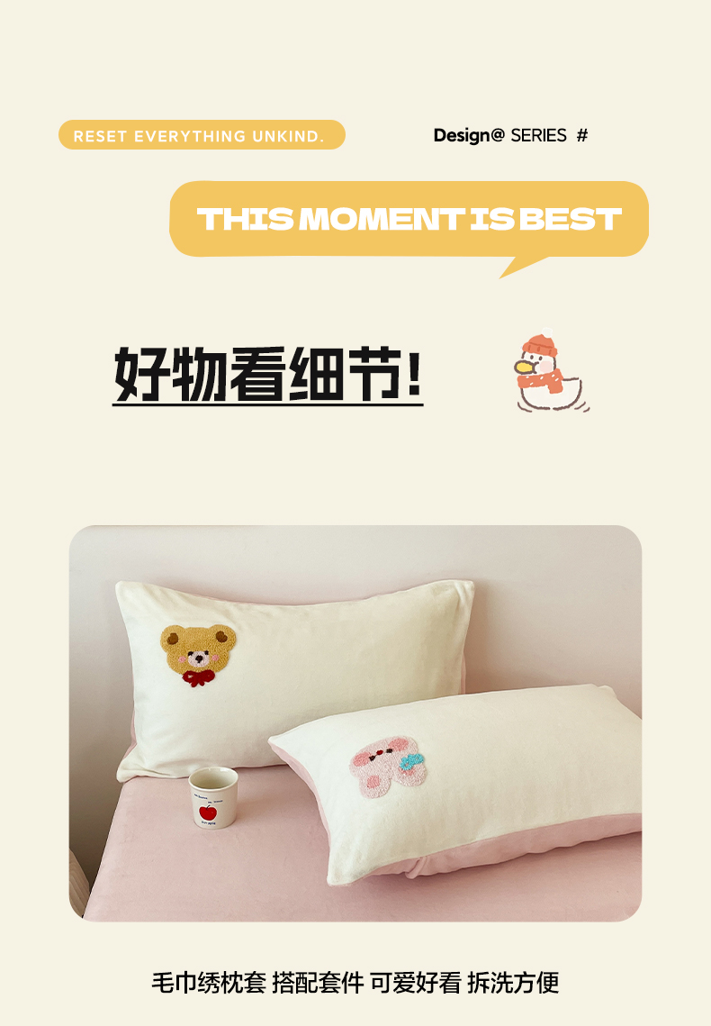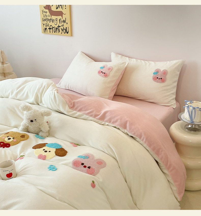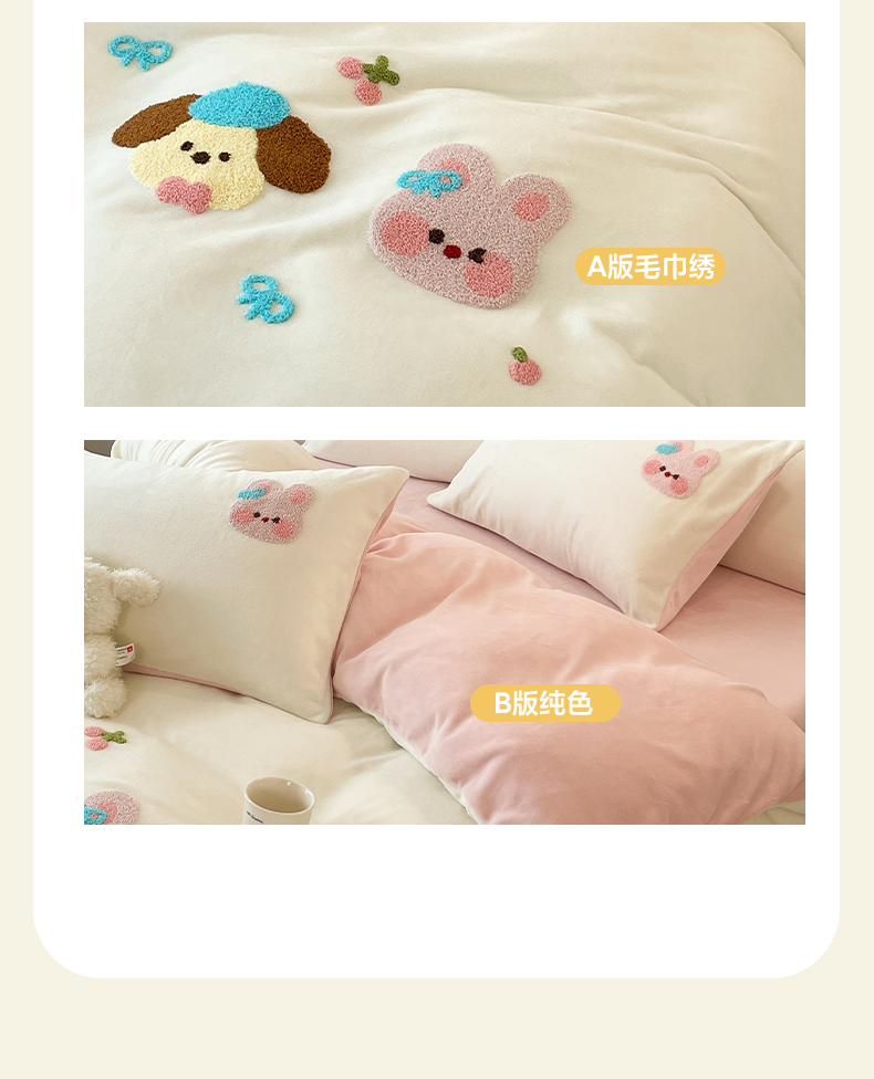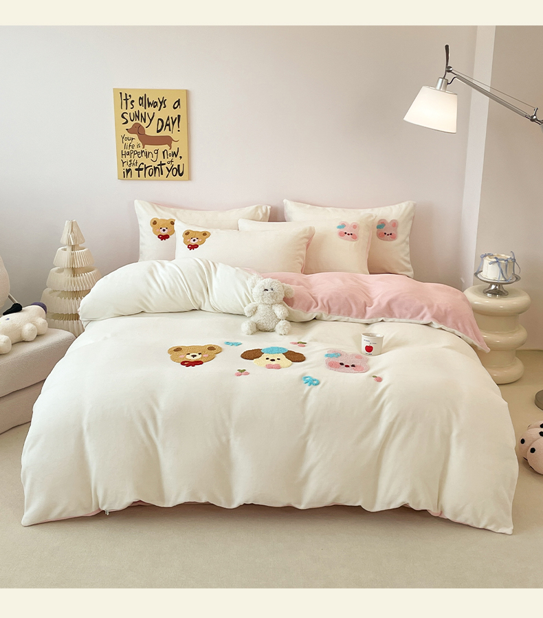 当前位置: 91家纺网 > 商品网购 > 床品套件 > 四件套 > 牛奶绒四件套 > 启发 2025新款牛奶绒毛巾绣四件套场景一 快乐萌友
