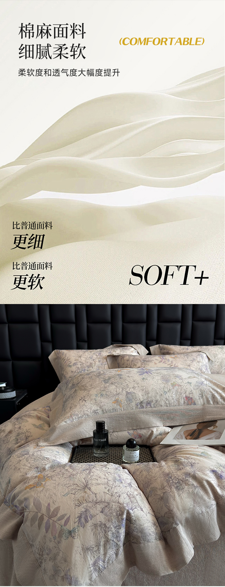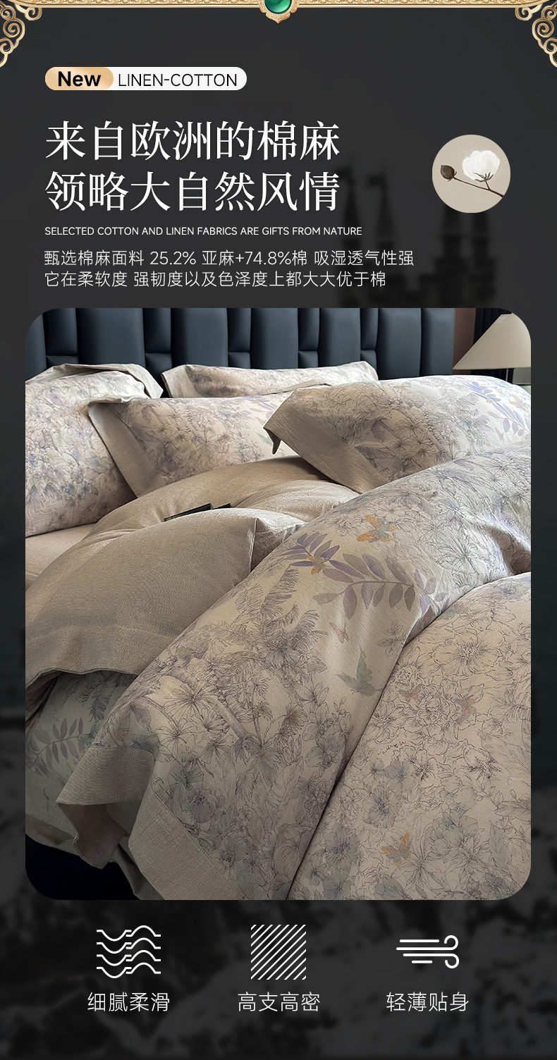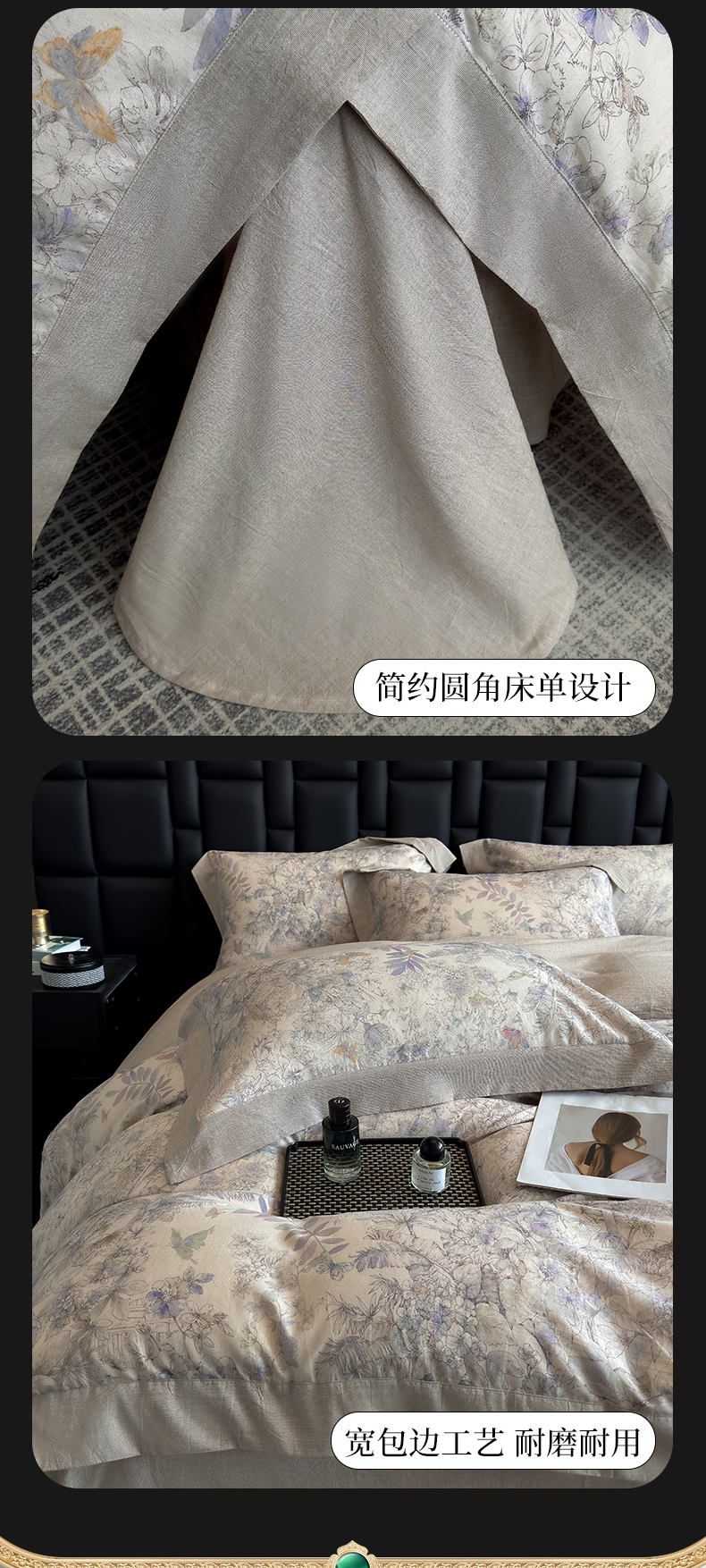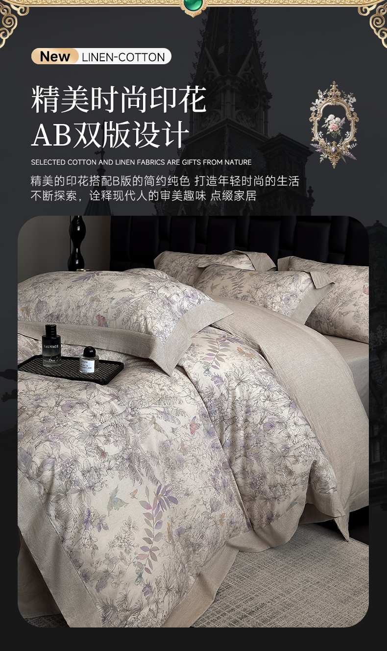当前位置: 91家纺网 > 商品网购 > 床品套件 > 四件套 > 棉麻四件套 > 家居1号 2025新款四季款活性数码印花 纯棉亚麻四件套 青逸花蝶-紫色