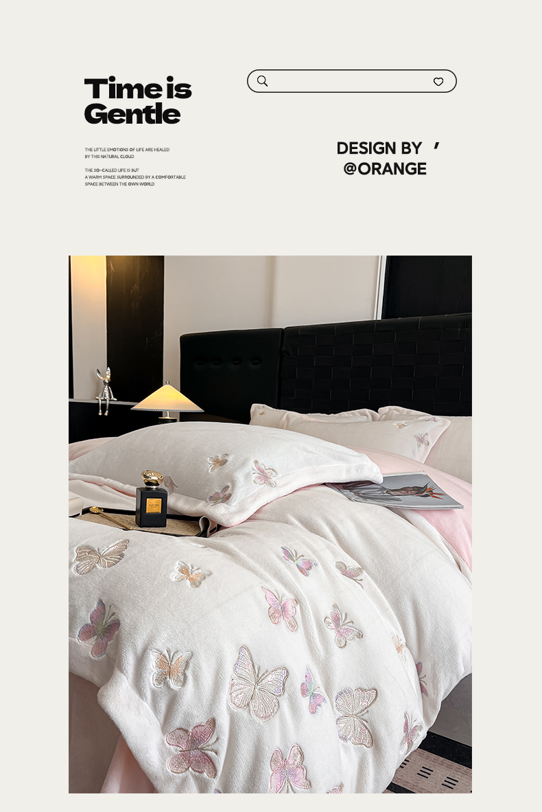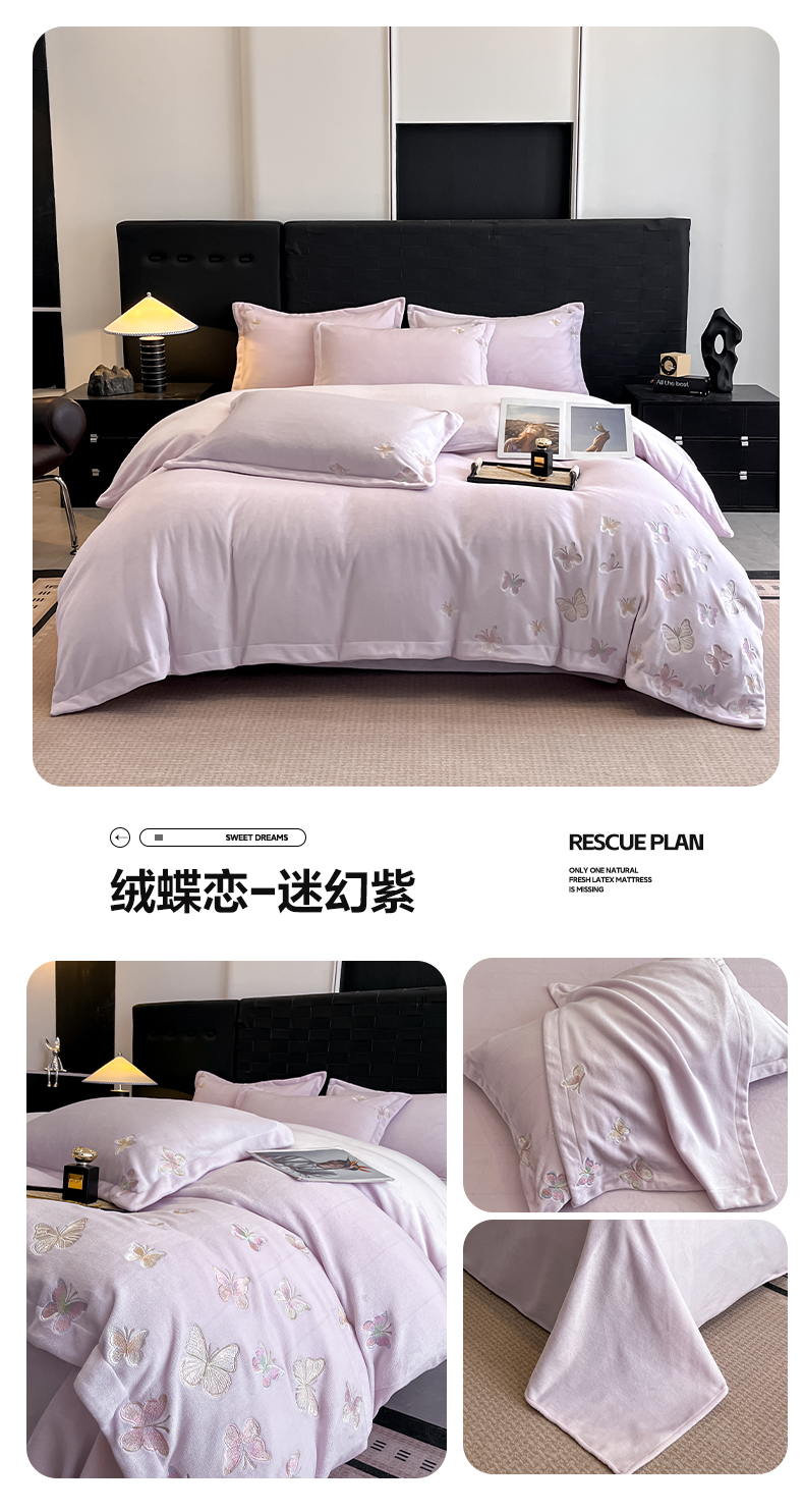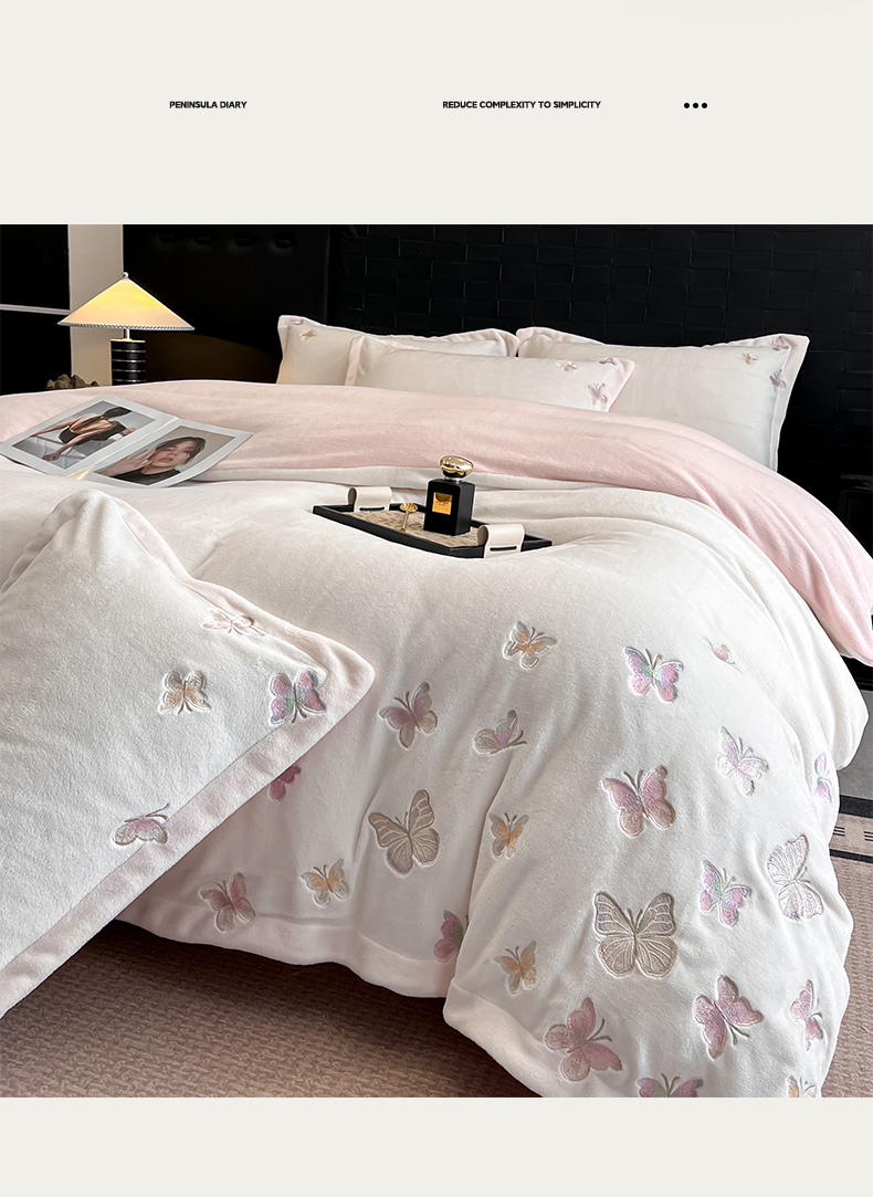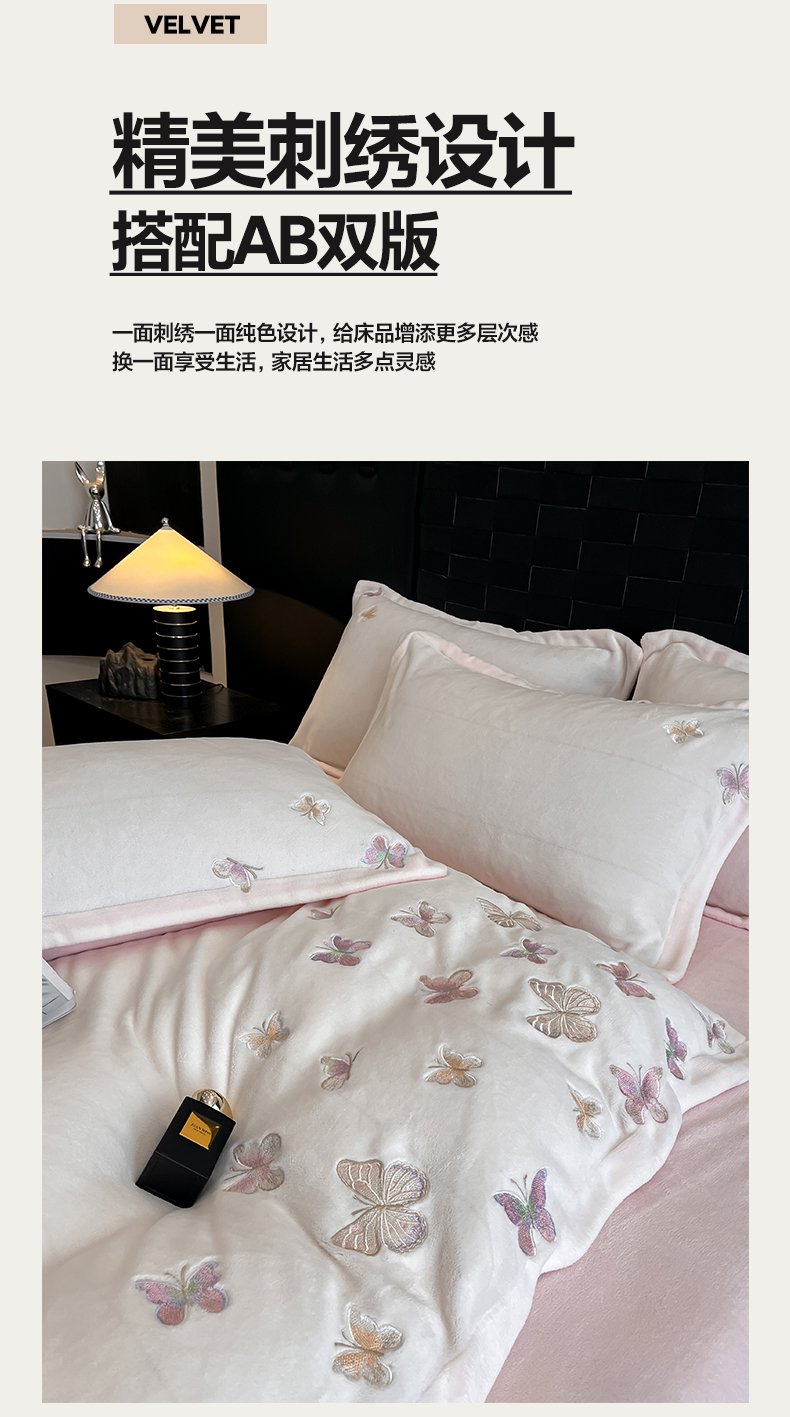逸尚阁 2025新款高克重牛奶绒刺绣四件套-绒蝶恋系列 绒蝶恋-白粉