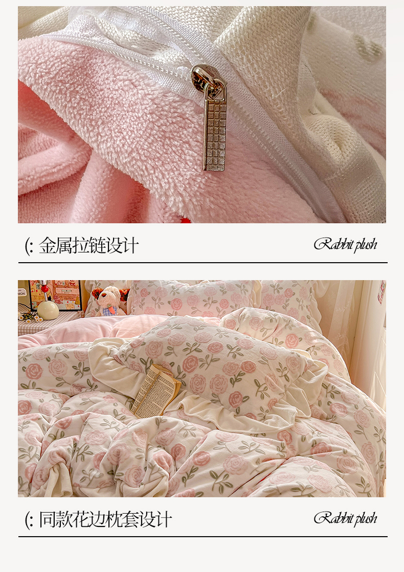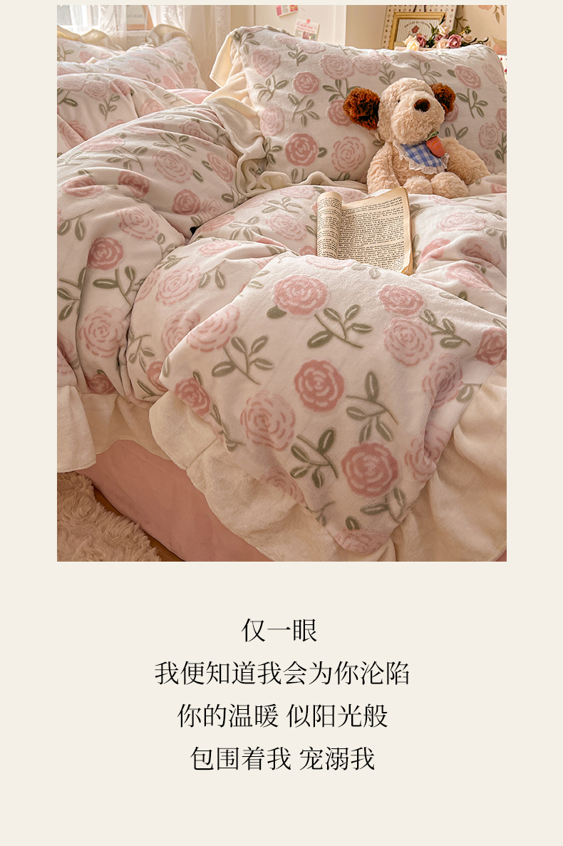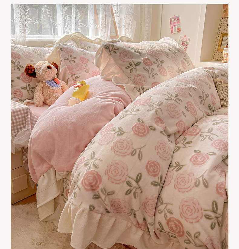 商品名称:满座家居 2025新款清新唯美木耳边加厚牛奶绒四件套雕花绒四件套 雏菊晨露 粉